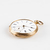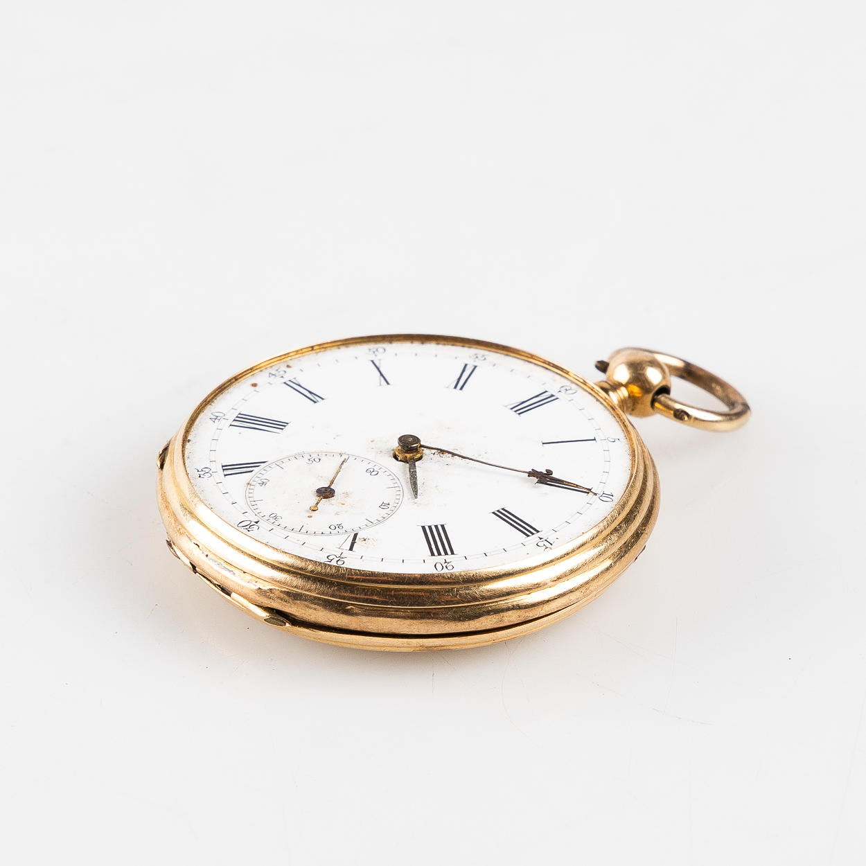 Hvid skive med romertal, subsekund. Metal indvendigt dæksel. Glas mangler. Diameter ca. 40 mm.
