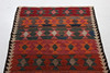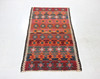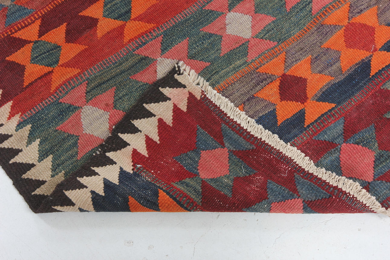 Fladvævet tæppe i uld på bomuldsvarp, traditionelt polykrom mønster.
