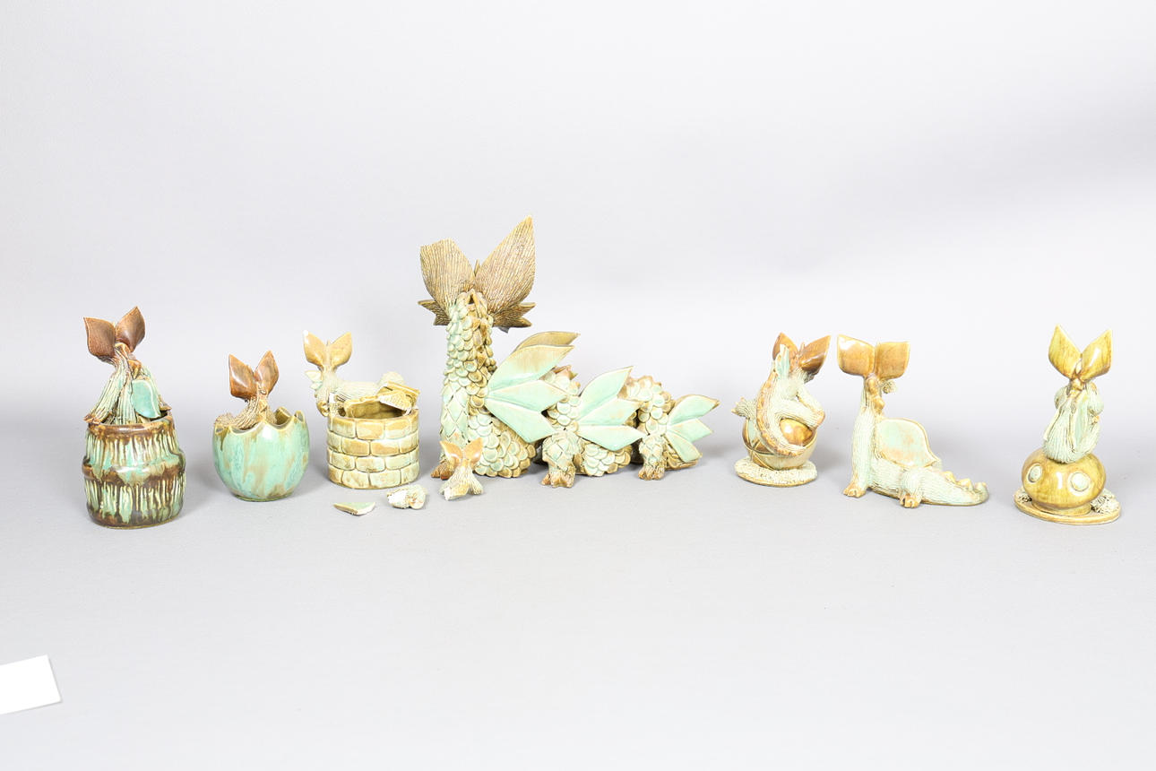 Syv keramikfigurer fra Yare studio fra midten af det 20. århundrede, alle modelleret som drager i forskellige scener, for at inkludere et stort eksempel, der måler 21 cm x 25 cm x 9 cm. (7).