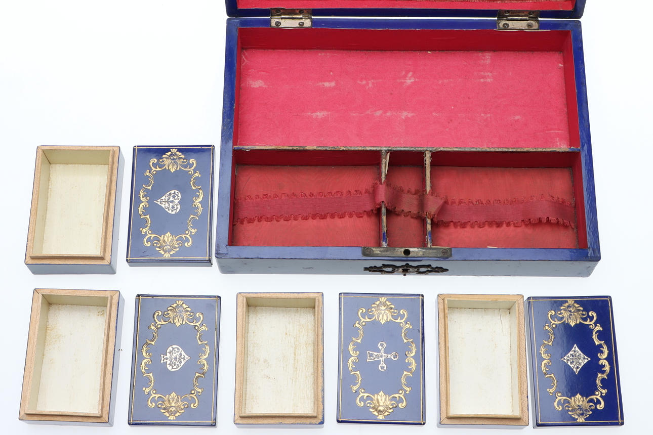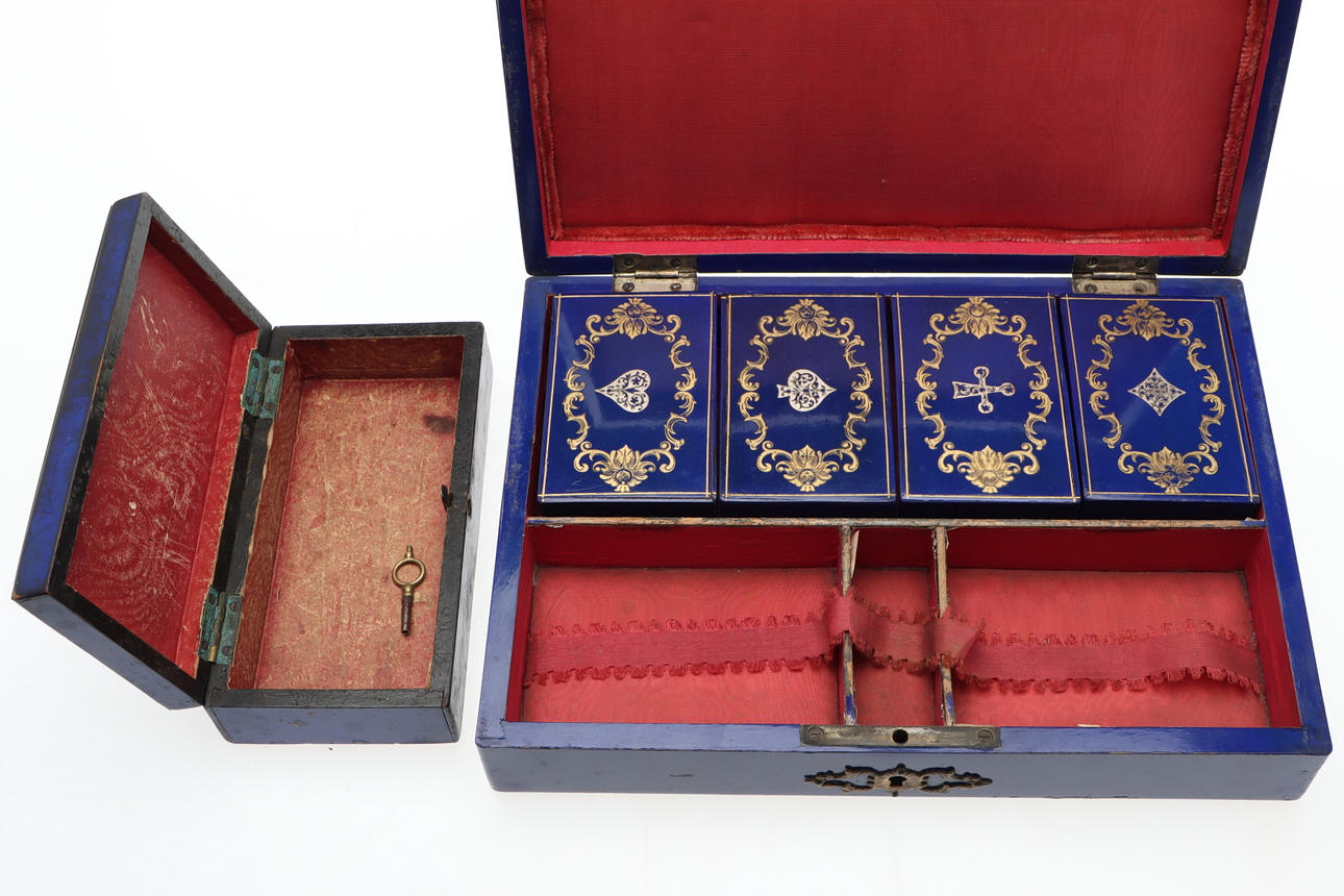 Spilletull, indvendige kasser til kortspil, tekstilbeklædt indvendigt, mål ca. 18x25x6 cm