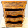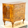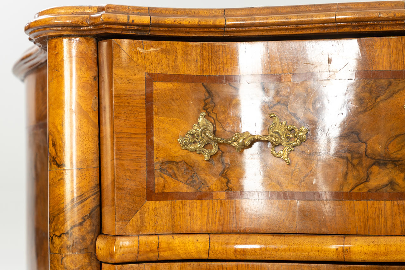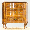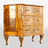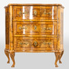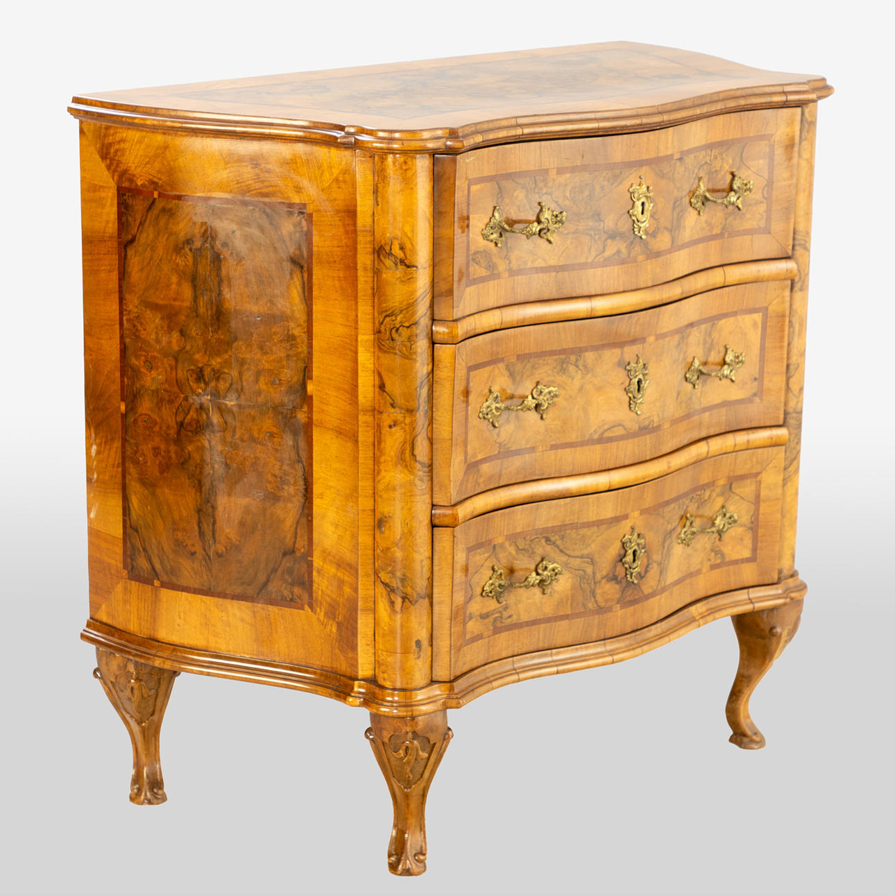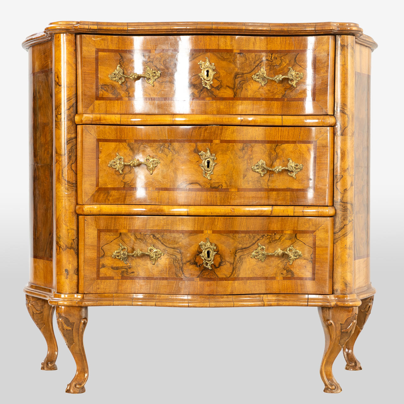 Valnød, delvist skåret. Buede ben, vegetabilske snitelementer på knæene. Rektangulær krop med buede sider og omkranset af afrundede pilastre. Den lige front er delt af tre skuffer mellem perleformede spær. Finérpaneler indrammet på alle sider. Profilramme og let fremspringende topplade. Stiltypiske messingbeslag. HxBxD: ca. 88 x 94 x 45 cm.