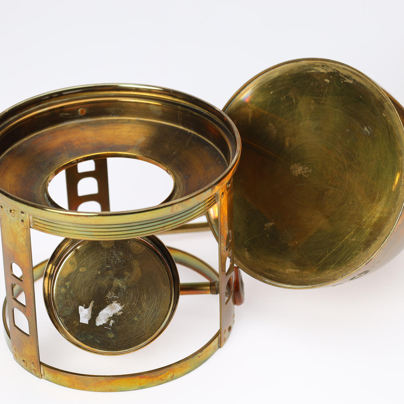 Alders- og brugsspor, herunder ridser, mærker, anløbninger og skævheder. En varmeopsats fremstår med manglende og revnet glasstykke. Der gives ingen funktionsgaranti.
