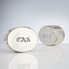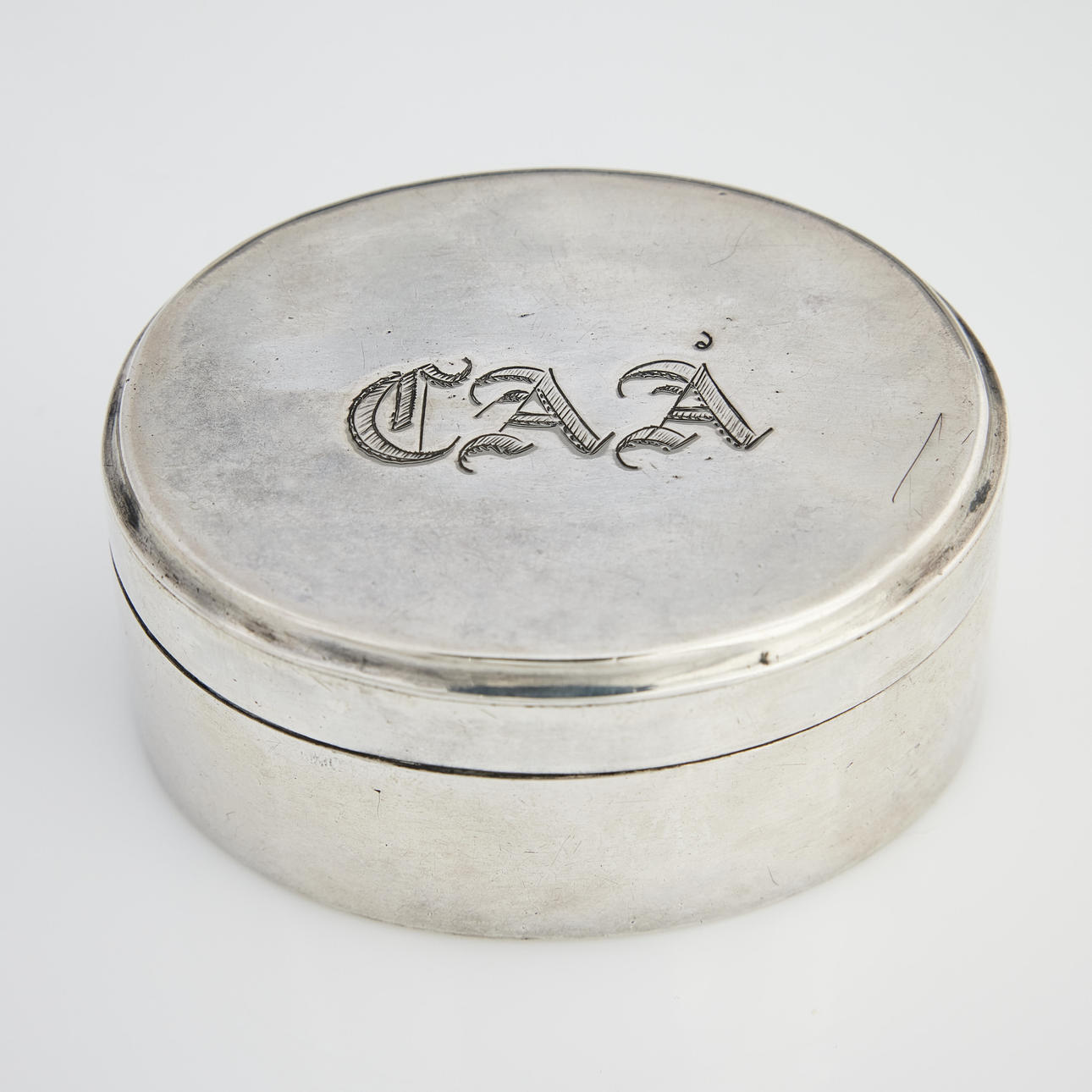 Indvendigt forgyldt, oval, glat med skrå kant omkring låget, monogrammet. Længde 6,5 cm, højde 3 cm, vægt 115 gram.