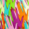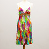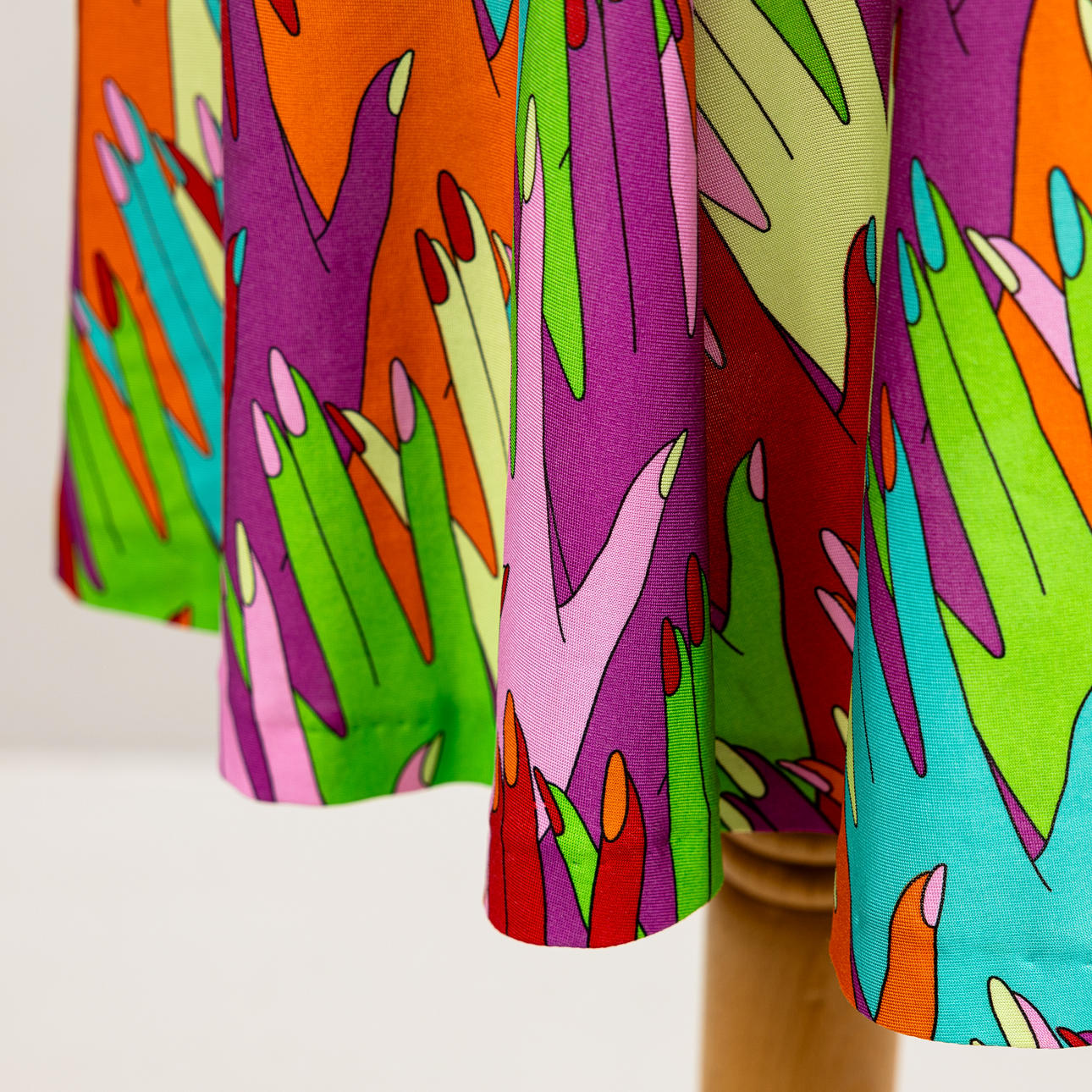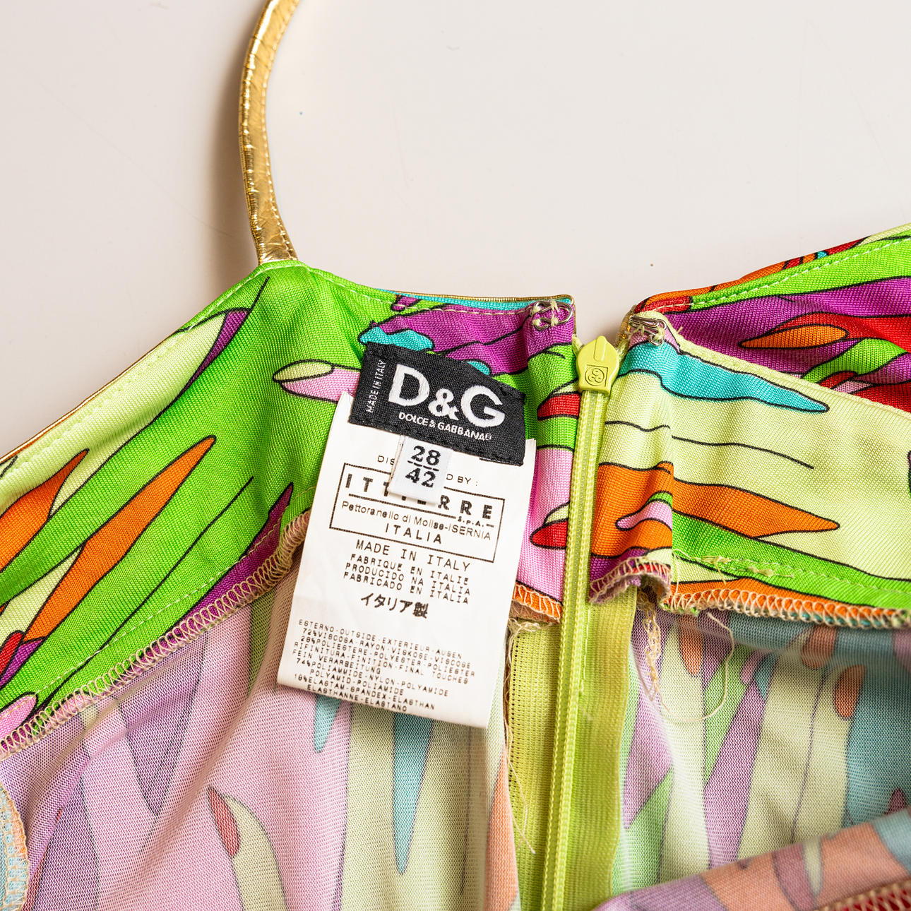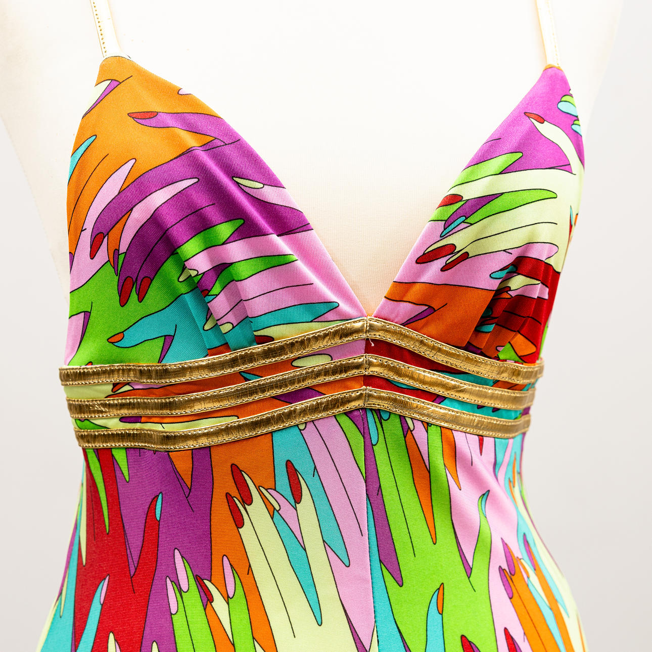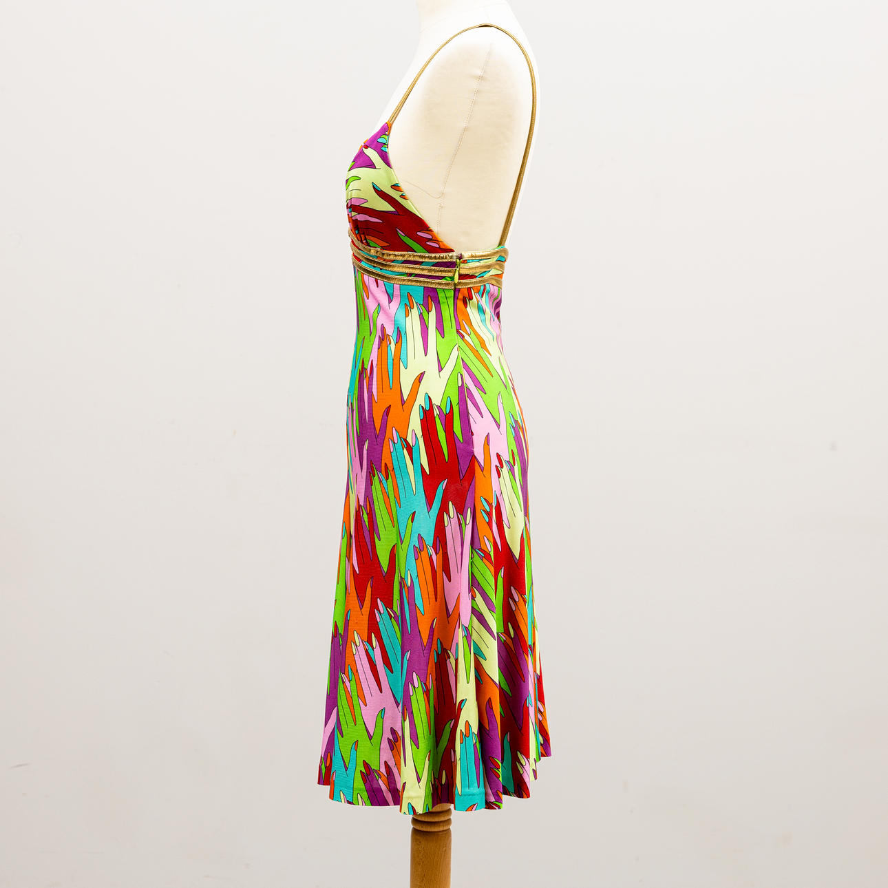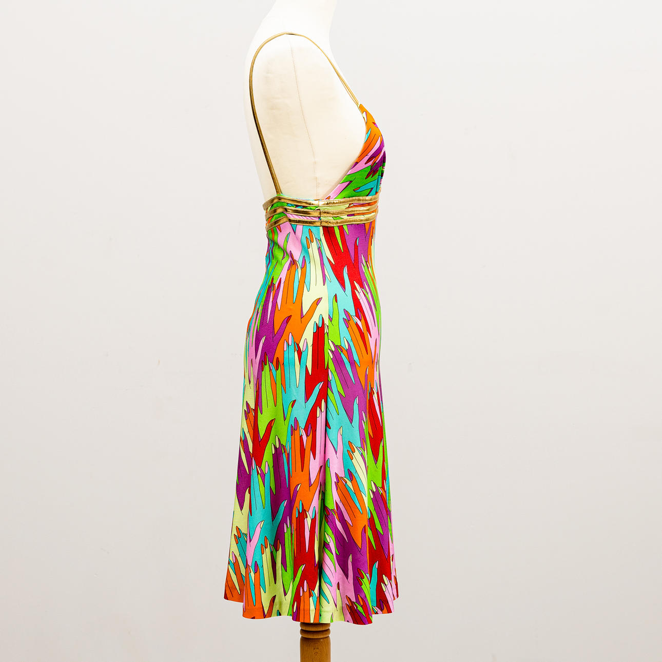 Stoffet med håndmotiver i forskellige farver, skulderstropper i guldfarvet stof, lynlås i siden, længde ca. 98 og brystbredde 69 cm.