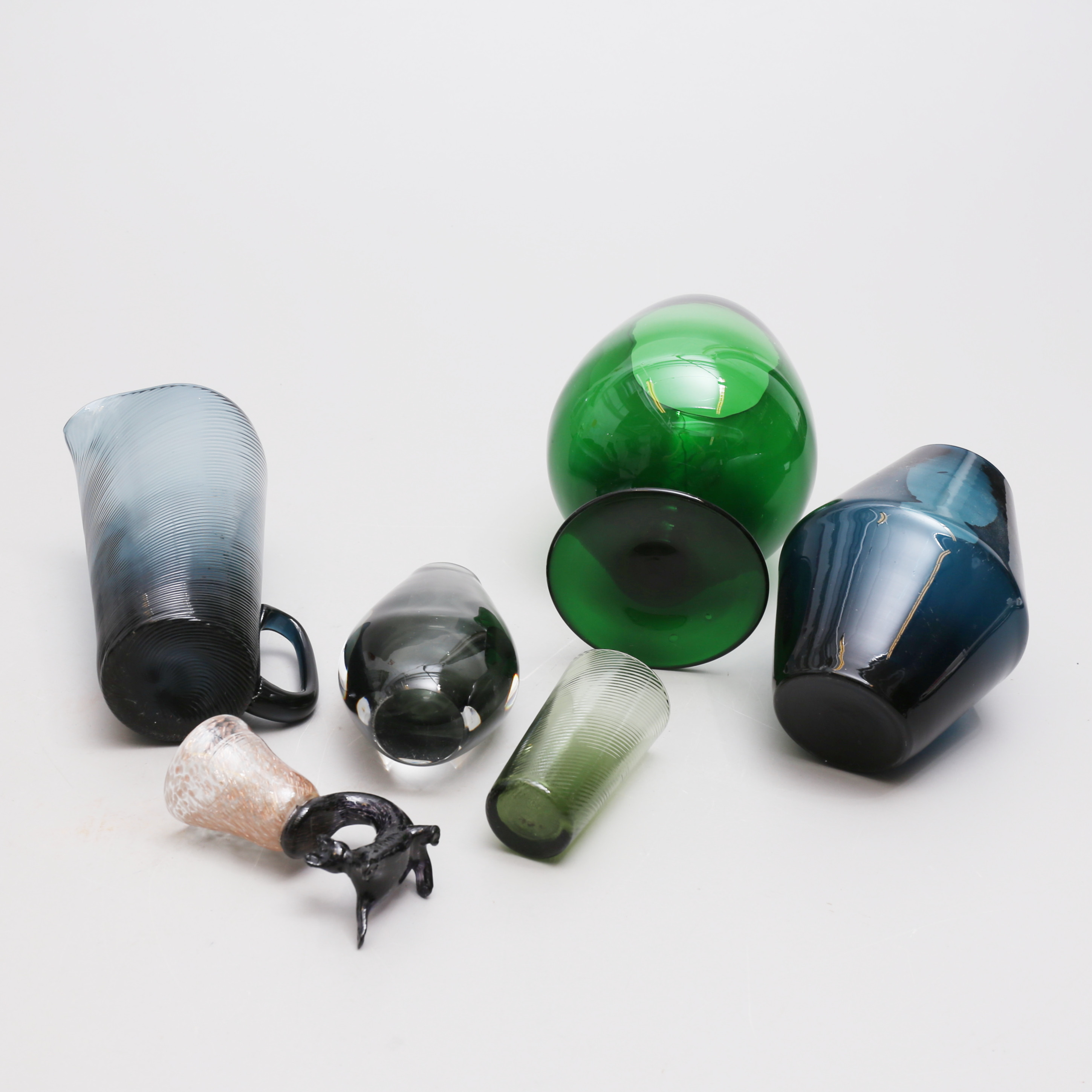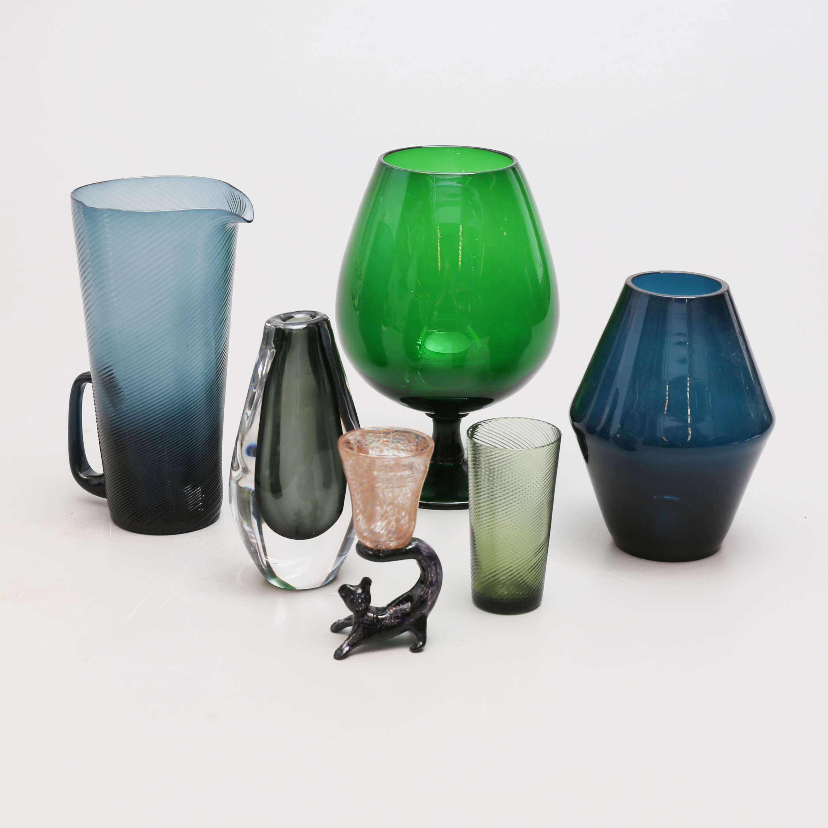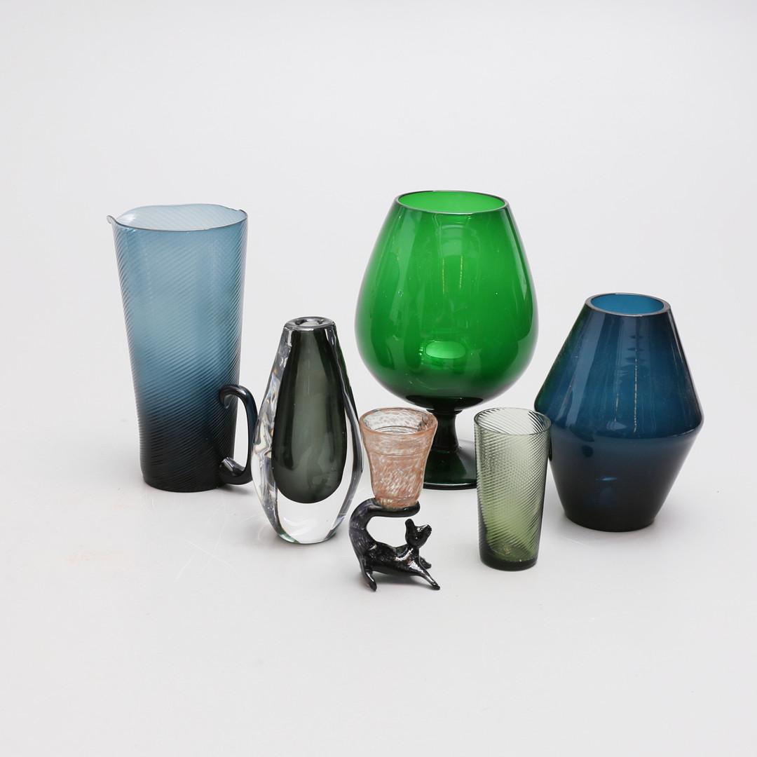4271024. Et sæt af 6 farvede glasgenstande.