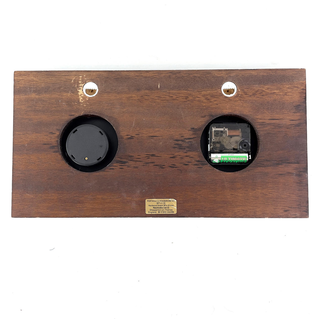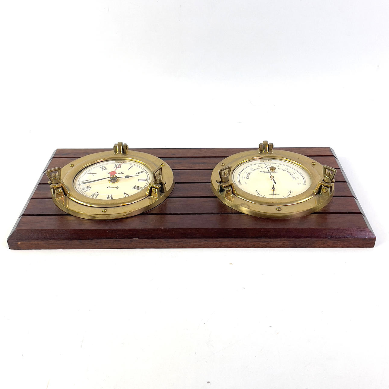 Skibsur og barometer monteret på bejdset træplade. Mærket „Nauticalia Ltd“.