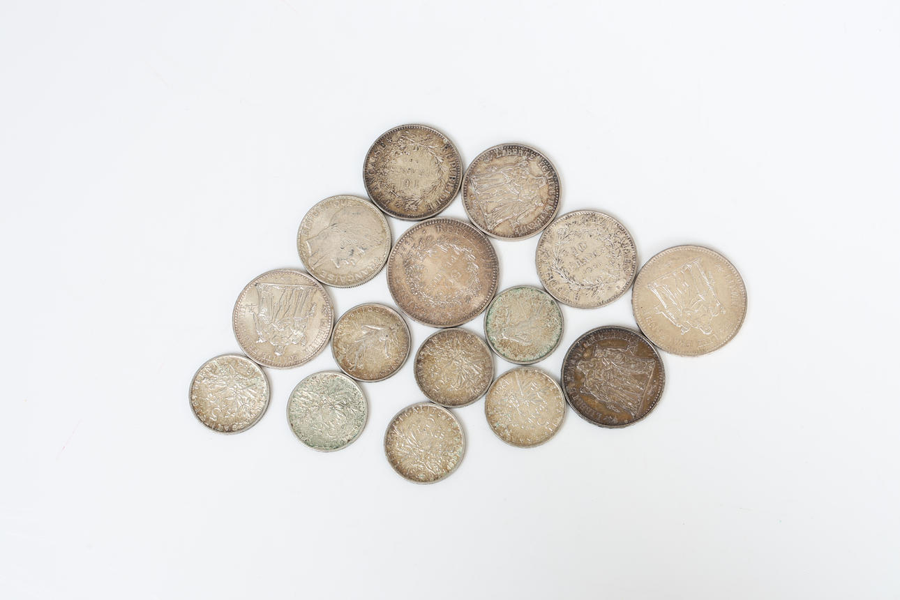Herunder to 50 franc-mønter dateret 1977 og 1979, fem 10 Francs mønter dateret 3 x 1965, 1966 og 1972, syv 5 francs mønter dateret 1960, 1961, 1962, 1963, 1964, 1965 og 1966 sammen med en 20 francs mønt dateret 1933. 15 mønter i alt 290 gram.