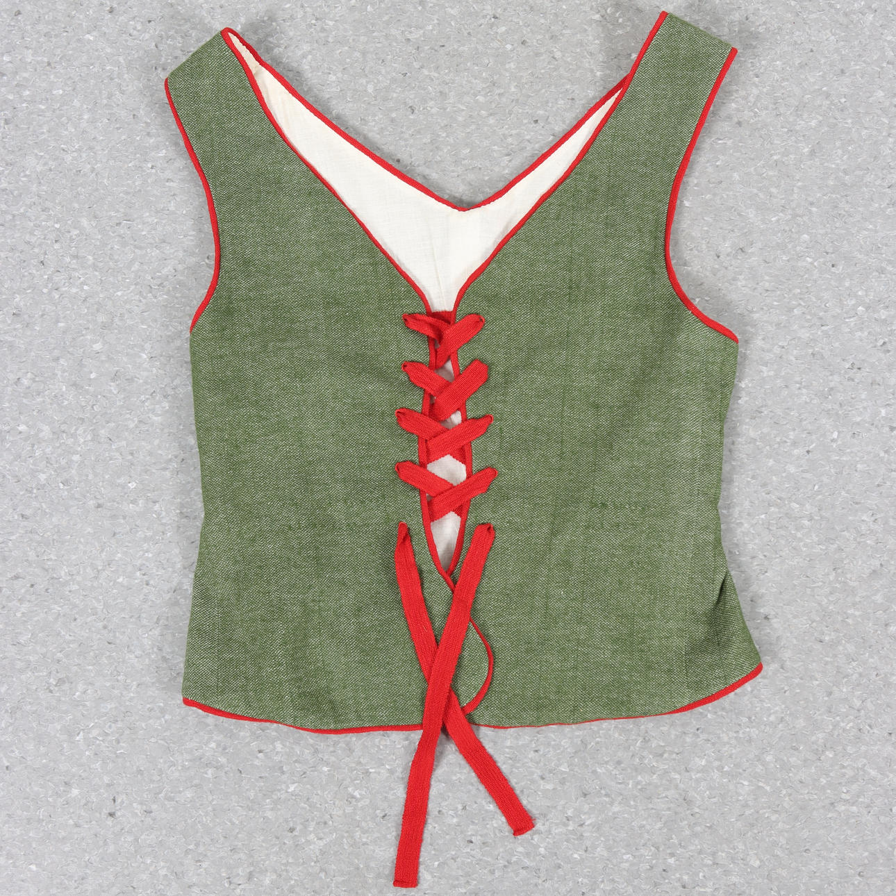 Sjal, vest, nederdel, hætteforklæde og skjorte, størrelse medium (40/42).