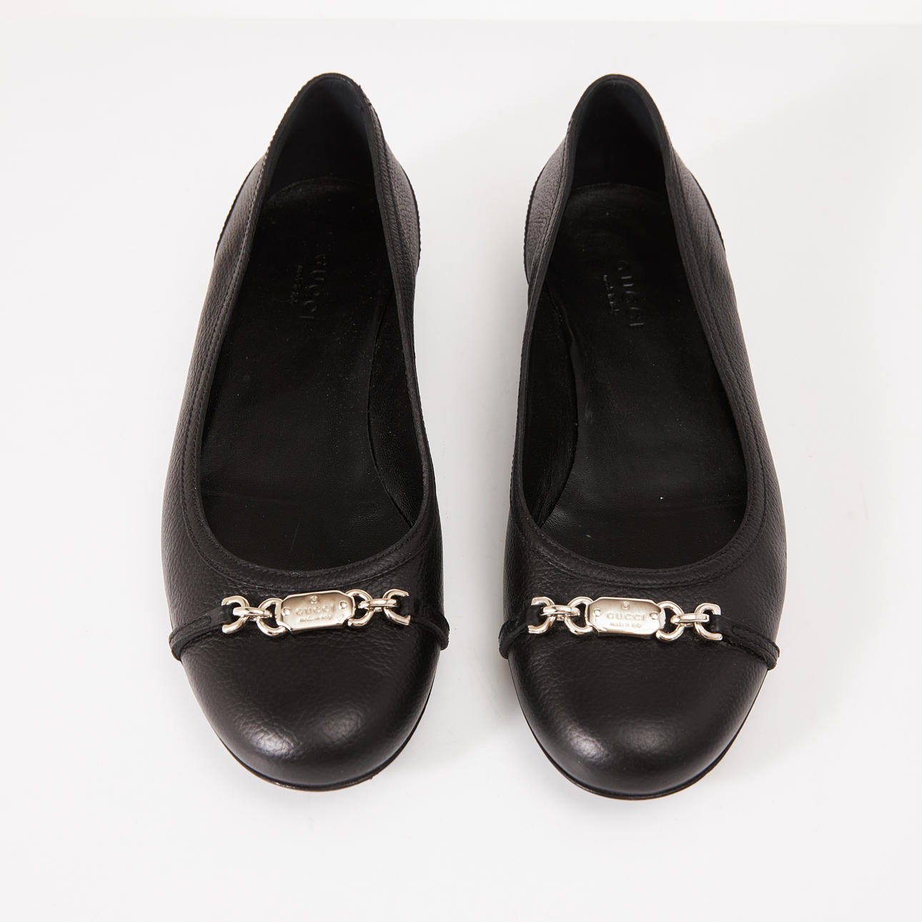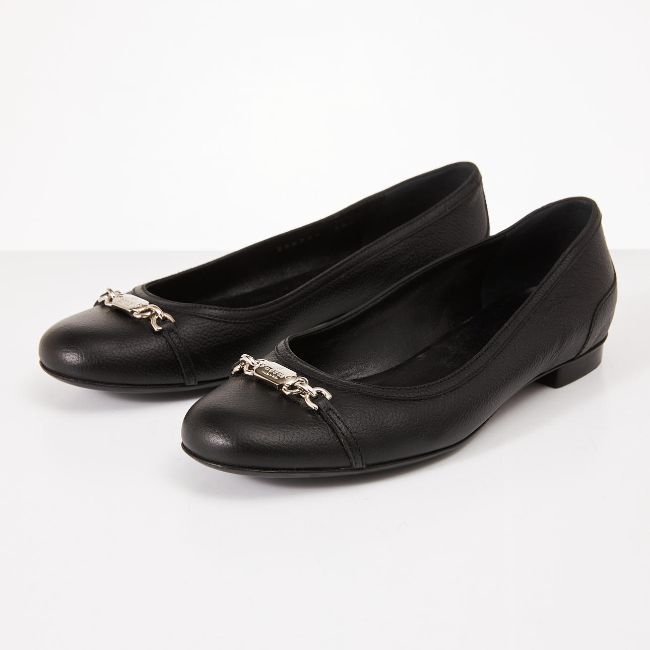 I sort præget læder, front med spænde i hvidt metal, mærket „Gucci made in Italy“, medfølger skopose og karton, str. 36 1/2, karton ca. 11, 32 x 14 cm.