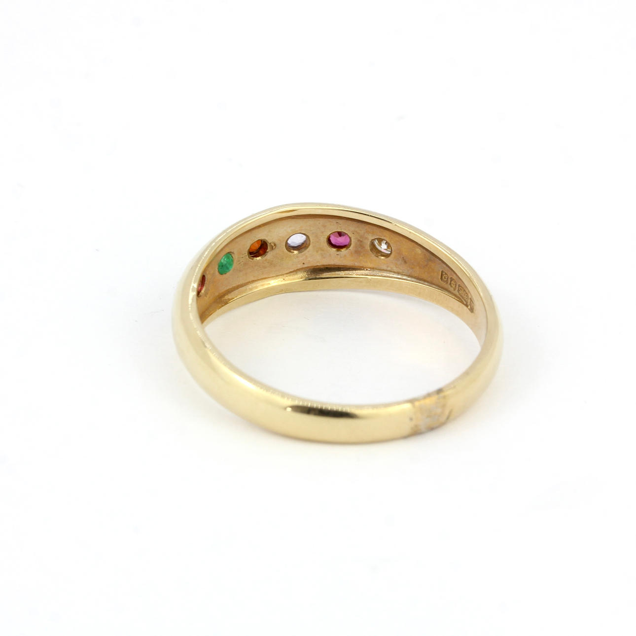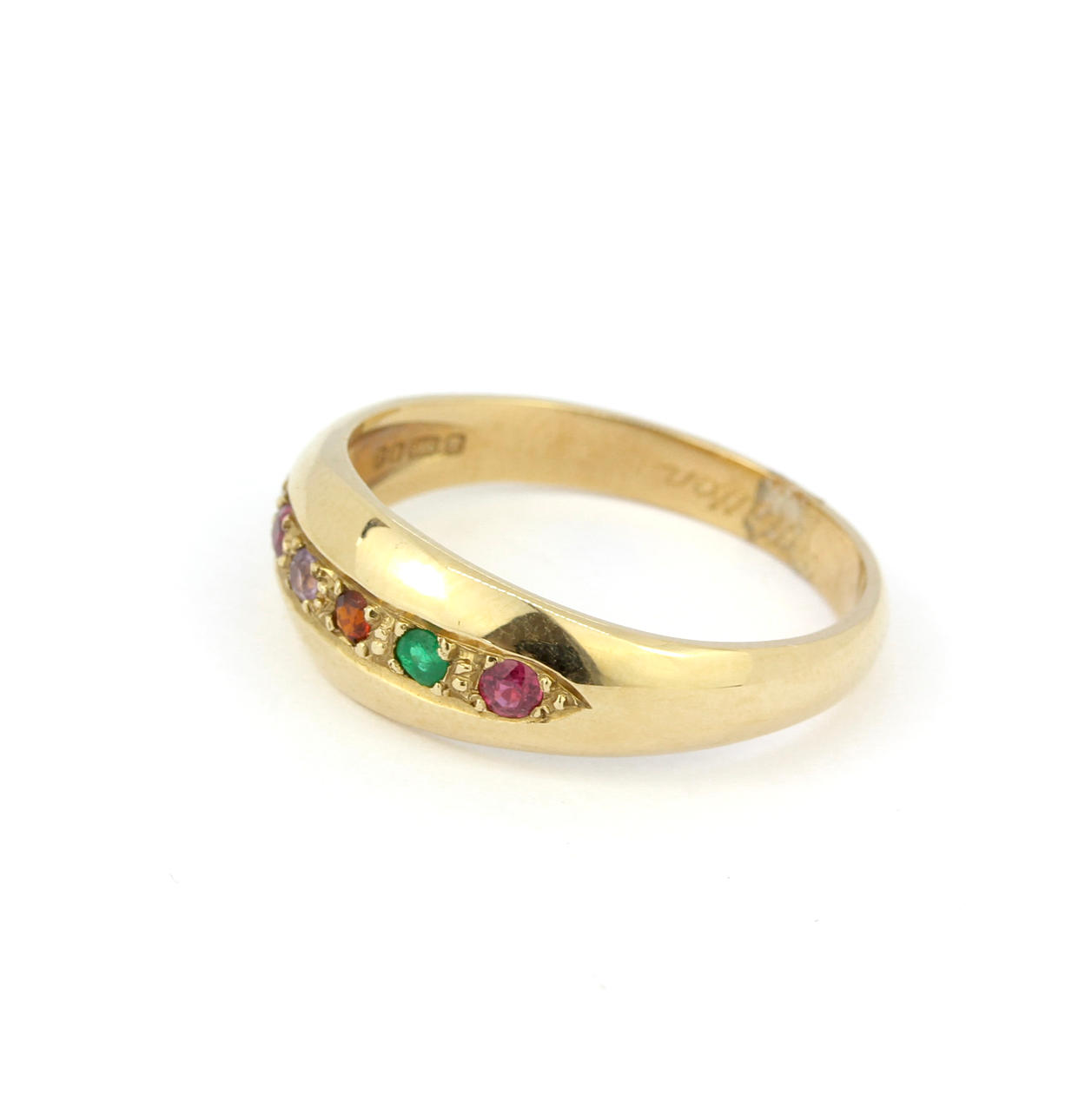 En 9 karat guldringe med sten inkluderet: rubiner, smaragd, ametyst og diamant. UK ringstørrelse: U. Samlet vægt: 4,3 g.