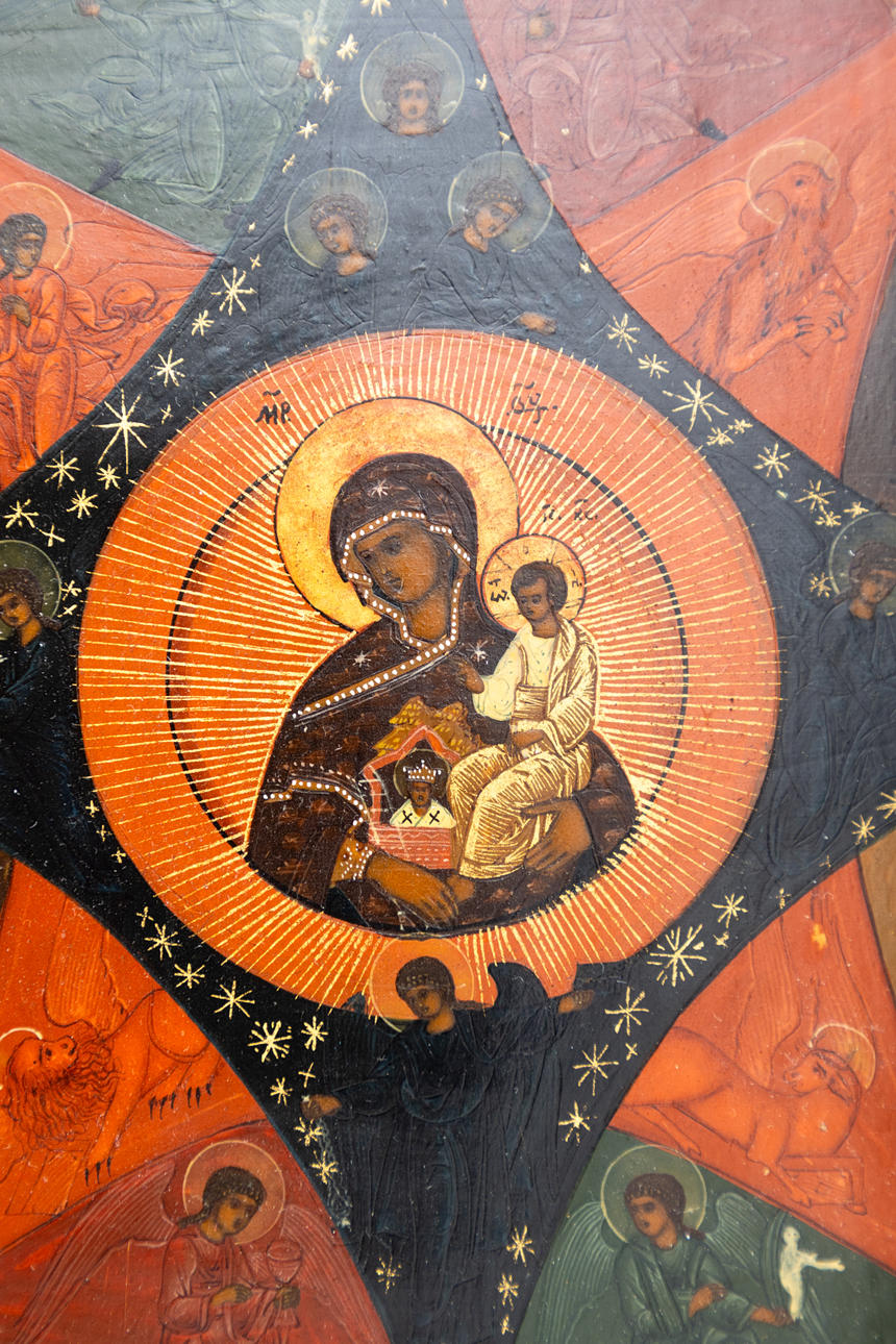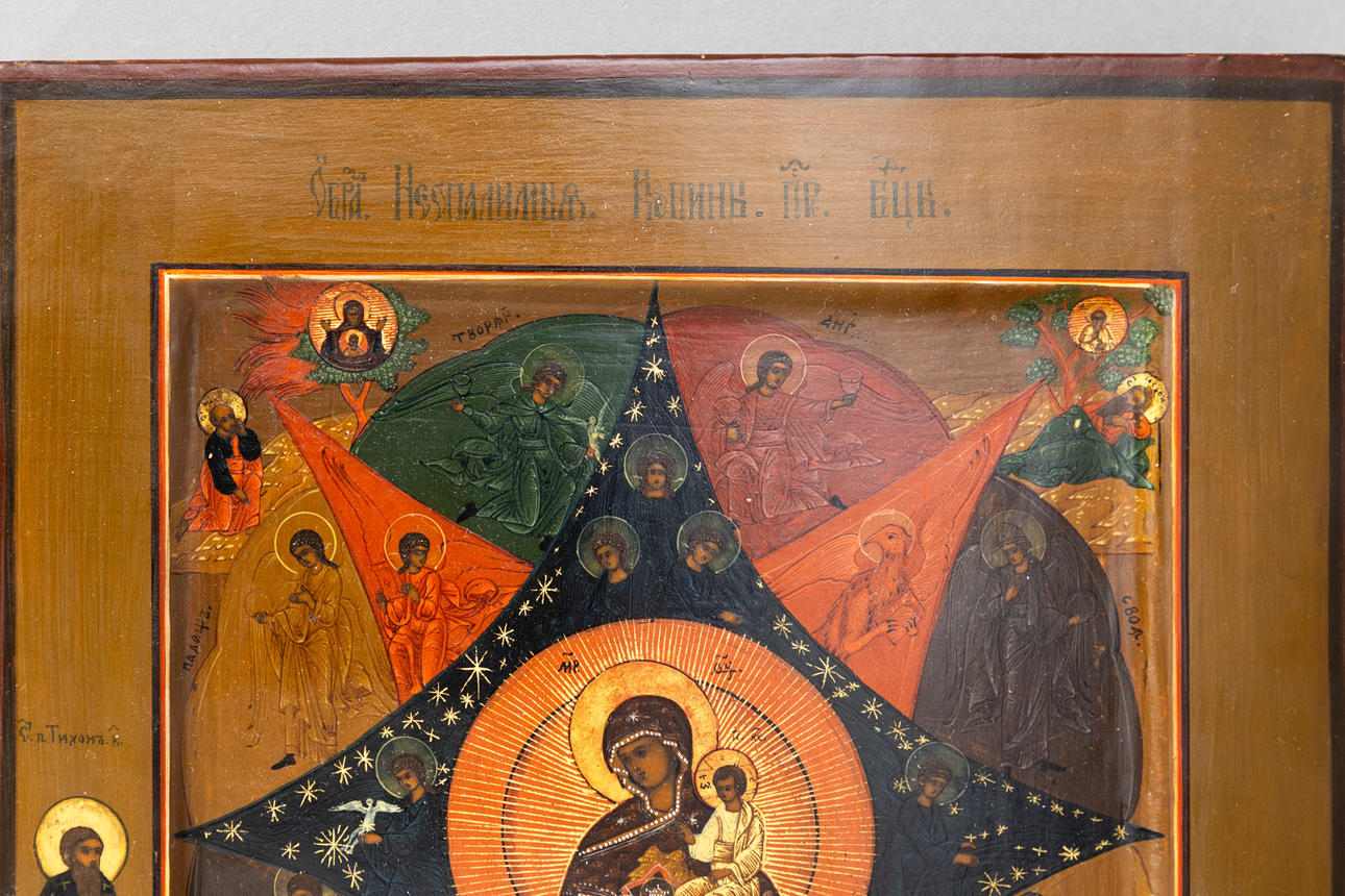 Historien om den ubrændbare busk kommer fra Det Gamle Testamente: en engel talte til Moses fra busken og profeterede Marias jomfruelighed. I den 16. Jh. Russisk ikonmaleri udviklede et komplekst motiv til dette formål: Guds Moder med barnet i midten af en stjerne dannet af to konkave firkanter, der er omgivet af en otte-pass-roset. De enkelte billedfelter skildrer evangelistsymboler og engle; hjørnerne skildrer fire historier fra Det Gamle Testamente, som forstås som bibelske profetier om Marias jomfruelighed. Til venstre med en anden marginal helgen (St. Tikhon).