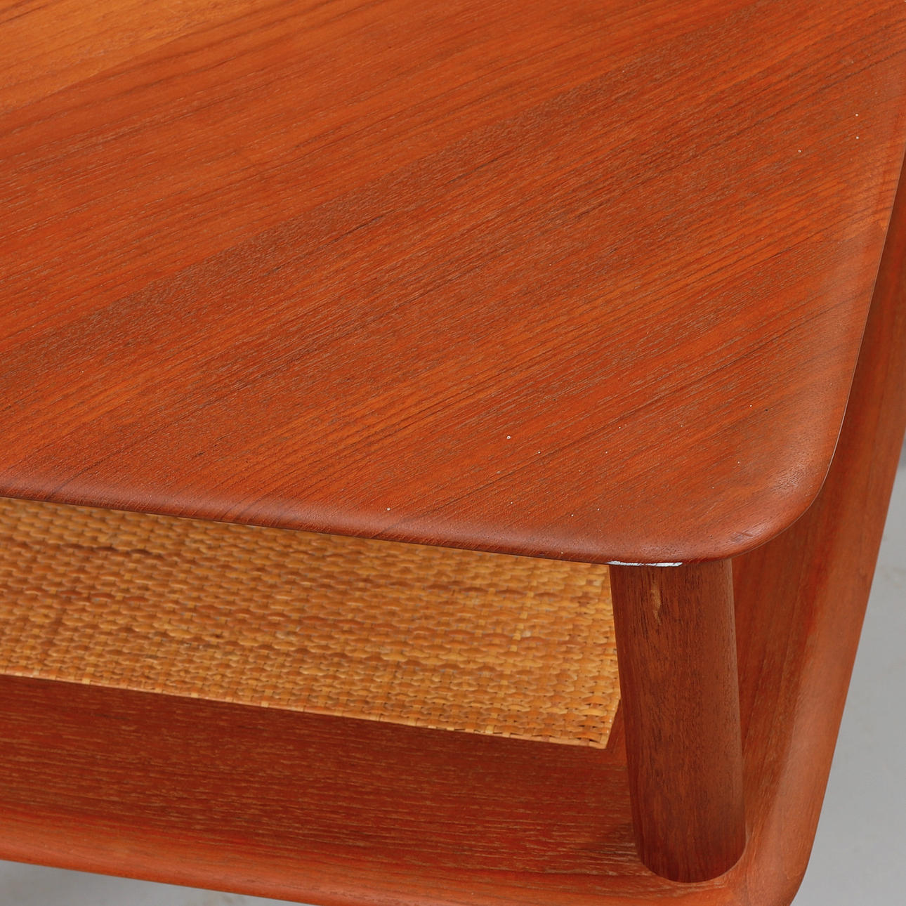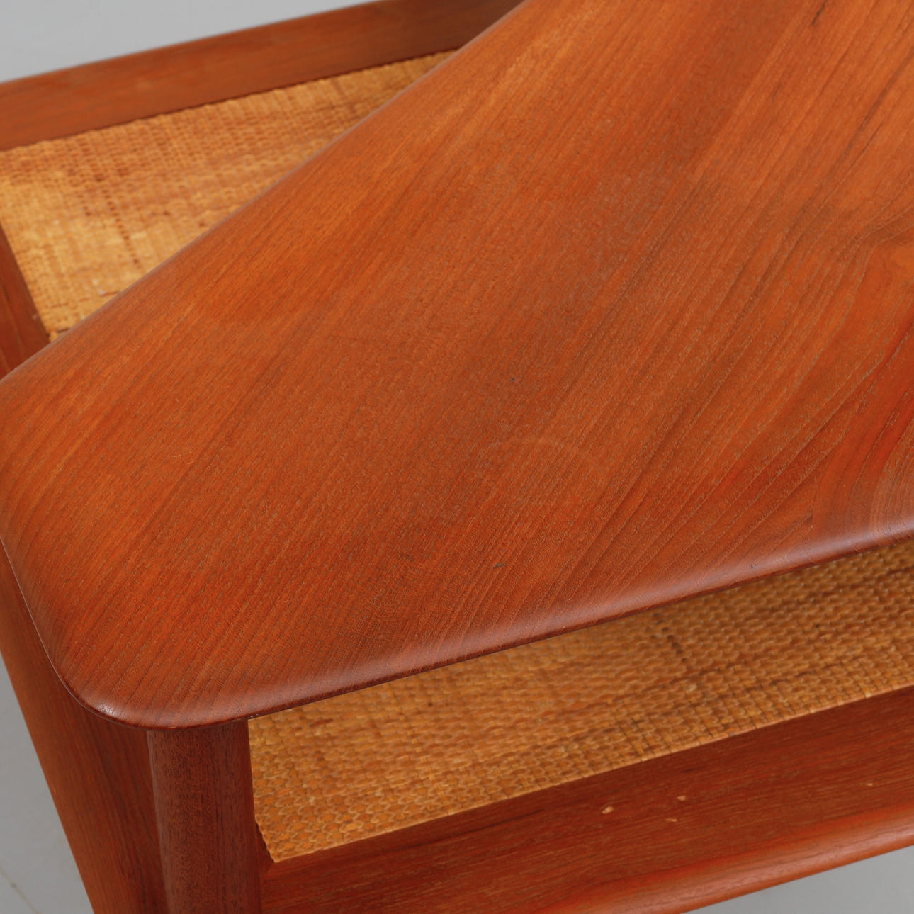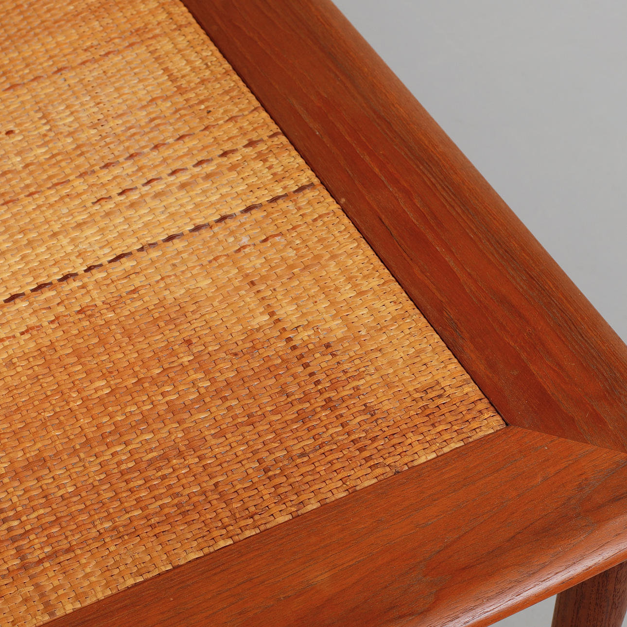 Ramme i teak. To sofaer, længde 125 - 185, dybde 78, højde 78, sædehøjde 42 cm. Bord, længde 73, bredde 74, højde 84 cm.