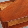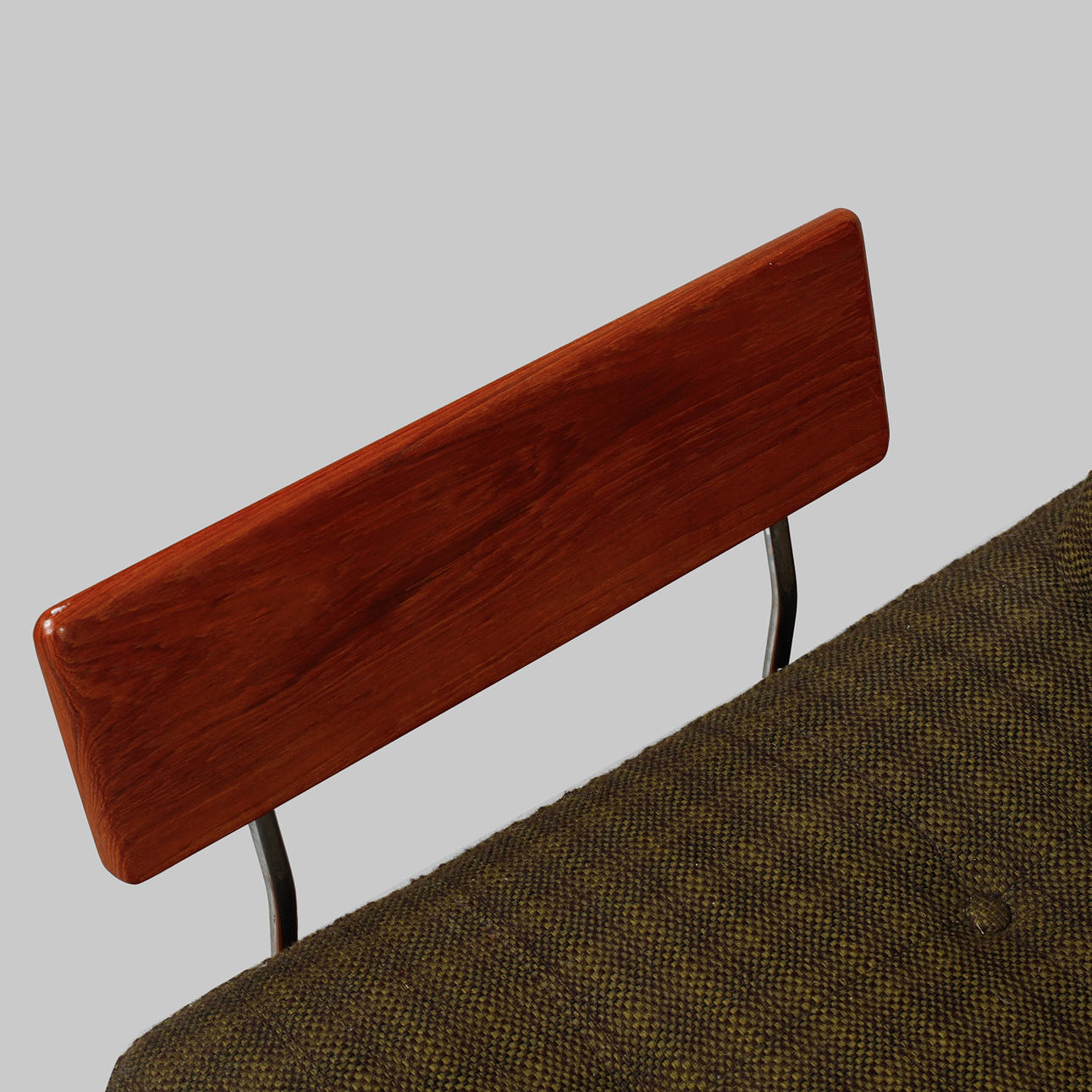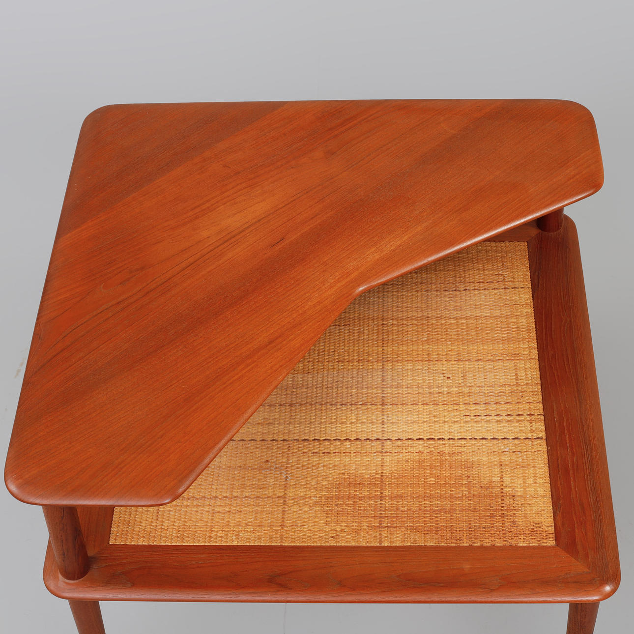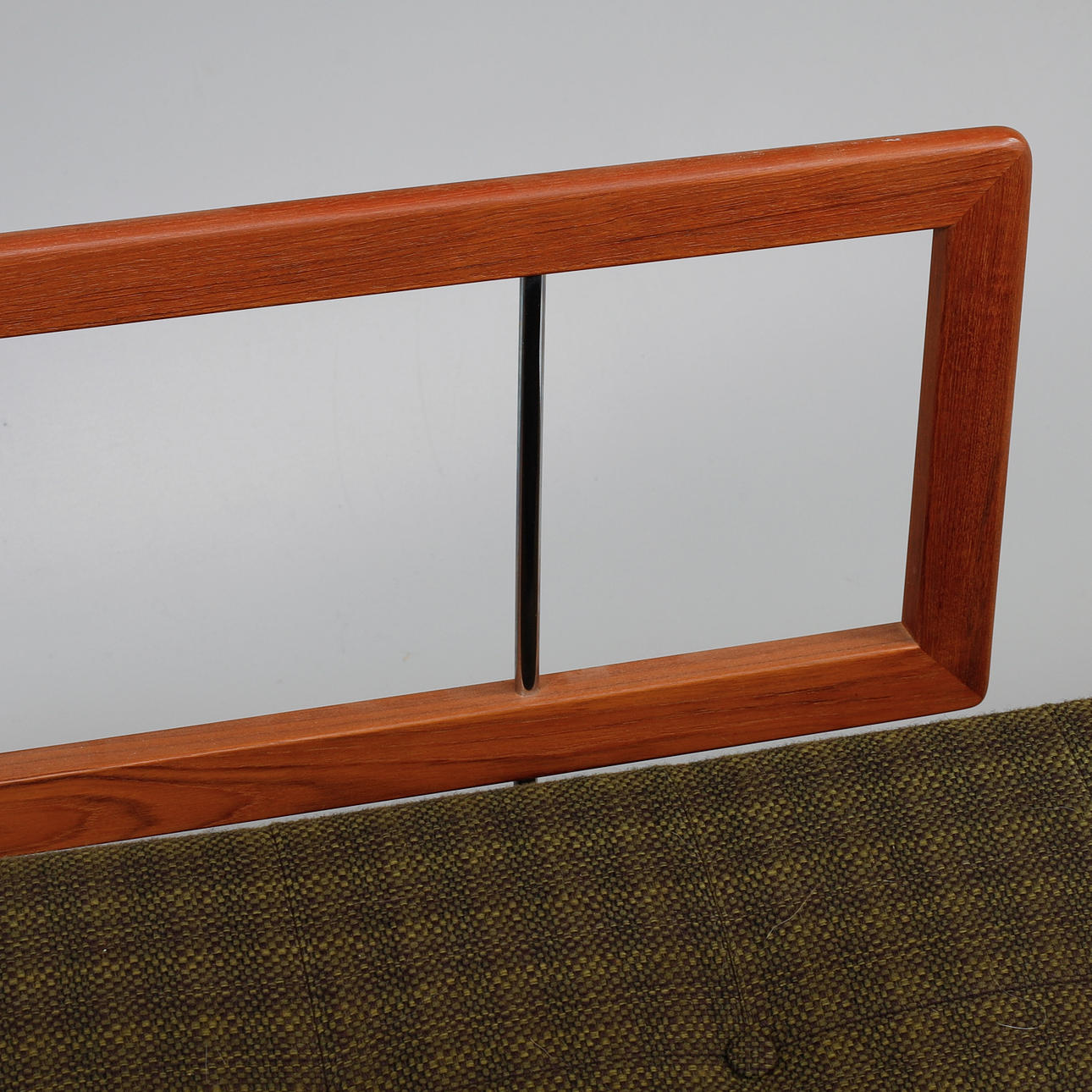 Ramme i teak. To sofaer, længde 125 - 185, dybde 78, højde 78, sædehøjde 42 cm. Bord, længde 73, bredde 74, højde 84 cm.