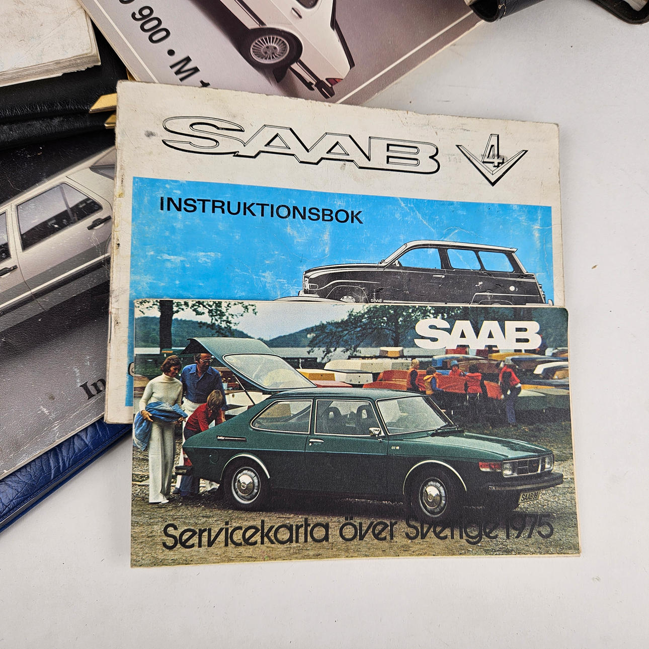 Blandt andet Saab 900, V4, 900/9000. Reparationsvejledning, ca. 30x22 cm.