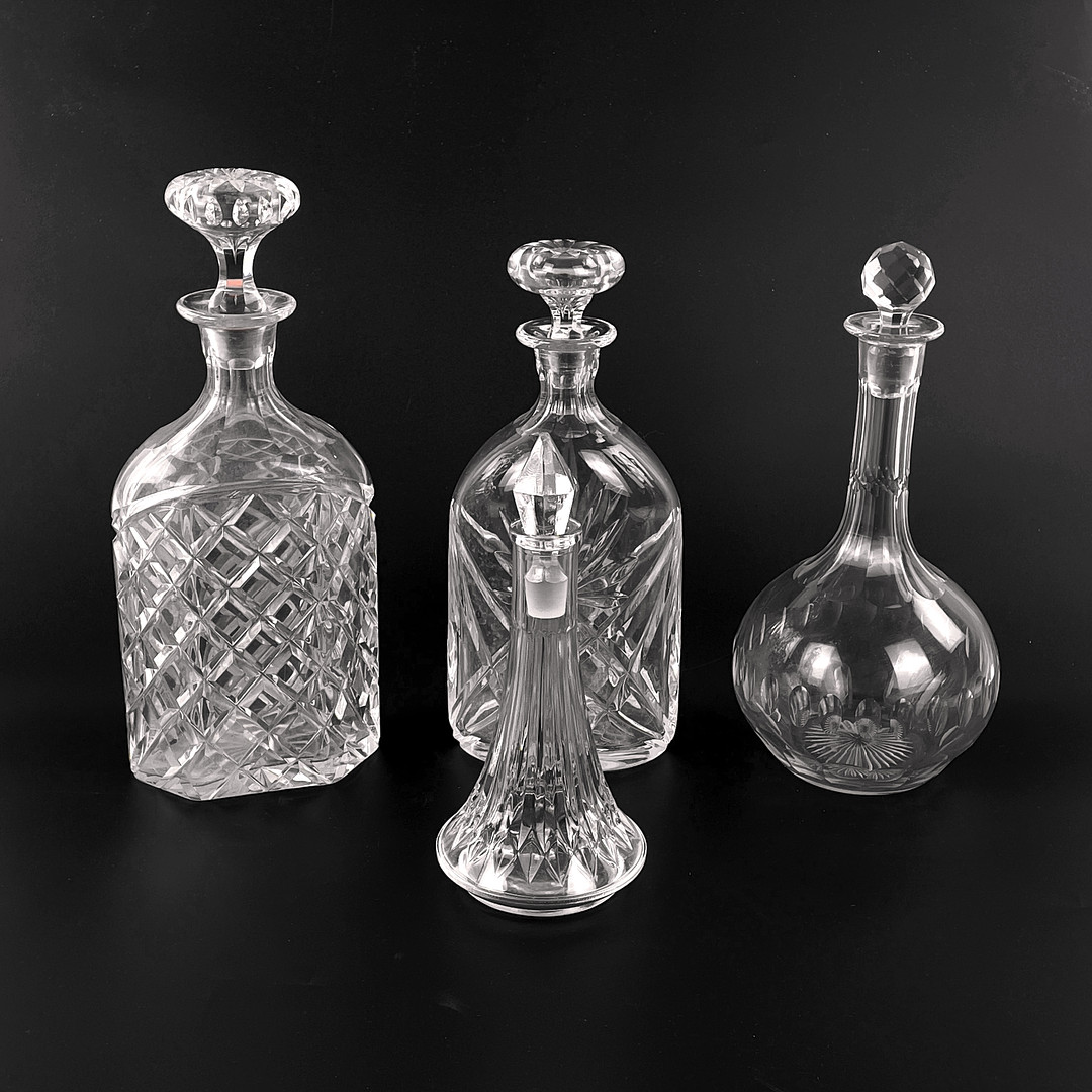 4285657. KARAFFER. 4 stk, dekorskåret krystal/glas.
