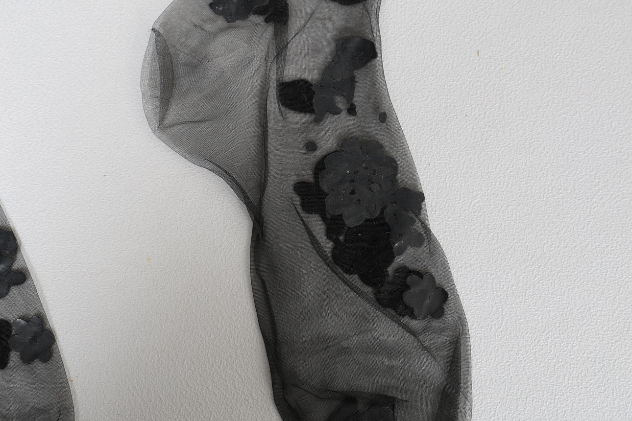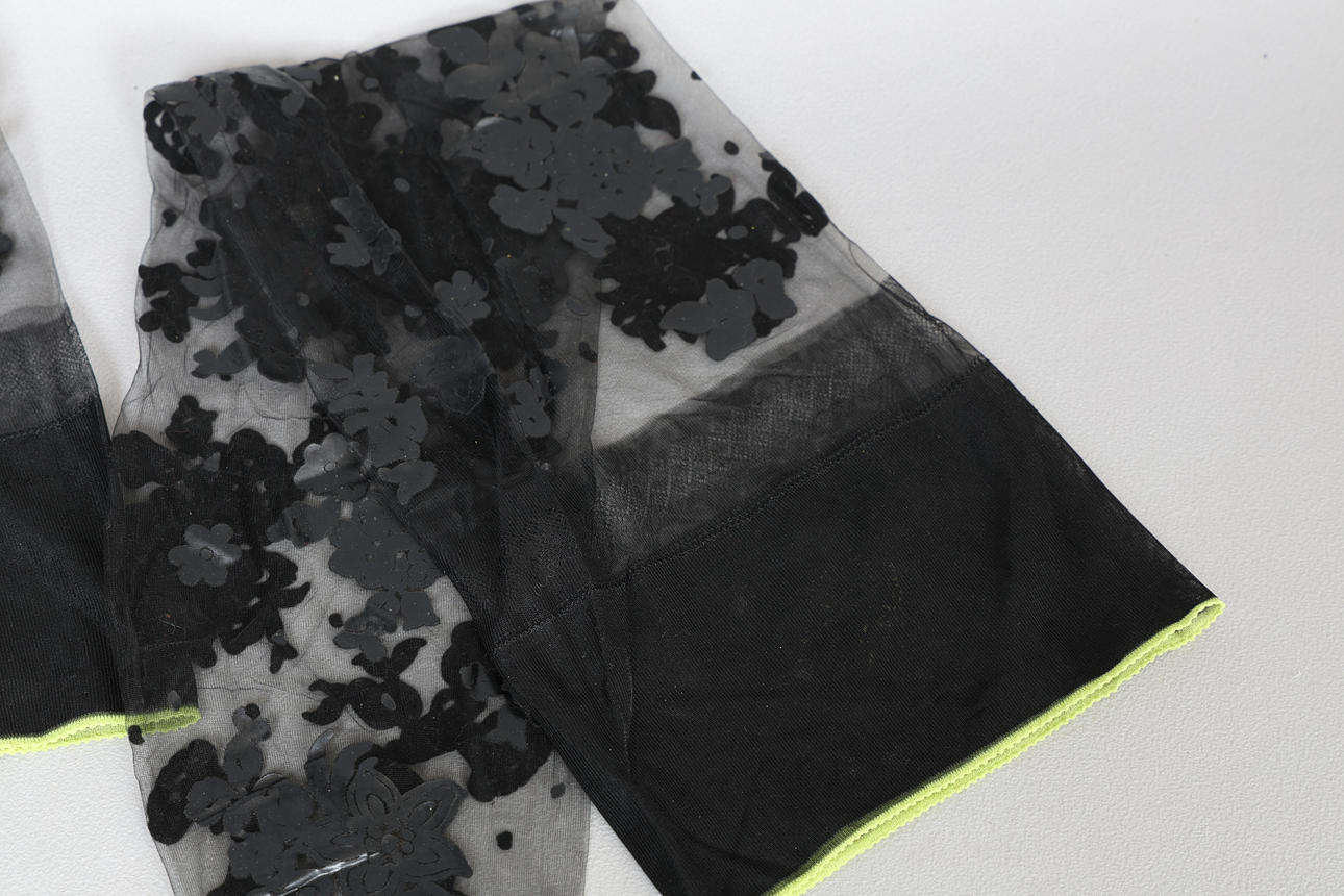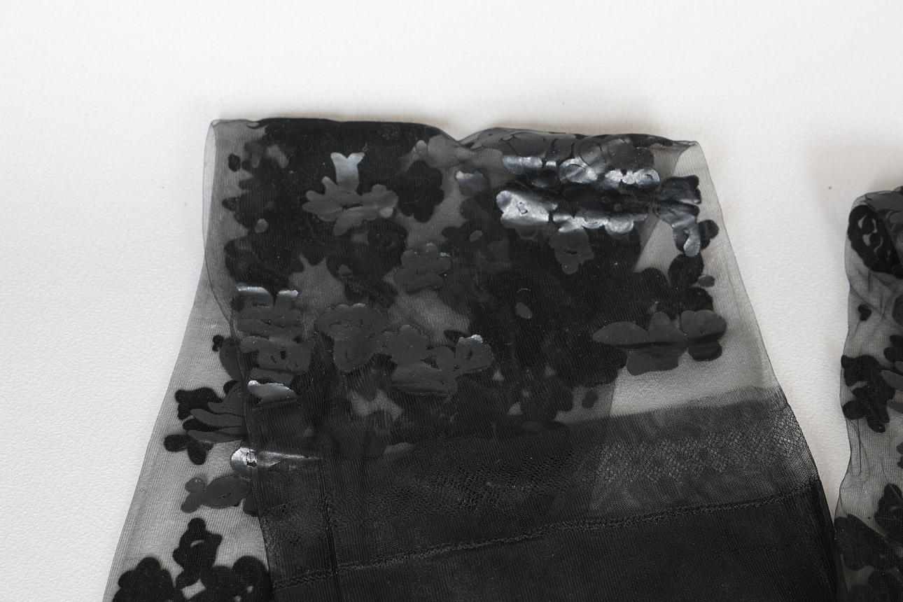 Vintage Hanes Black Magic Sheer Extravagance strømper med blomsterapplikation, størrelse 10 1/2 L, med original æske på 26 cm x 20 cm x 2 cm.