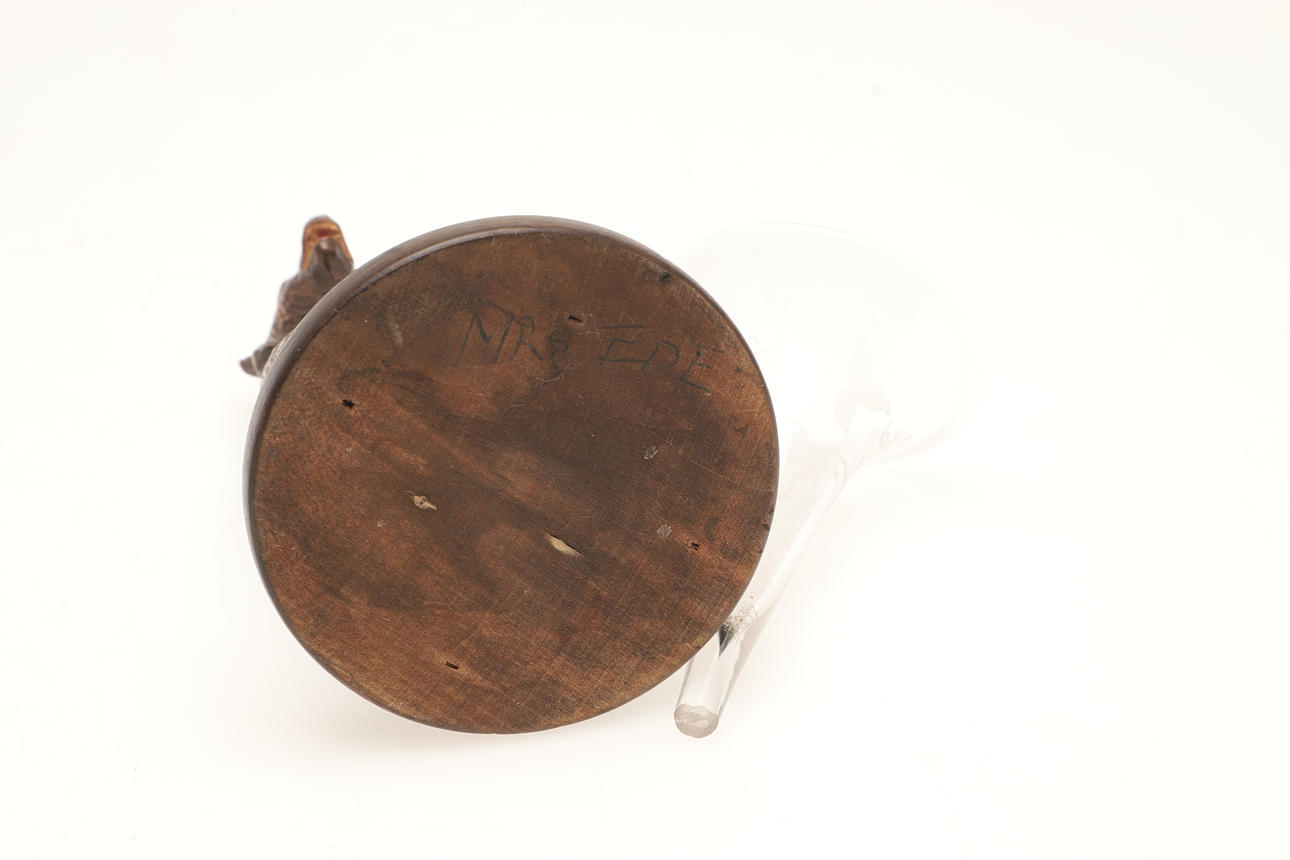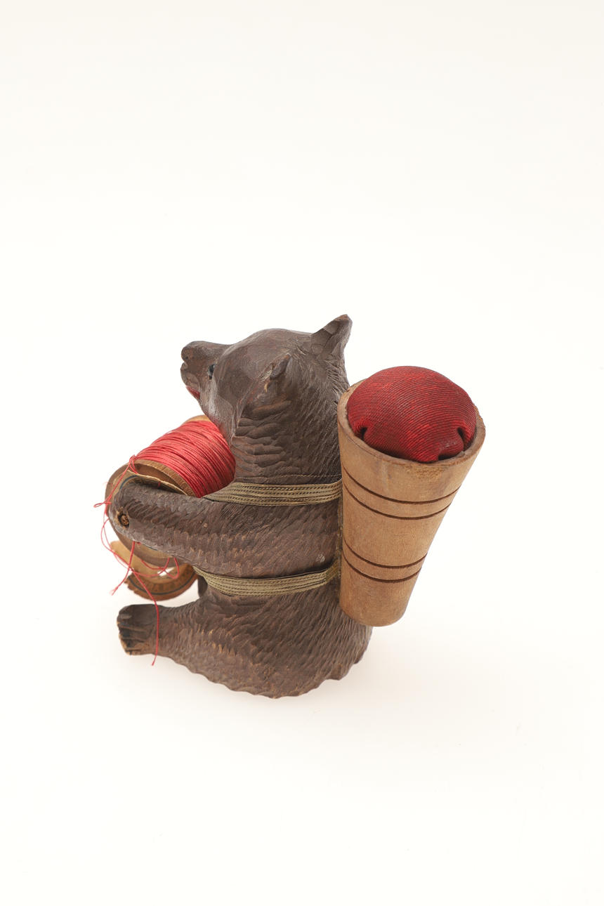 Tre små Schwarzwald-bjørne, herunder en med en nålepude (8 cm høj), Schwarzwald-bjørn med glasspildevase (15 cm høj) og en med glaskrydderier (7,5 cm på tværs). (3).