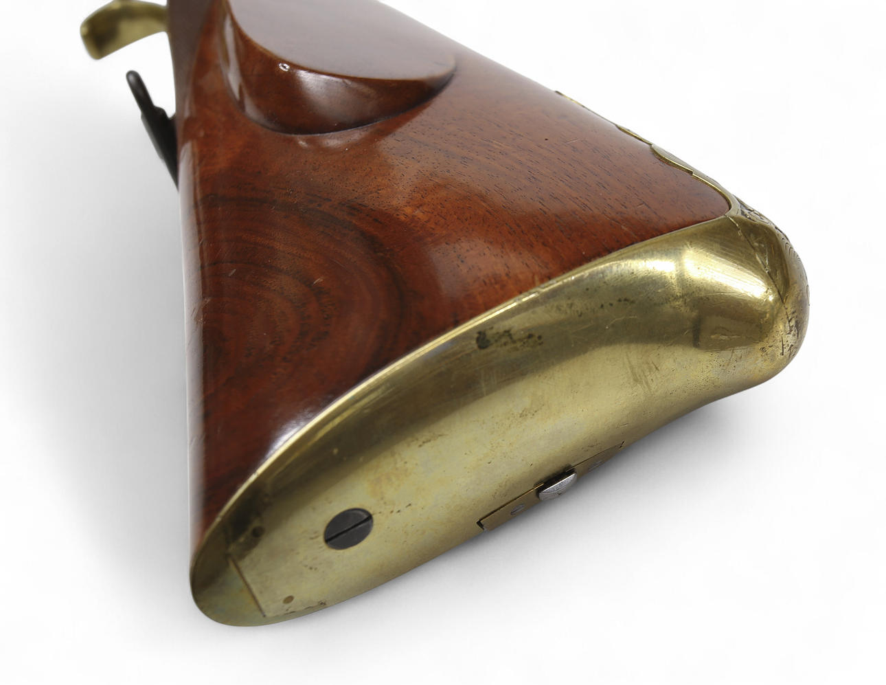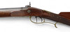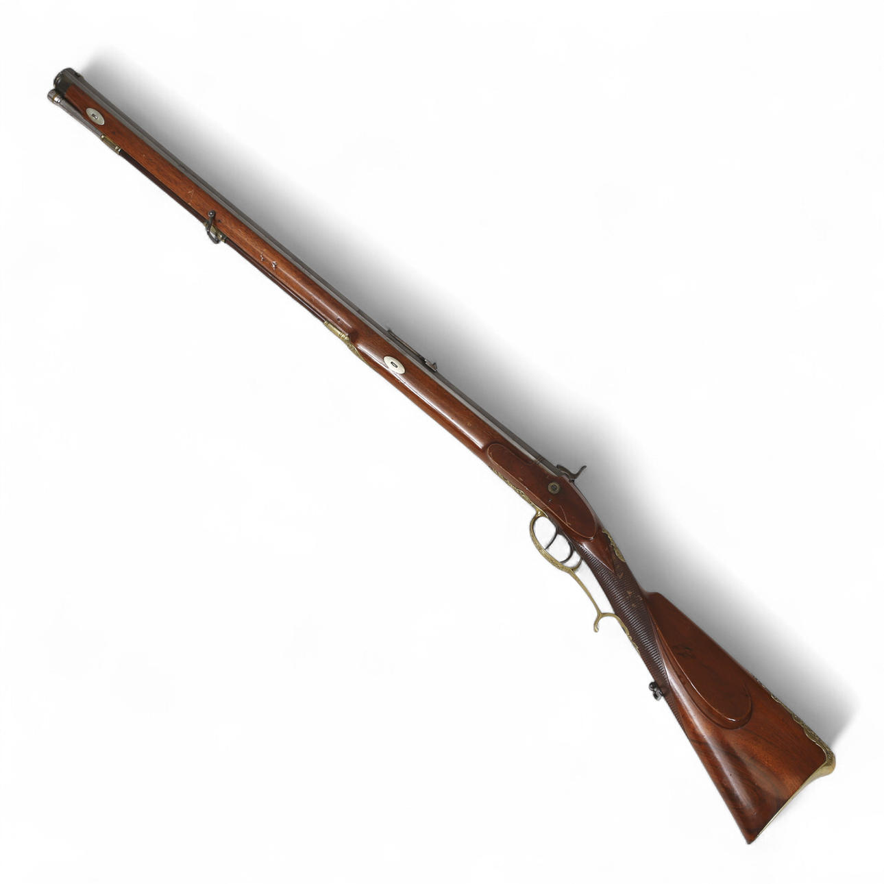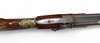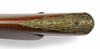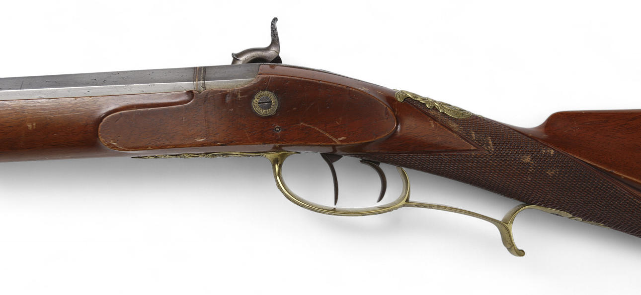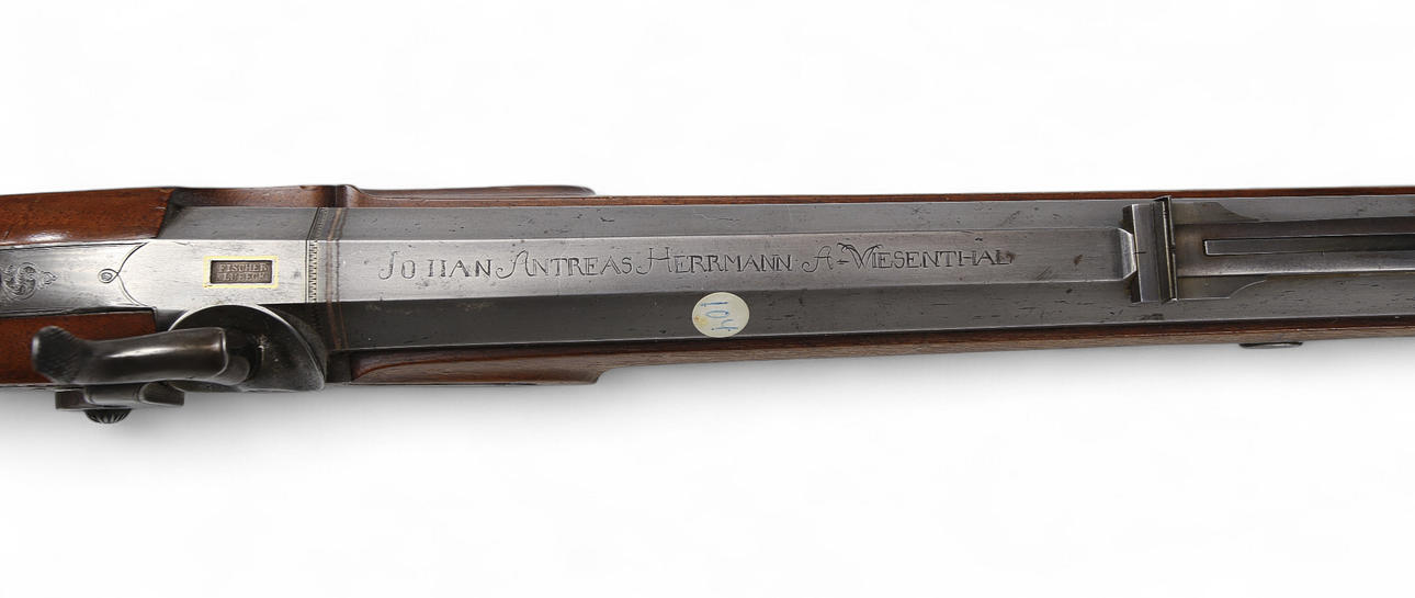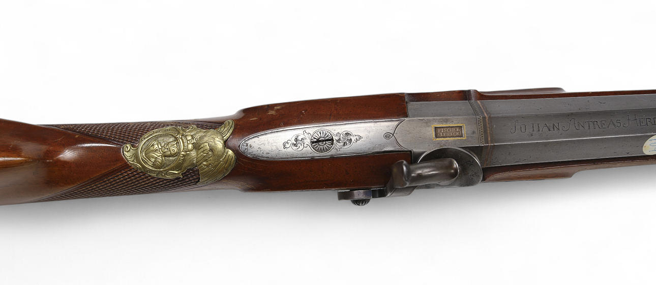 Tysk slaglåsehopper fra 1850'erne med ejermærkning på tønden: „Johan Antreas Herrmann A Wiesentahl“. Lavet af Fischer, Lübeck“, ottekantet rør, rigt graveret og forgyldt messingbeslag. Rillet rør, fungerende tryk, holder i hele og halve spænder.