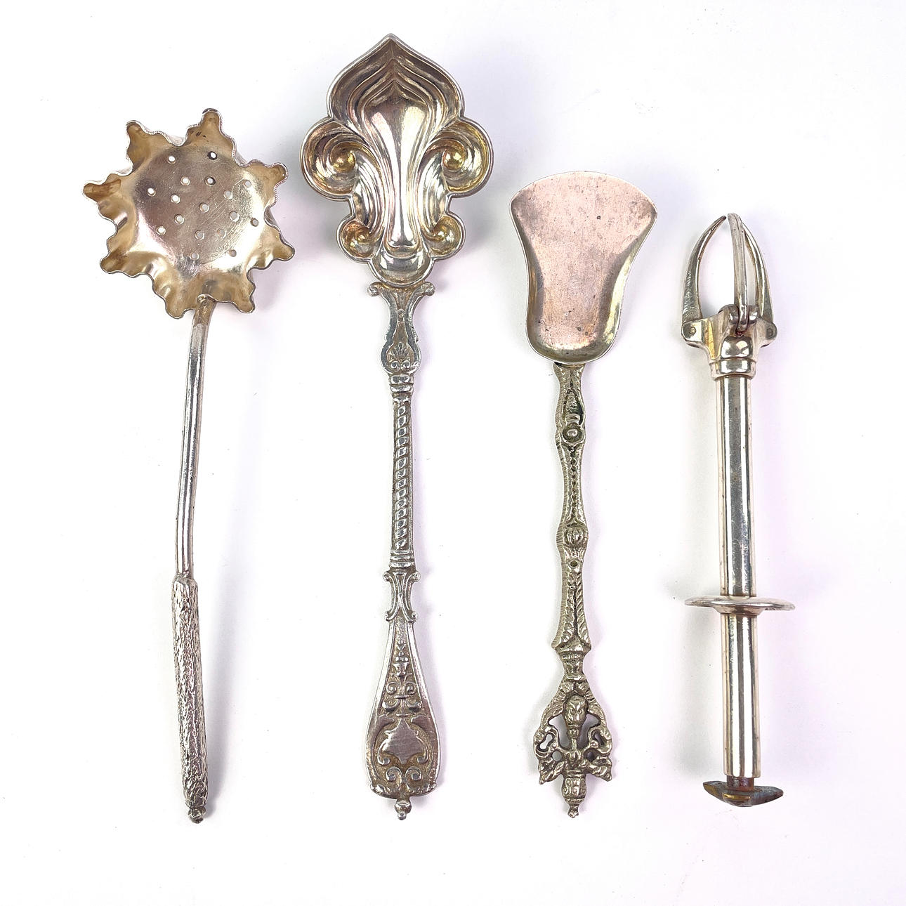Sæt af sølvbelagte redskaber, 87 stykker bestående af serveringstilbehør, servietringe, skeer, gafler, tesugerør mv.