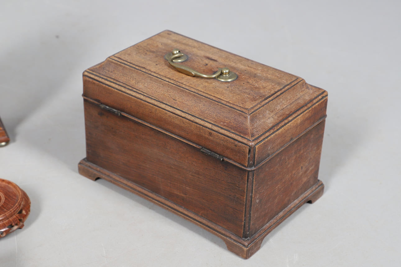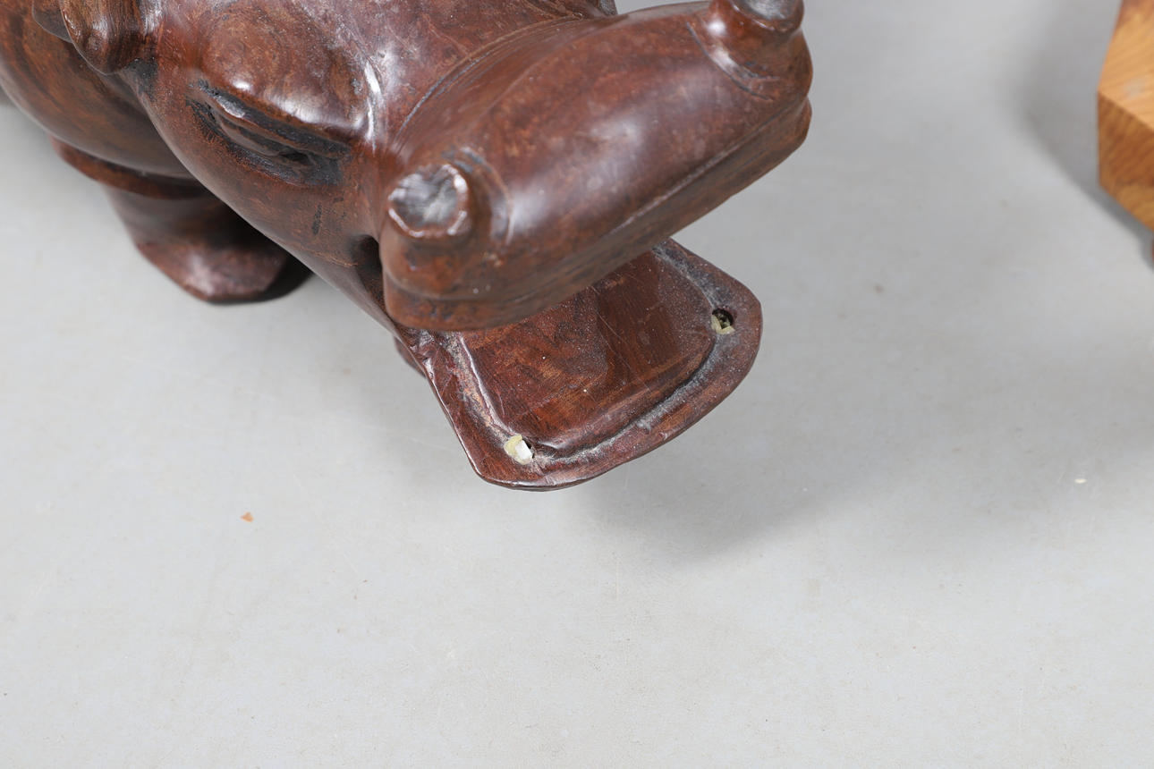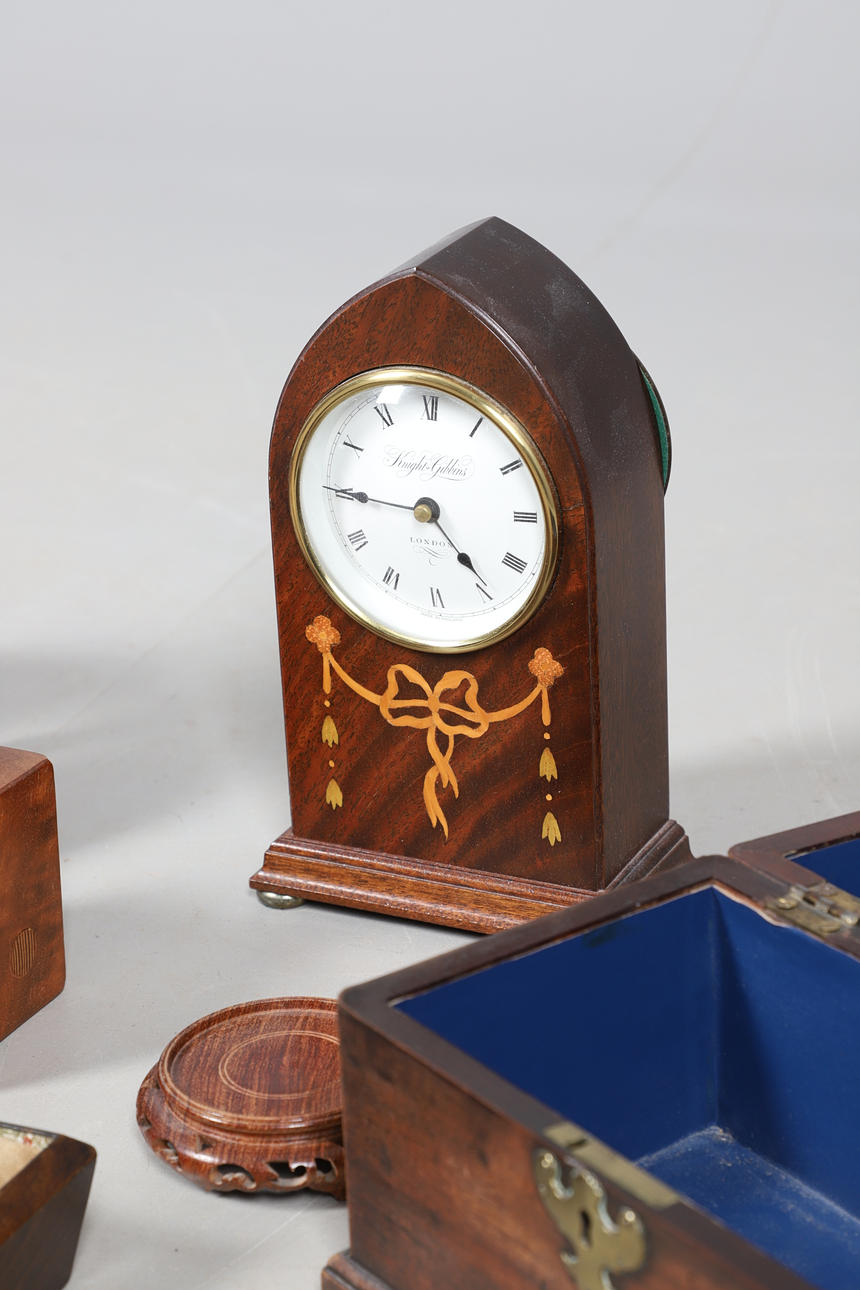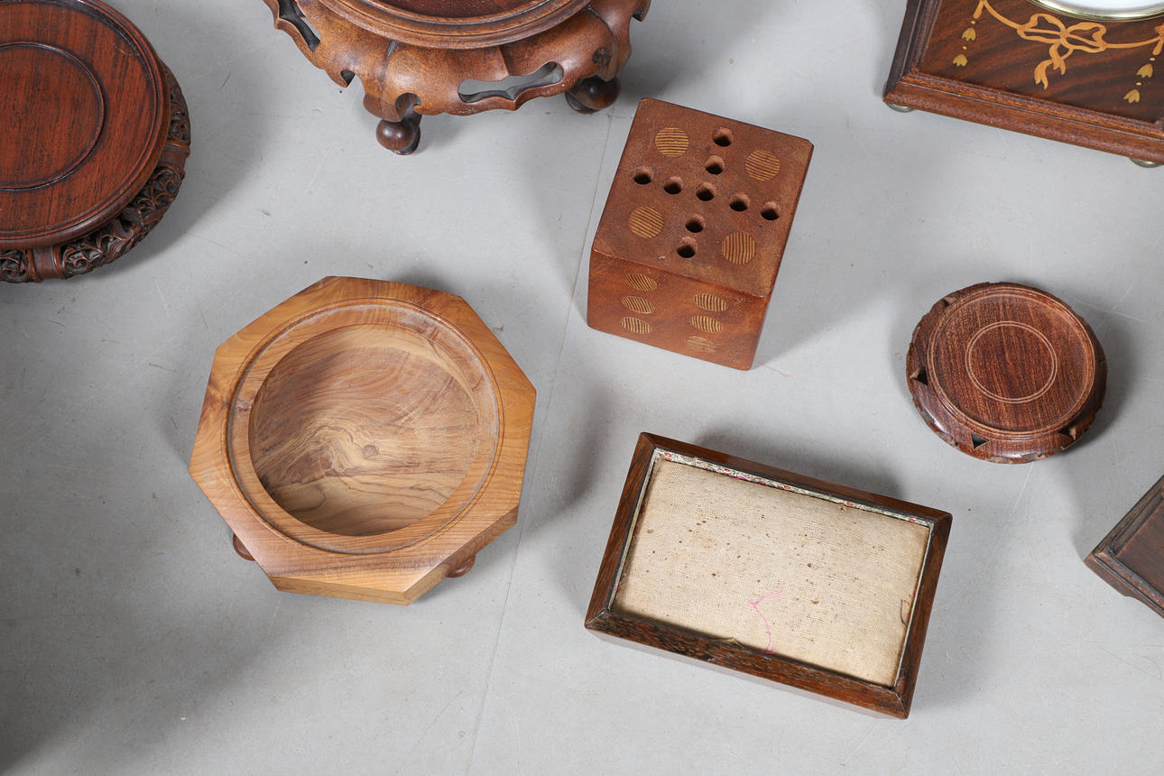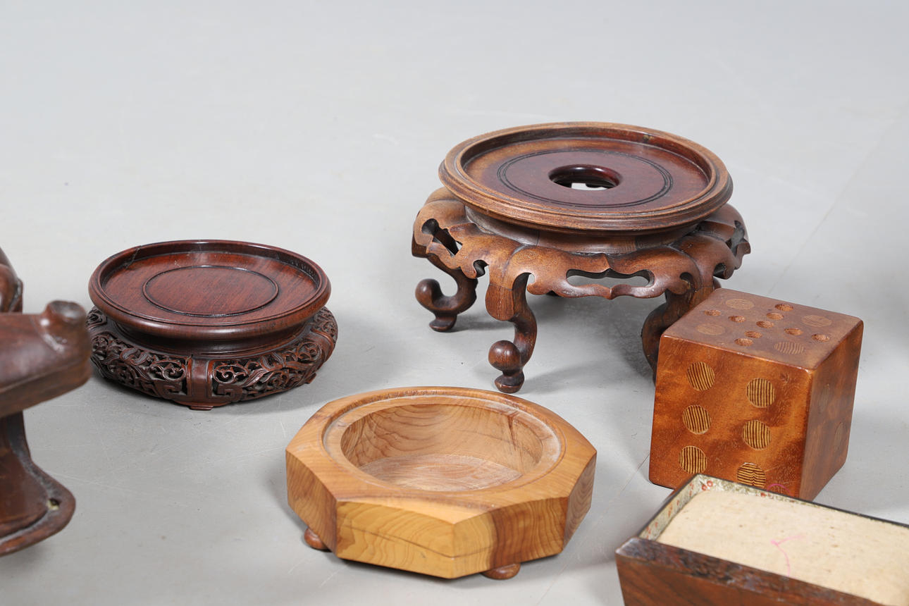 En teboks fra mahogni fra 19. århundrede (23 cm på tværs, 15,5 cm høj, ingen låg indeni), en stor flodhest i træ (42 cm lang), et Knight Gibbins kuppelur (24,5 cm højt), en victoriansk palisanderstiftpude (15 cm x 10 cm), orientalske træstativer.