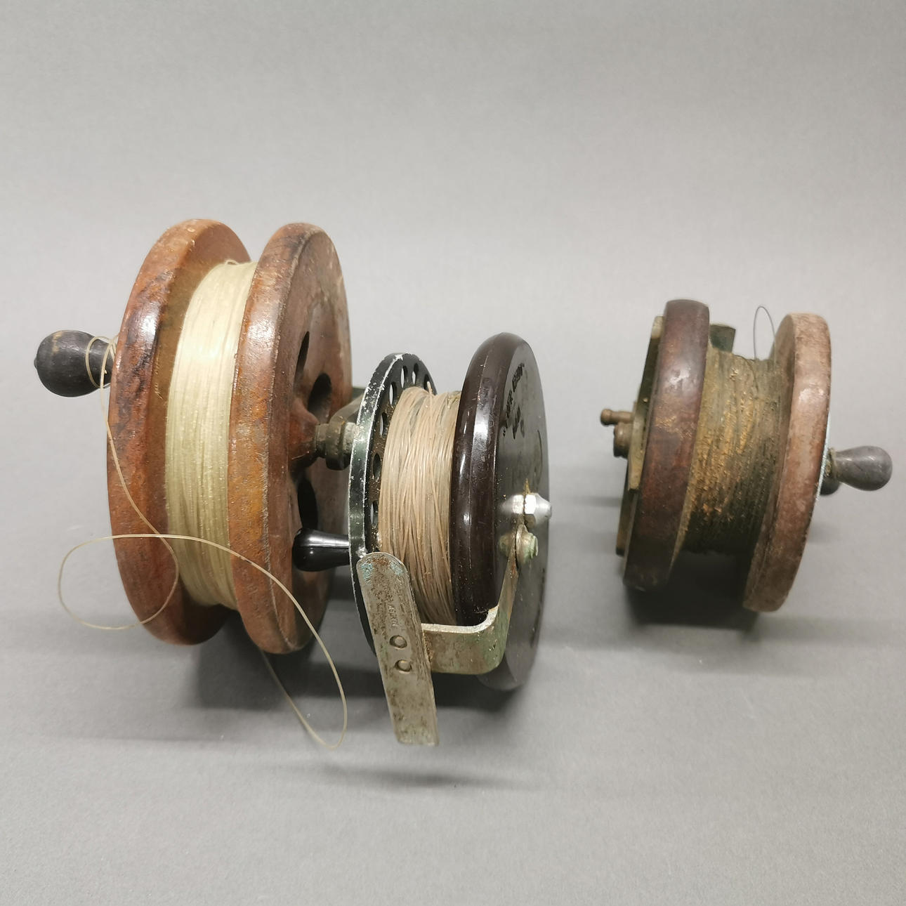Tre antikke fiskeruller.
