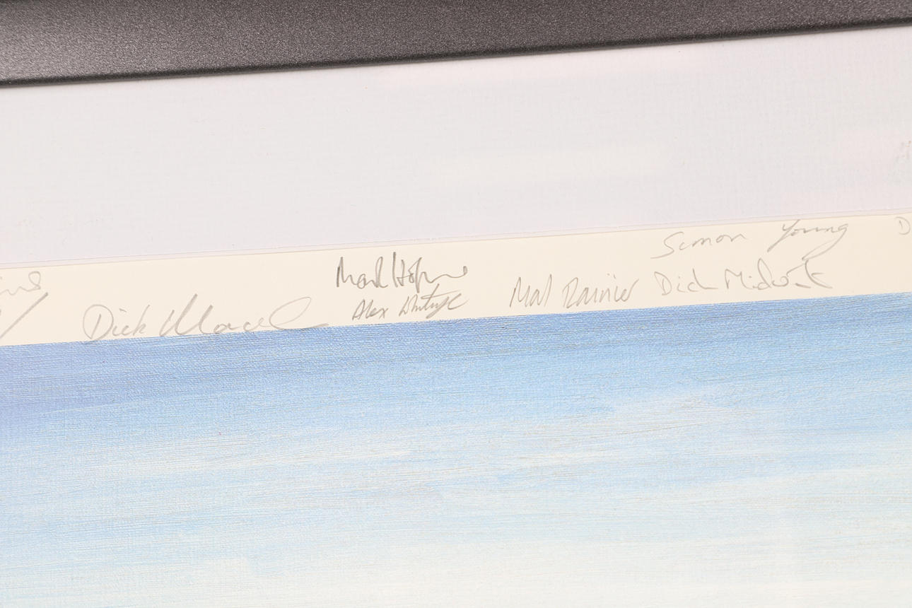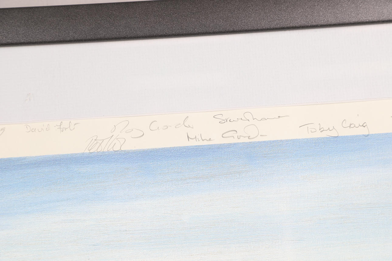4304761. “ DET LÆNGSTE MINUT“ FARVETRYK EFTER MICHAEL RONDOT MED TALRIGE UNDERSKRIFTER.