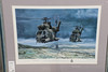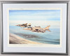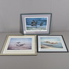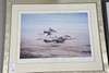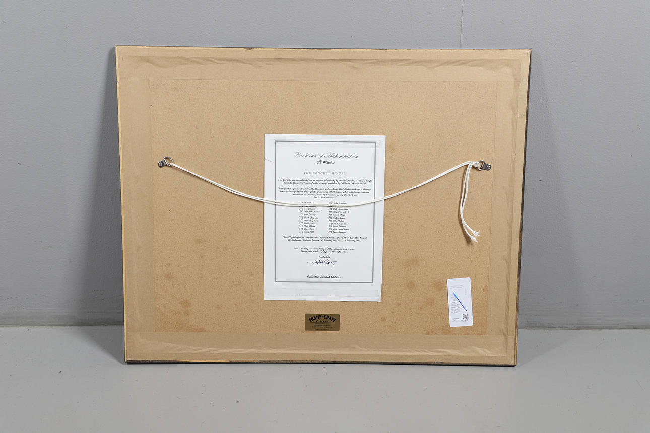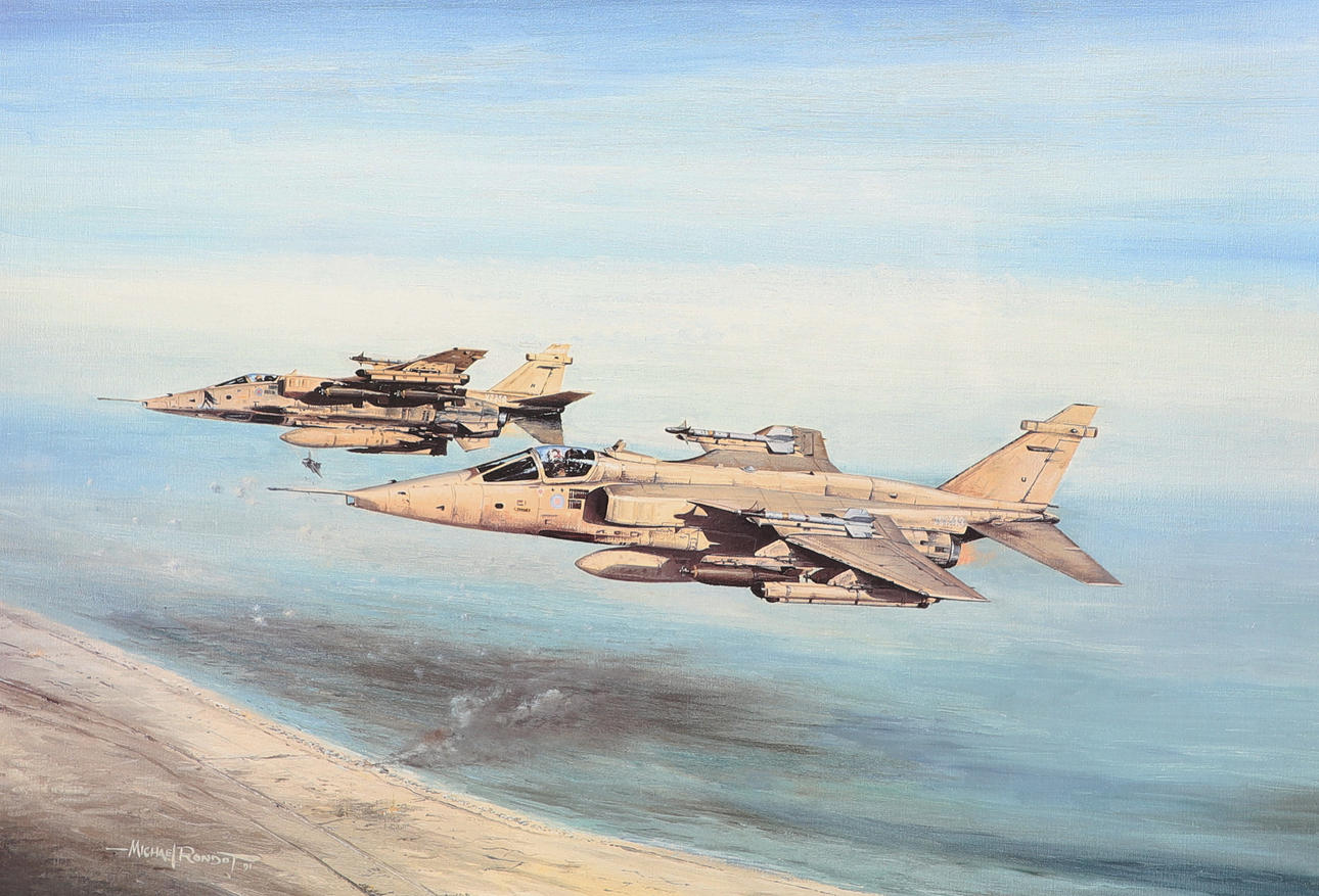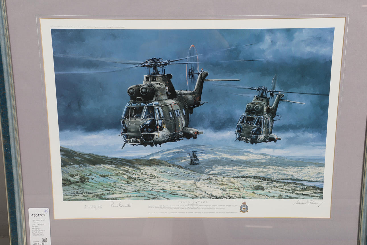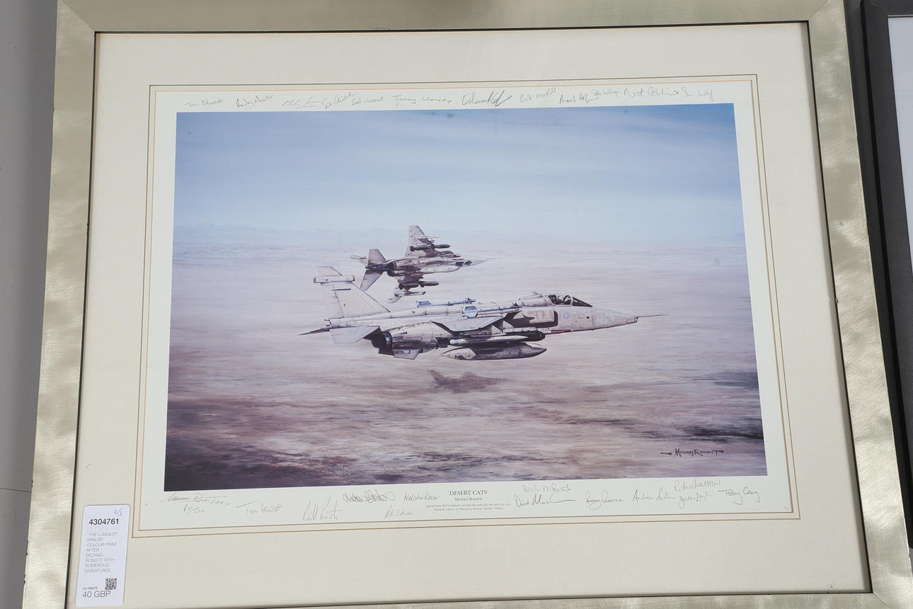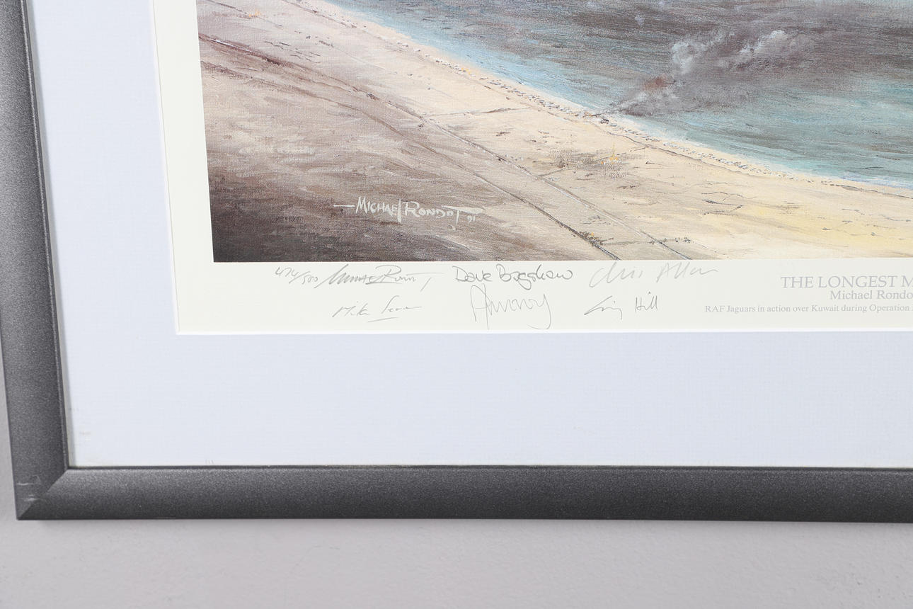 Et farveprint 'The Longest Minute' med to jaguarer, der flyver under Operation Desert Storm. Med underskrifter i blyant i margenen af alle 22 Jaguar-piloter, der fløj operationelle missioner i Kuwaits teater under Desert Storm. Indrammet og glaseret, samlet 56 x 70,5 cm. Nummer 474/500. Lignende farveprint 'Desert Cats' med to Jaguarer fra RAF Coltishall, der bærer fuld krigsbelastning, hurtig og meget lav. Med underskrifter i blyant i margenen på 25 Jaguar-piloter, der fløj operationelle missioner i Kuwaits teater under Golfkrigen. Indrammet og glaseret, samlet 65 x 81 cm. Nummer 84/500. Og Puma-helikoptere fra 230 (Tiger) eskadrille over South Armagh 'Bandit Country'. Kunstnerbevis, nummer 22/75, signeret med blyant i margen af kunstneren og en anden. Indrammet og glaseret, 61 x 76 cm. Tre aftryk.