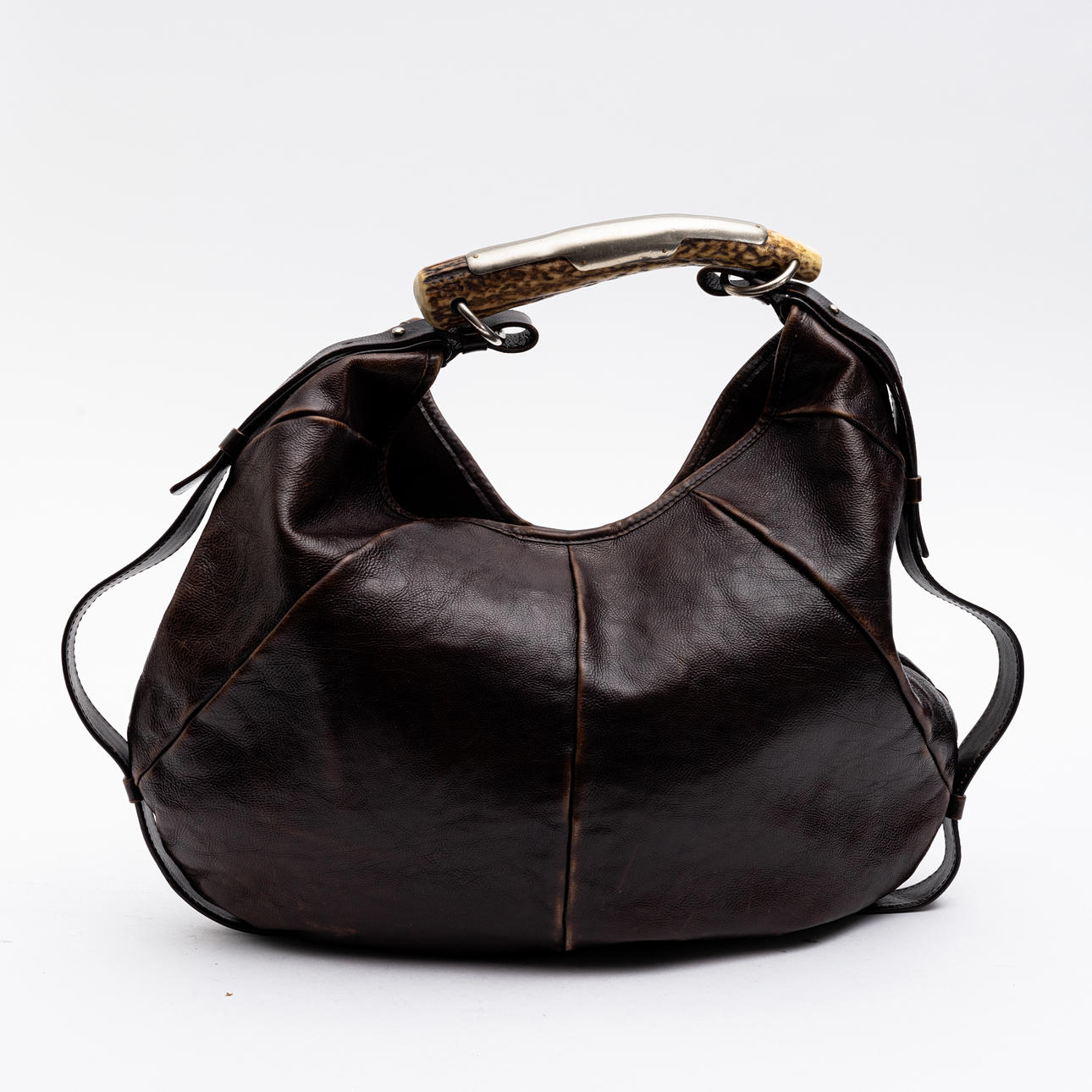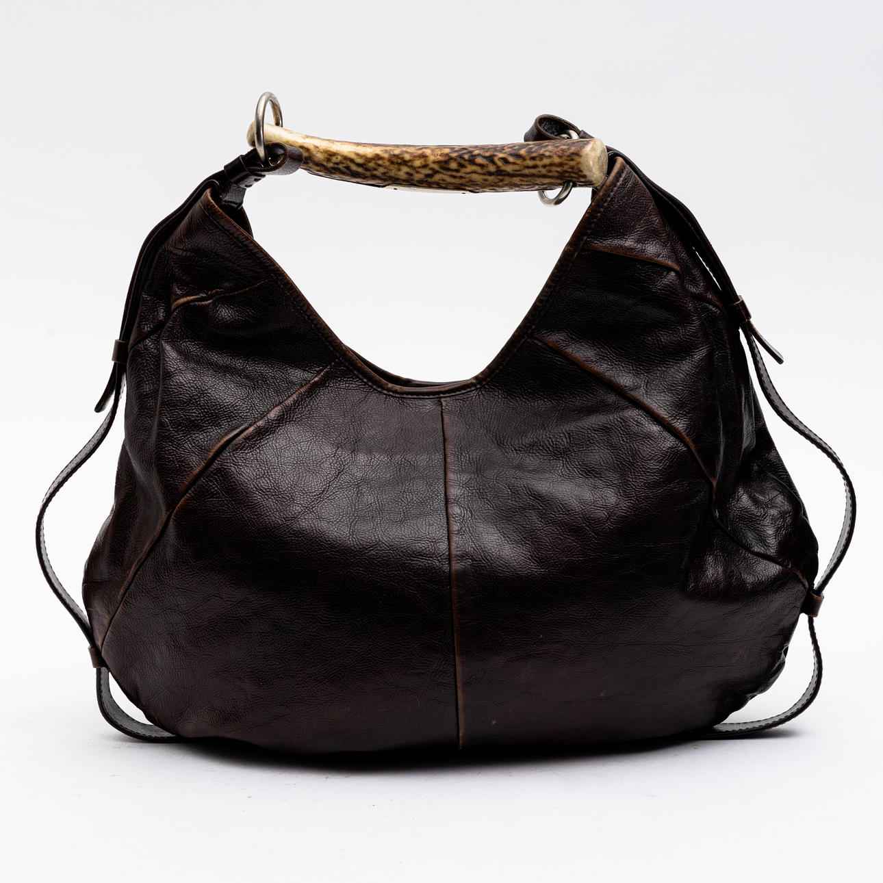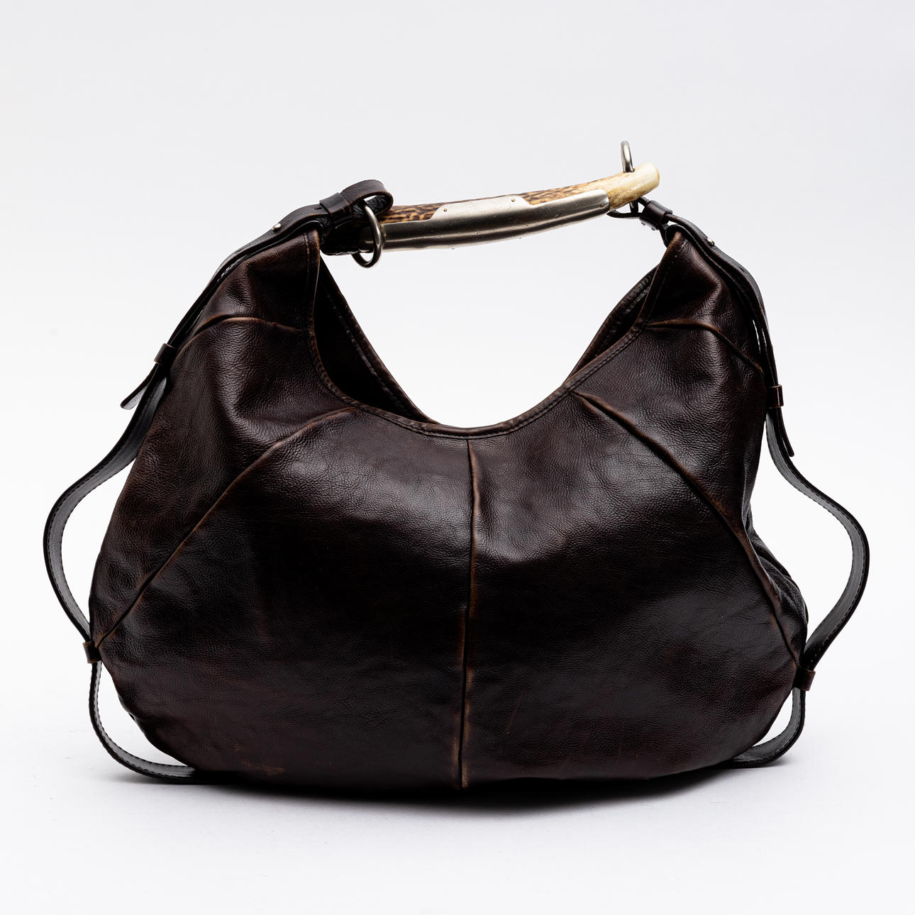 Mørkebrunt læder med håndtag i benene, patinerede metalbeslag. Interiøret består af et stort rum med to mindre, et med lynlås. Frimærke mærket „YVES SAINT LAURENT RIVE GAUCHE“. 43 x 43 cm (inkl. håndtag.