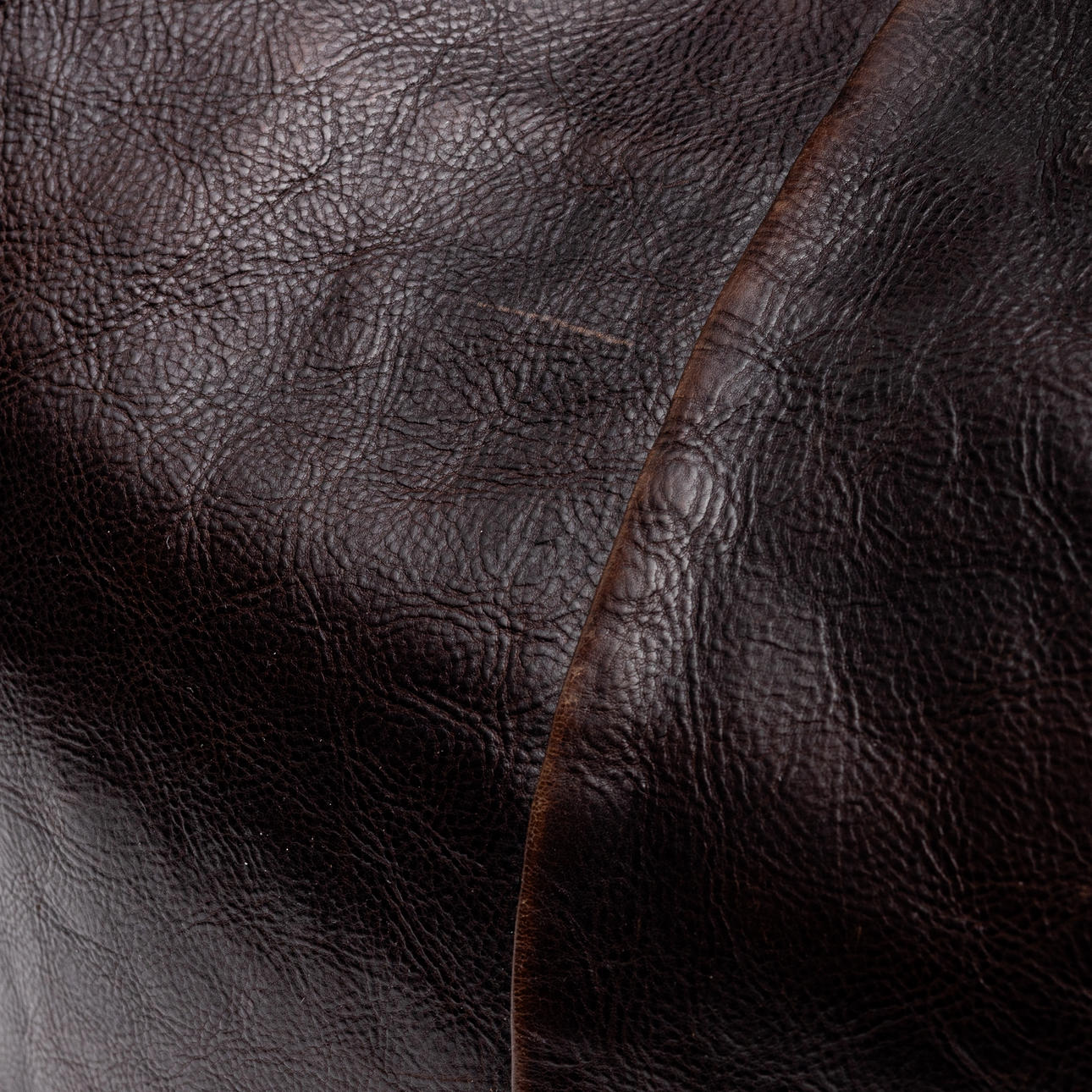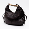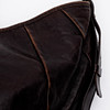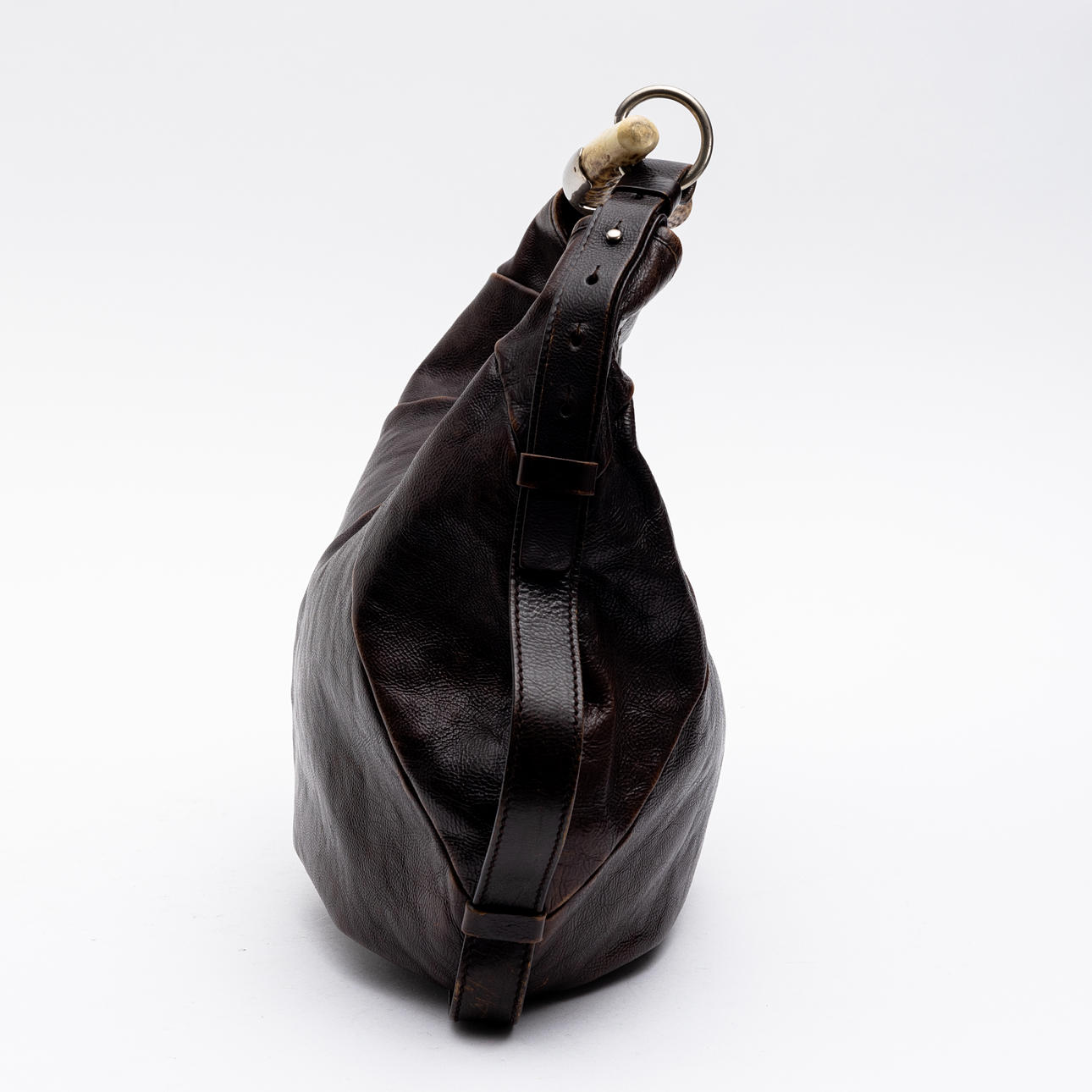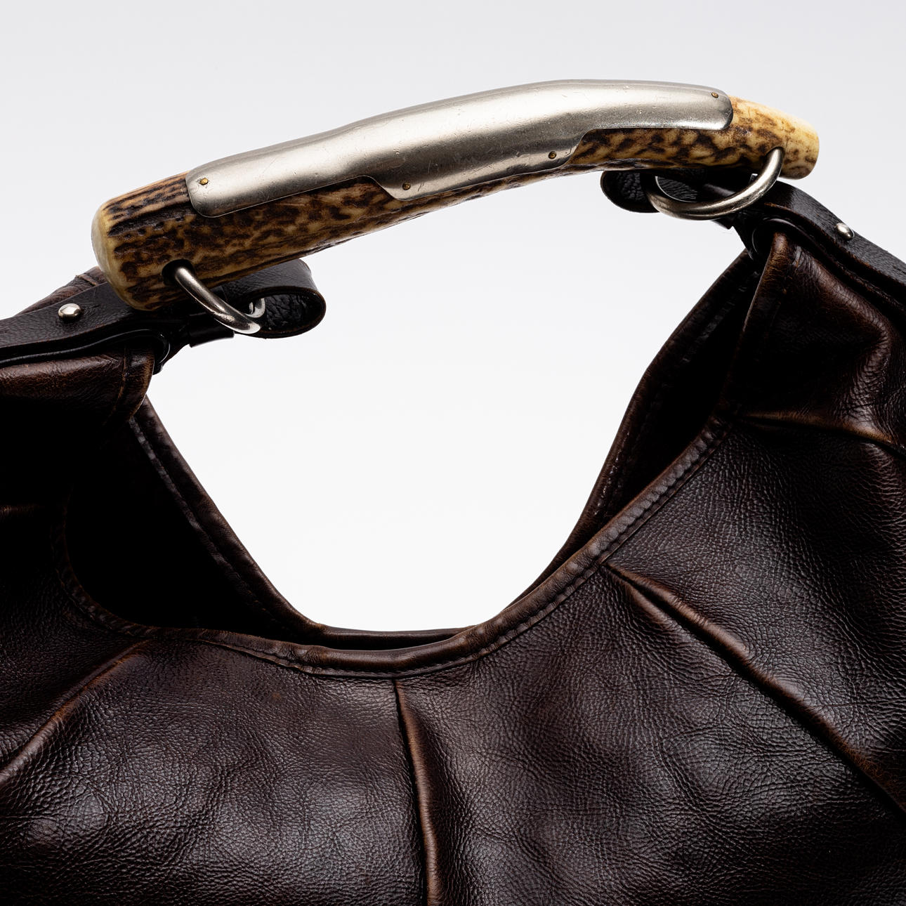 Mørkebrunt læder med håndtag i benene, patinerede metalbeslag. Interiøret består af et stort rum med to mindre, et med lynlås. Frimærke mærket „YVES SAINT LAURENT RIVE GAUCHE“. 43 x 43 cm (inkl. håndtag.