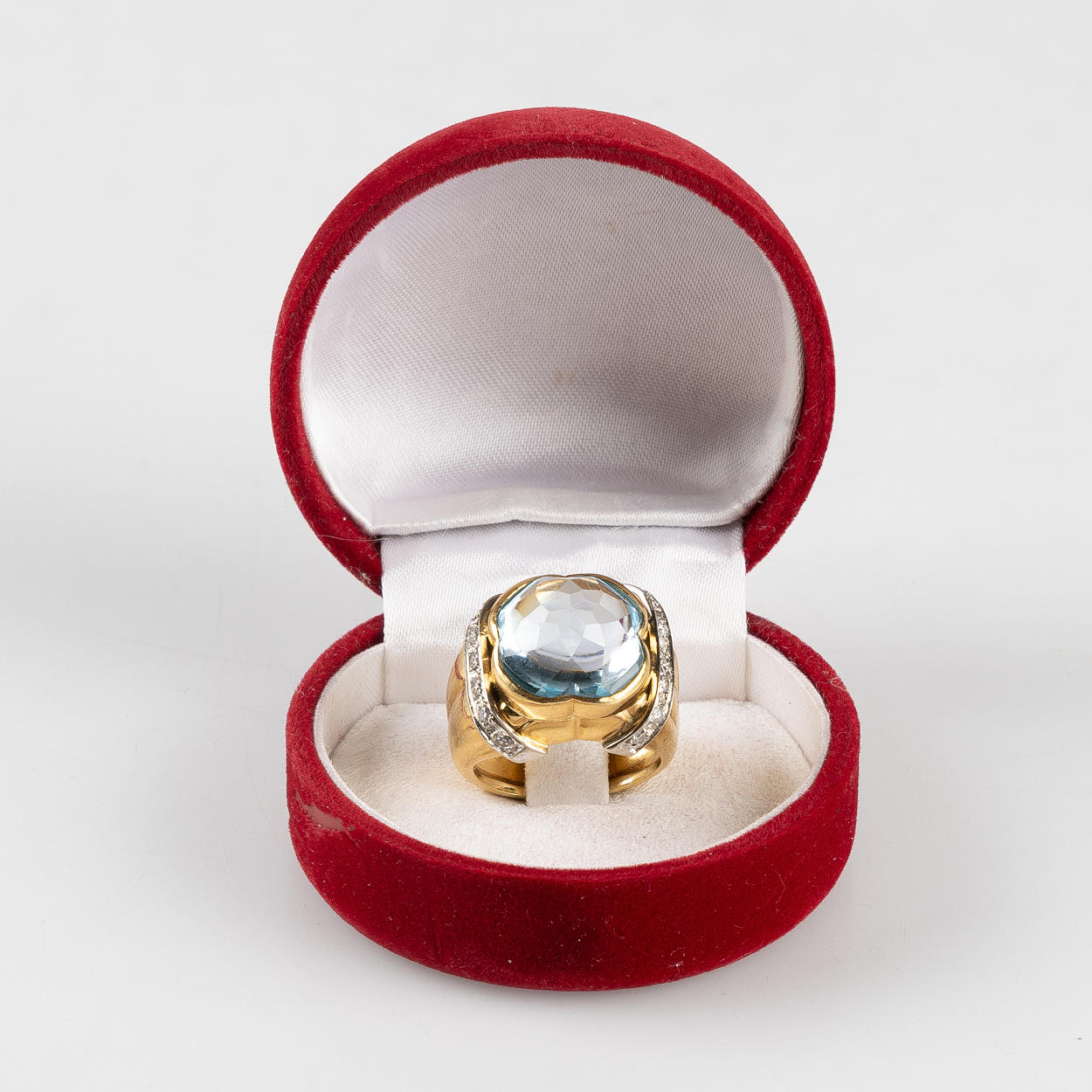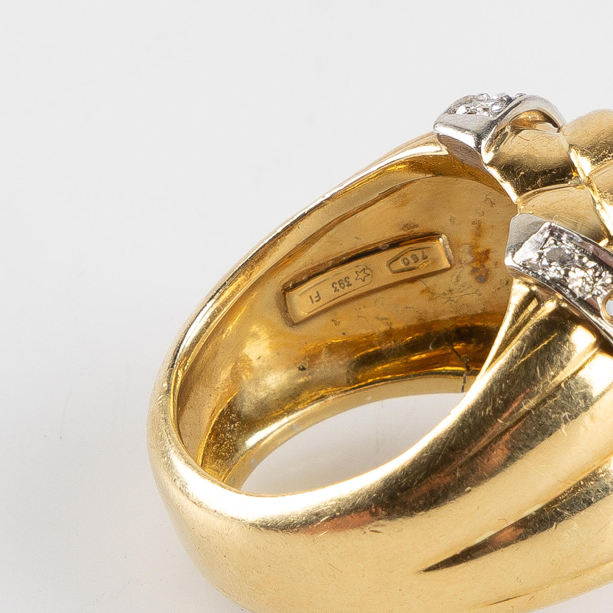 Der mangler en diamant. Nogle diamanter sidder skråt i holderen, små 8/8-slebne diamanter er senere monteret.