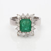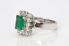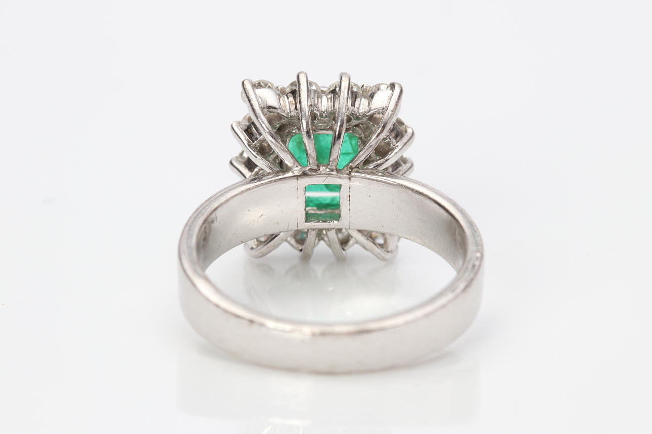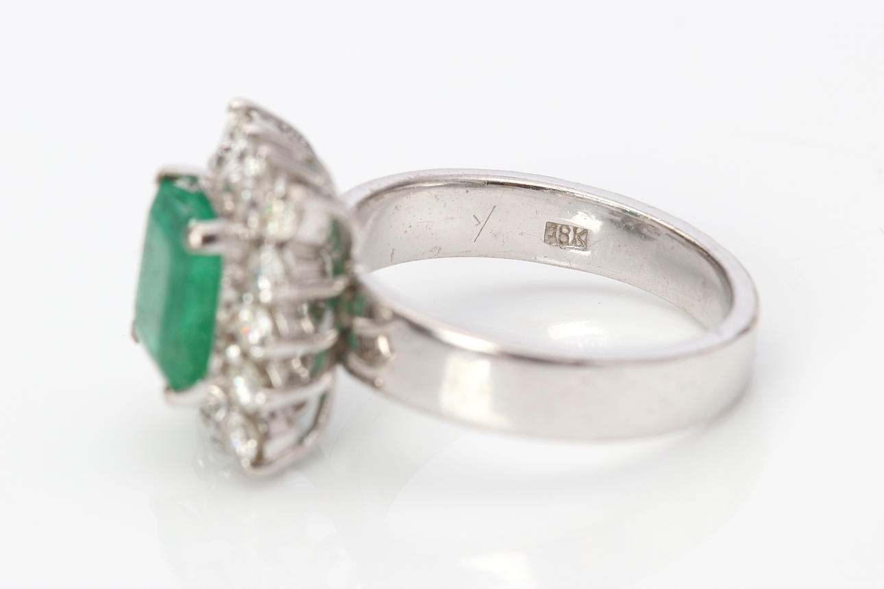 Ring i hvidguld, lavere guldindhold ca. 8k med smaragd ca. 8 x 7 mm og diamanter ca. 0,70 ct, str. ca. 17,5 mm, totalvægt 6,5 g.