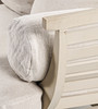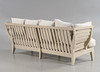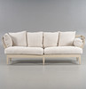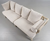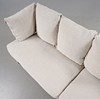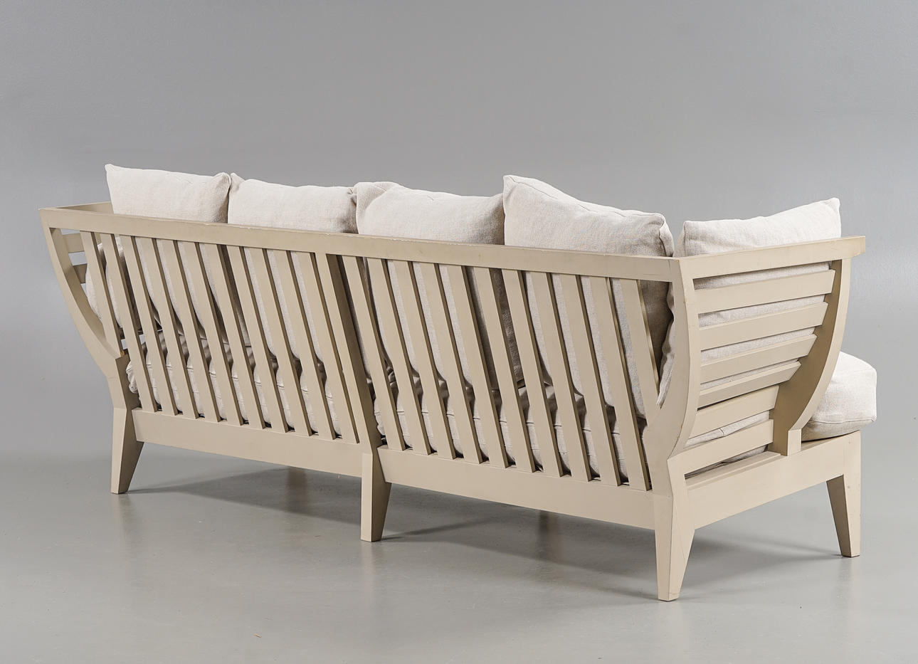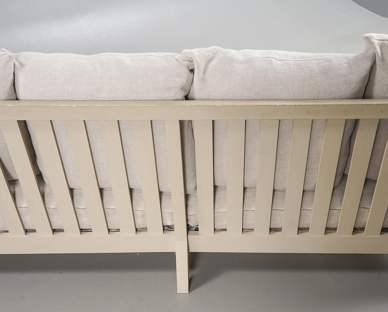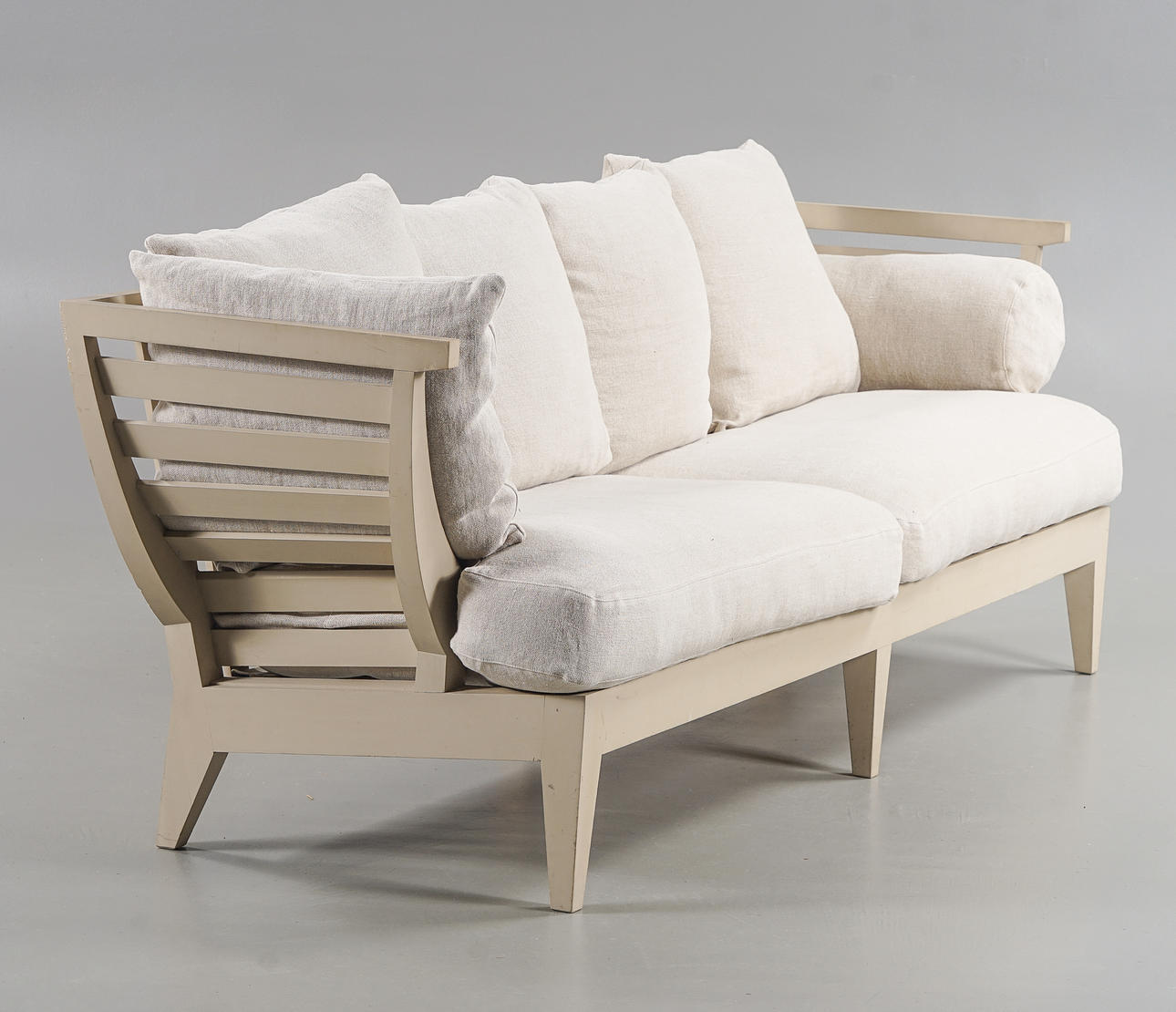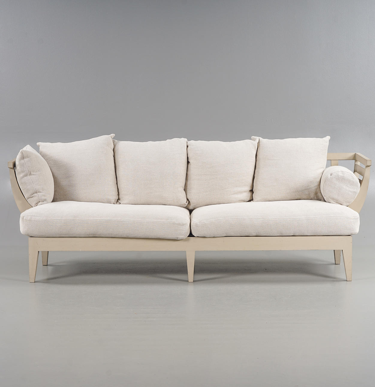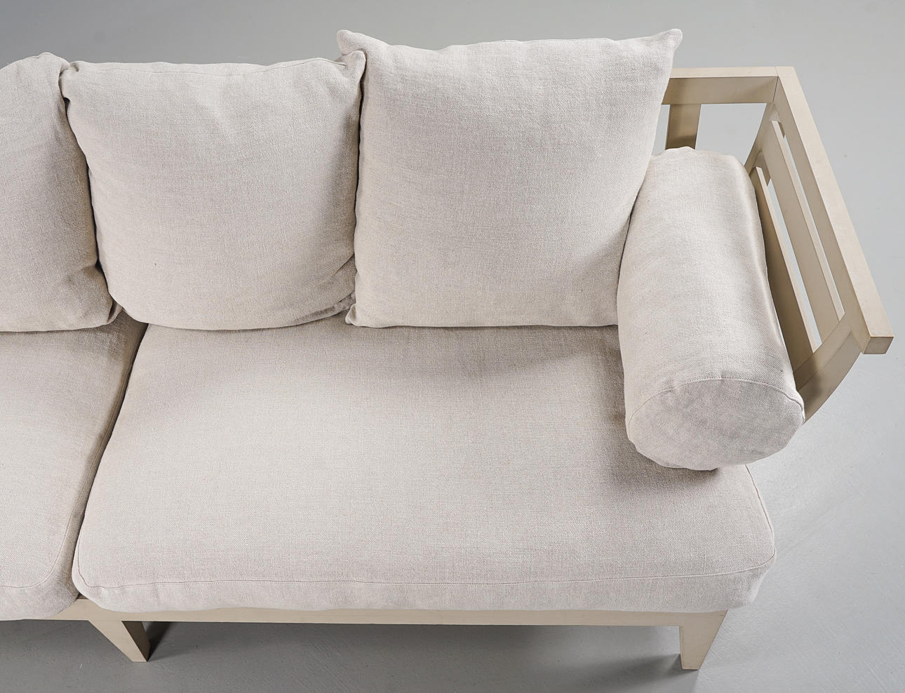 Lang model. Ramme lavet af træ med lys tempera farve. Hynder med linnedstof, købt 2022. 1 rund hovedpude.
