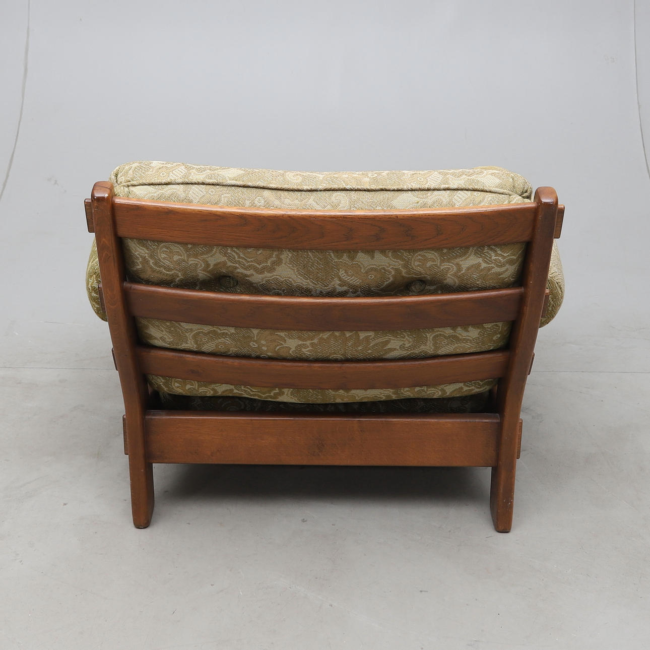 Ramme i bejdset hårdttræ. Løse puder i ryg og sæde. Sofalængde ca. 150, bredde 85, højde 70 cm. Lænestol, længde ca. 85, bredde 85, højde 70 cm.
