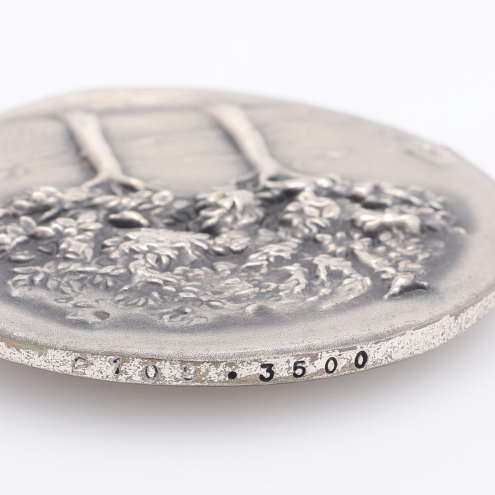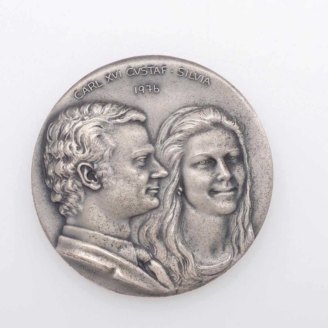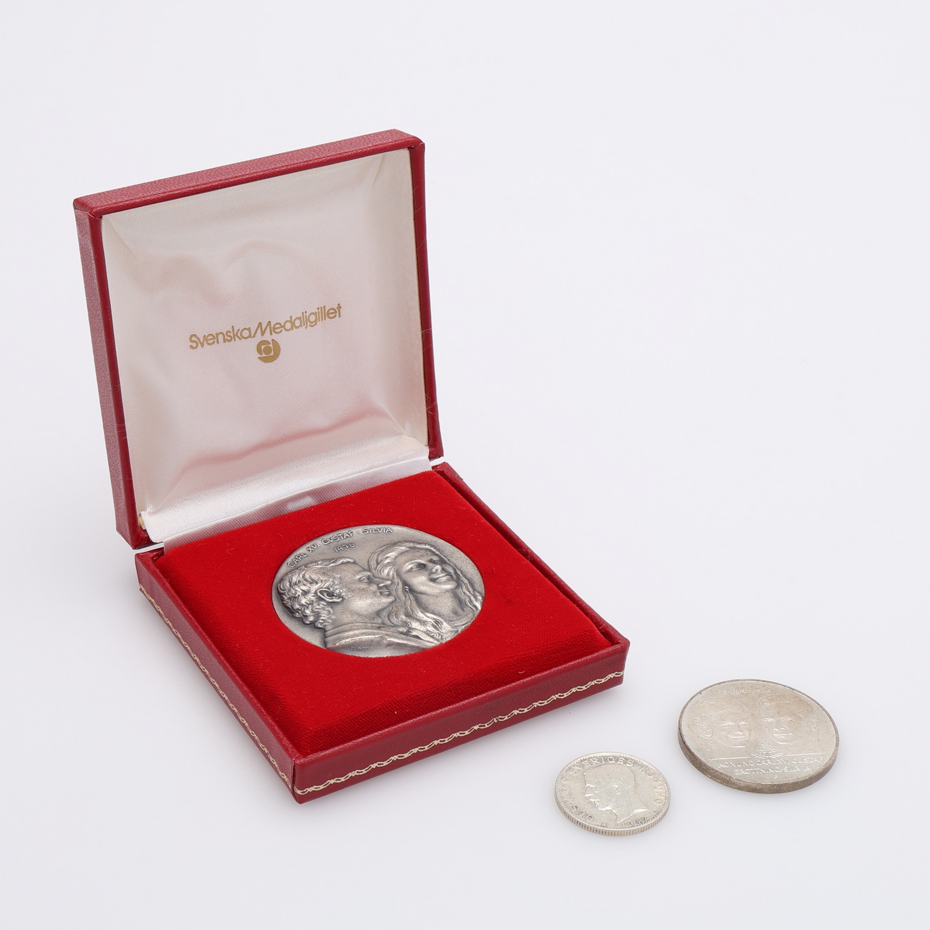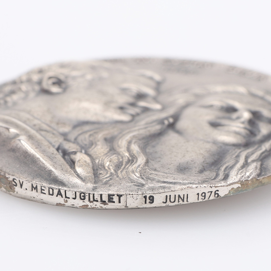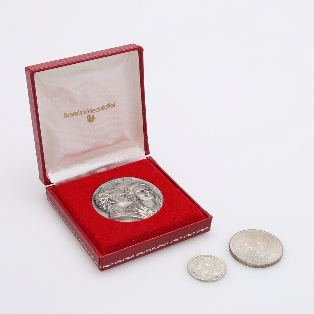 4312132. MINDEPLADE OG 2 SØLVMØNTER.