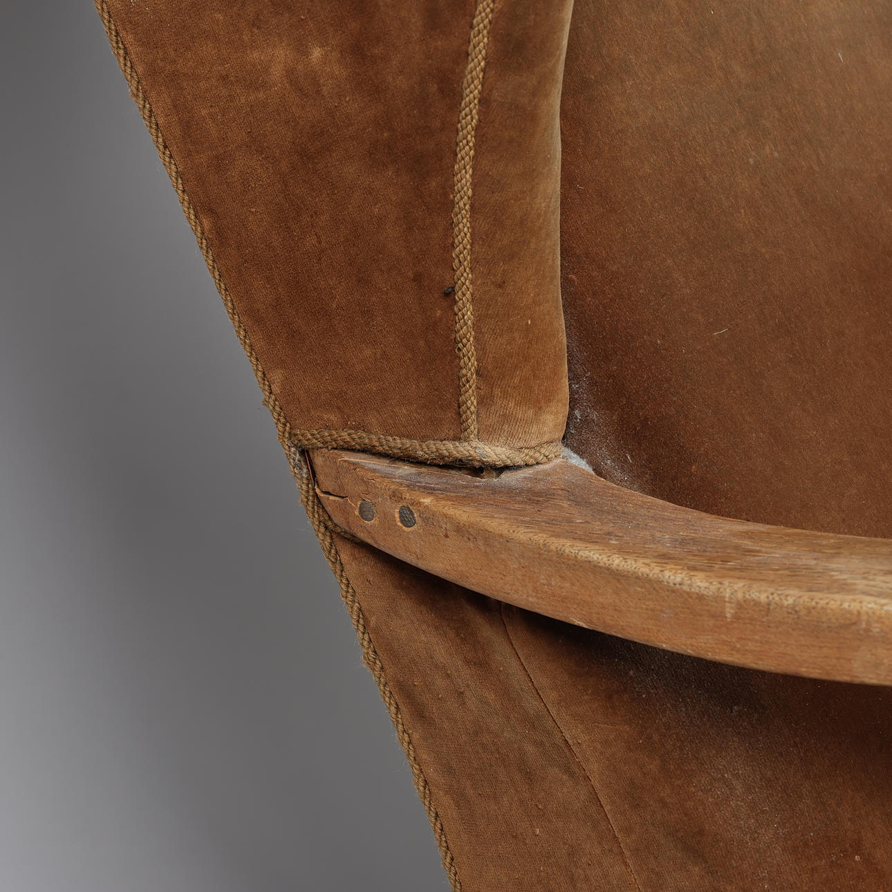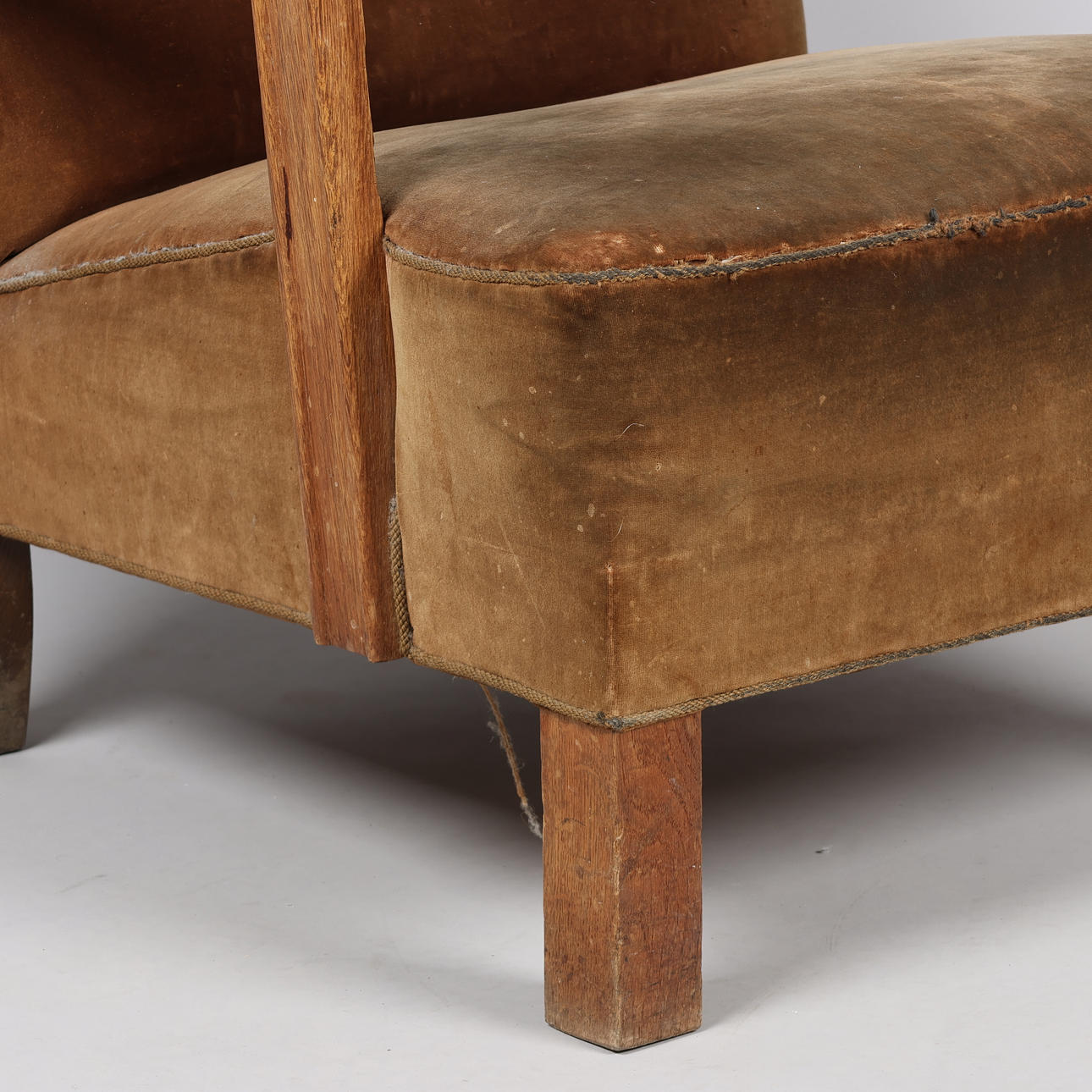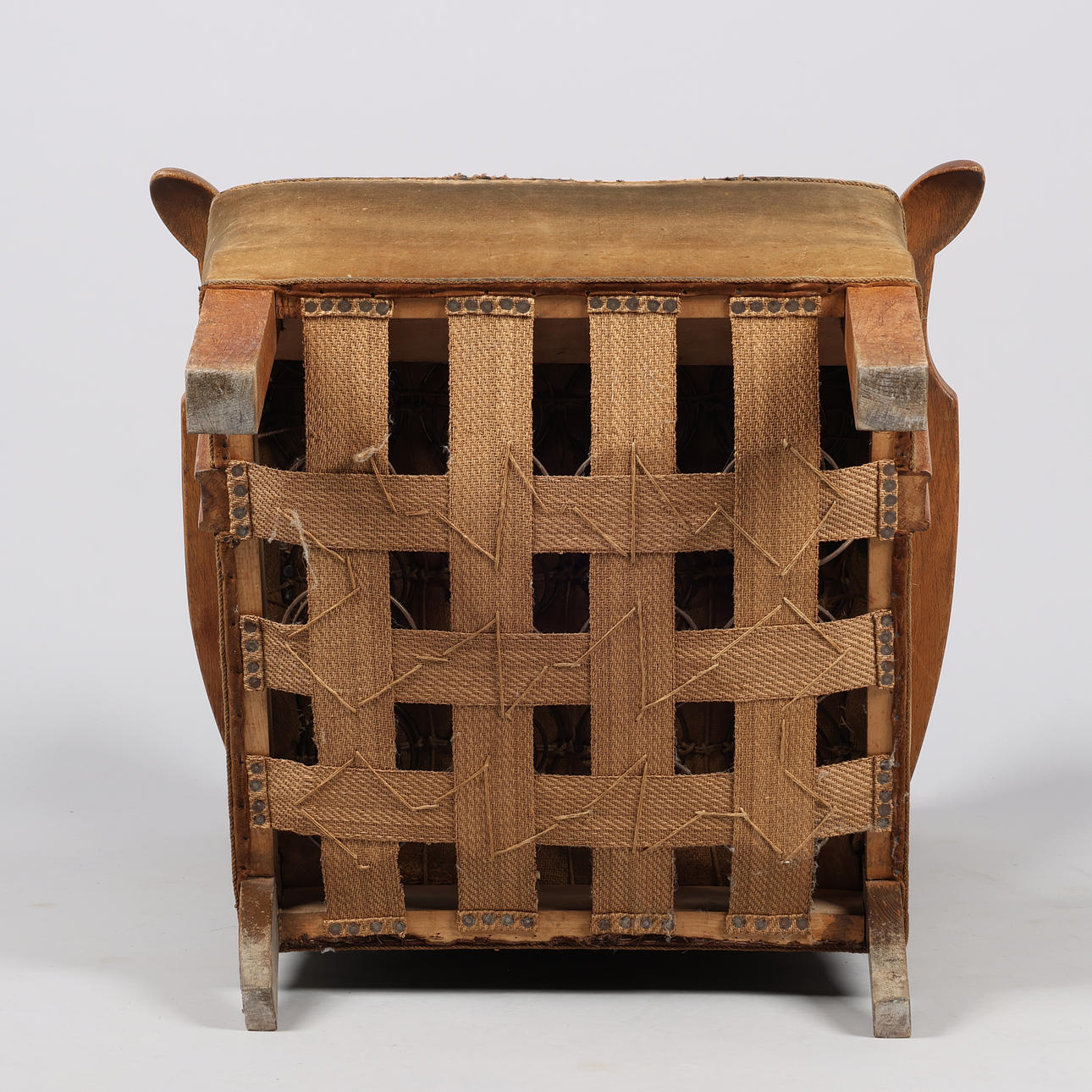 Kraftig alders- og brugsslitage. Ene armlæn er repareret ved ryg (fæstnet med to søm - se nærbillede). Begge armlæn lettere løse. Højde bagben med afslag.