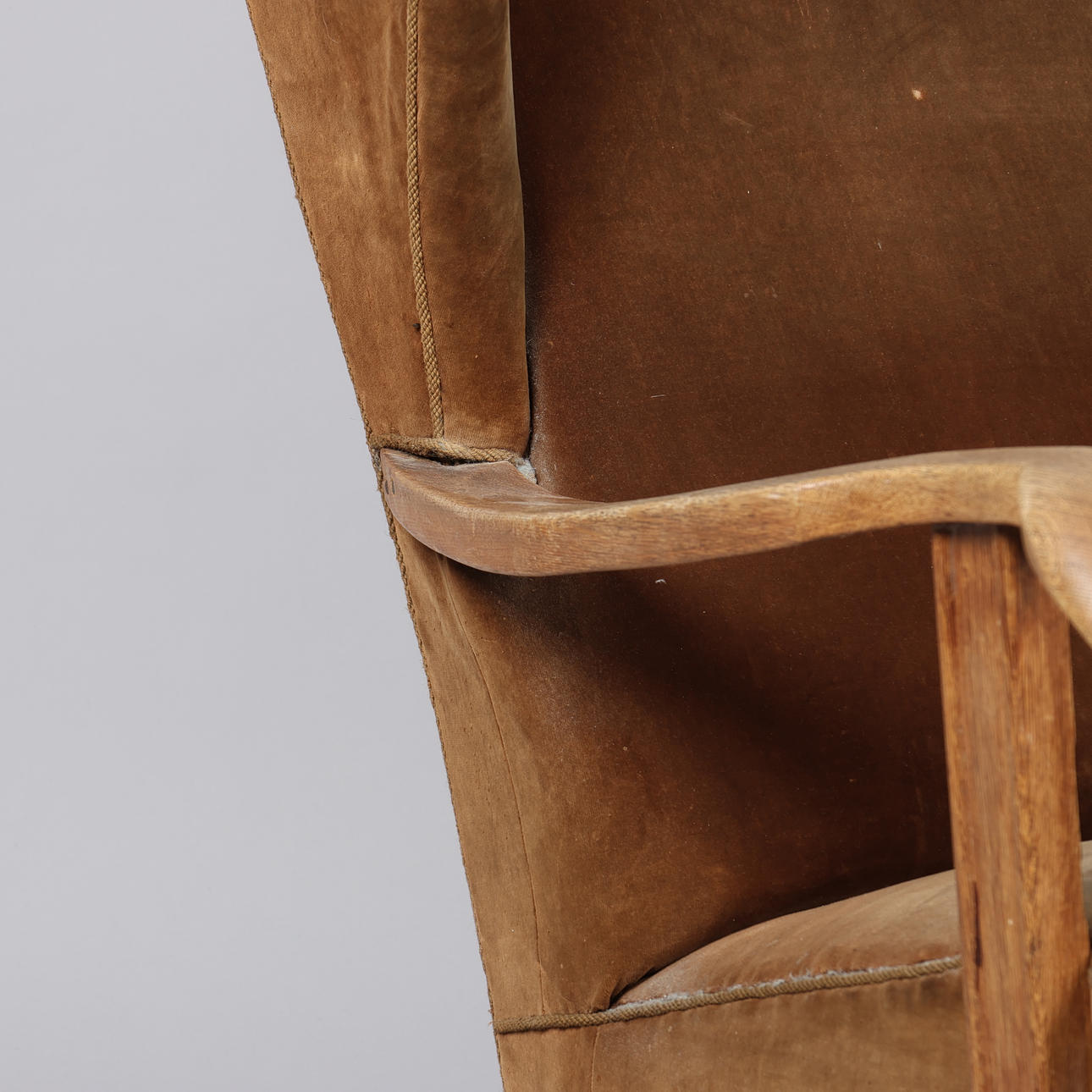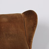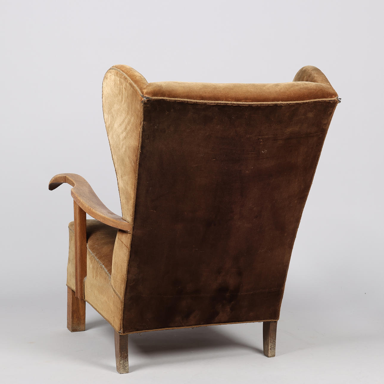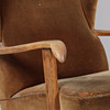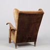 Øreklapstol overpolstret med brunligt velour samt svungne armlæn og ben i massivt egetræ.