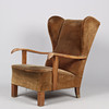 4314681. Øreklapstol/lænestol, velour og egetræ, dansk møbelproducent, Danmark, 1900-tallets midte.