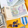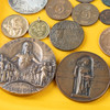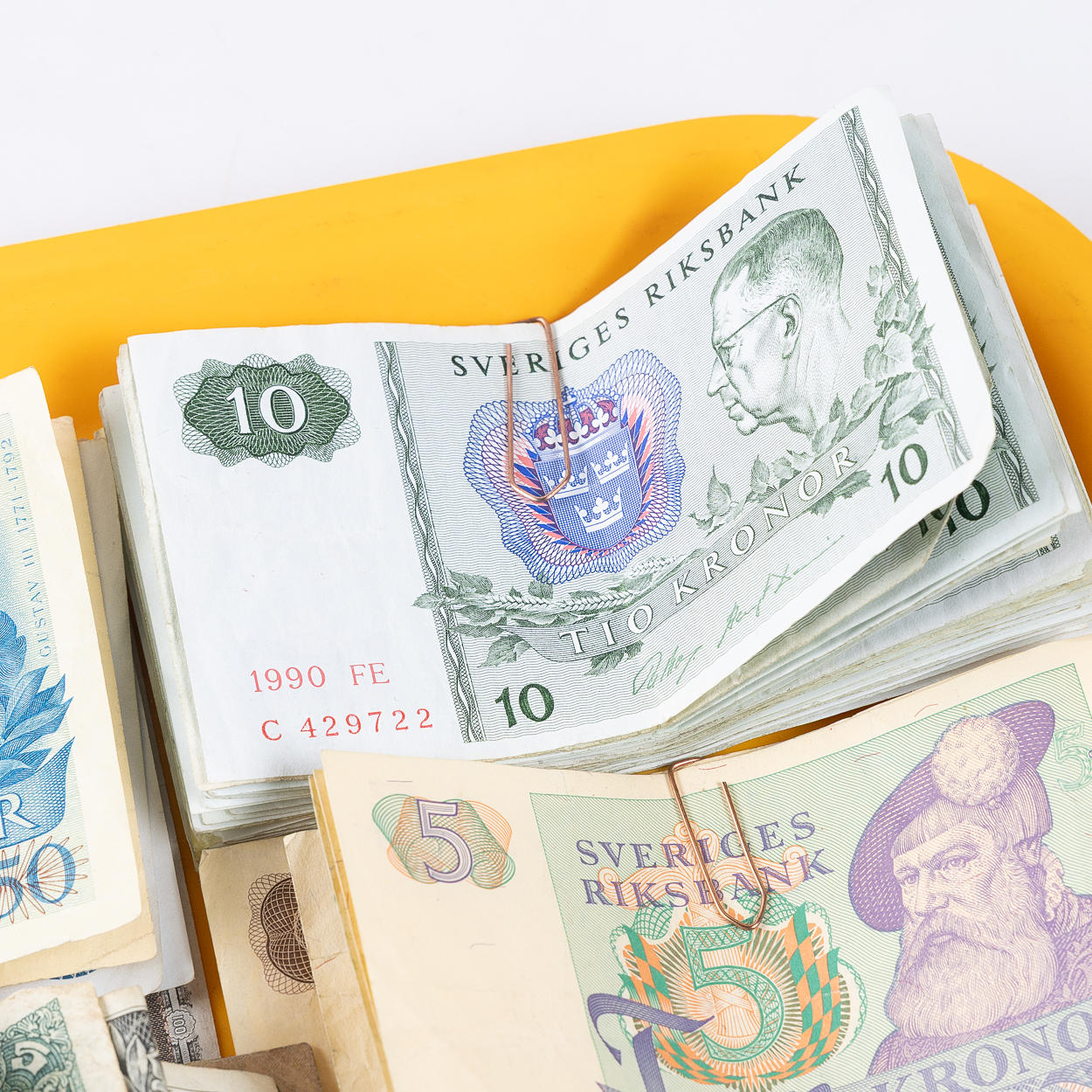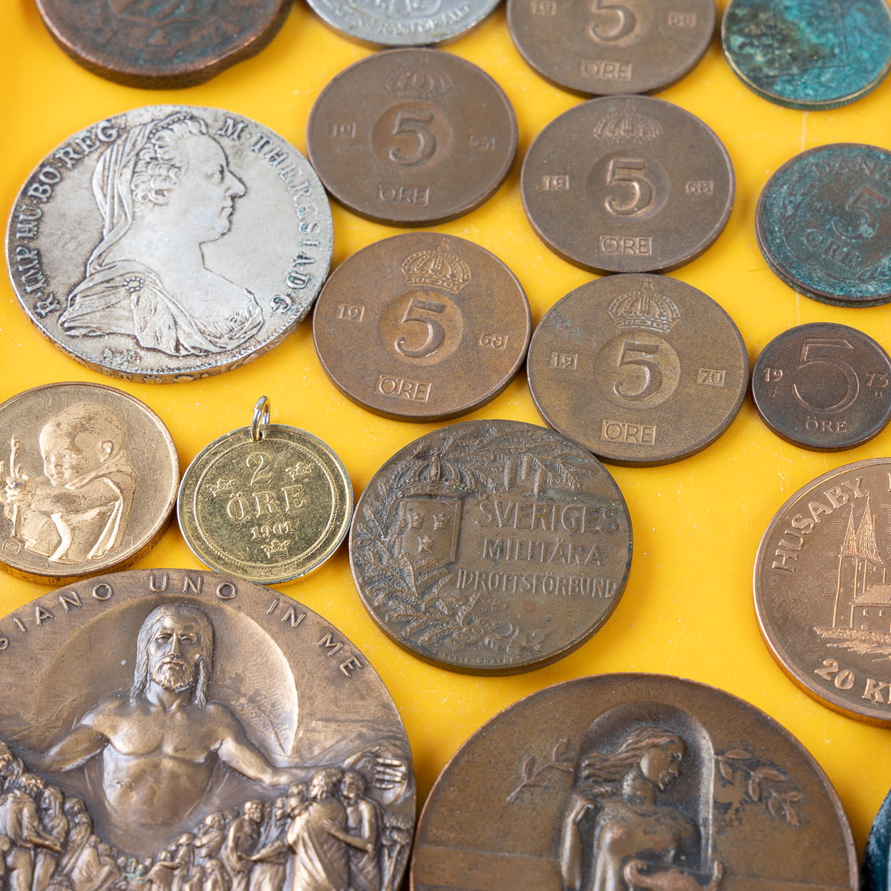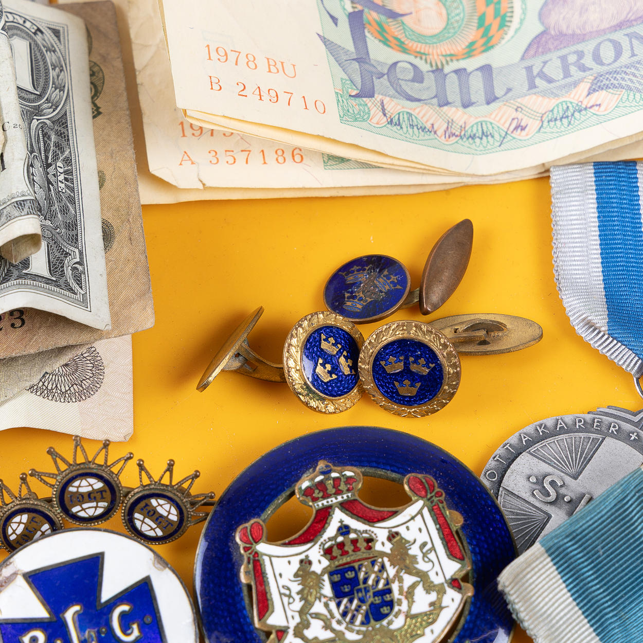 4316709. SAMLING AF MØNTER, PENGESEDLER, BADGES OG MEDALJER.