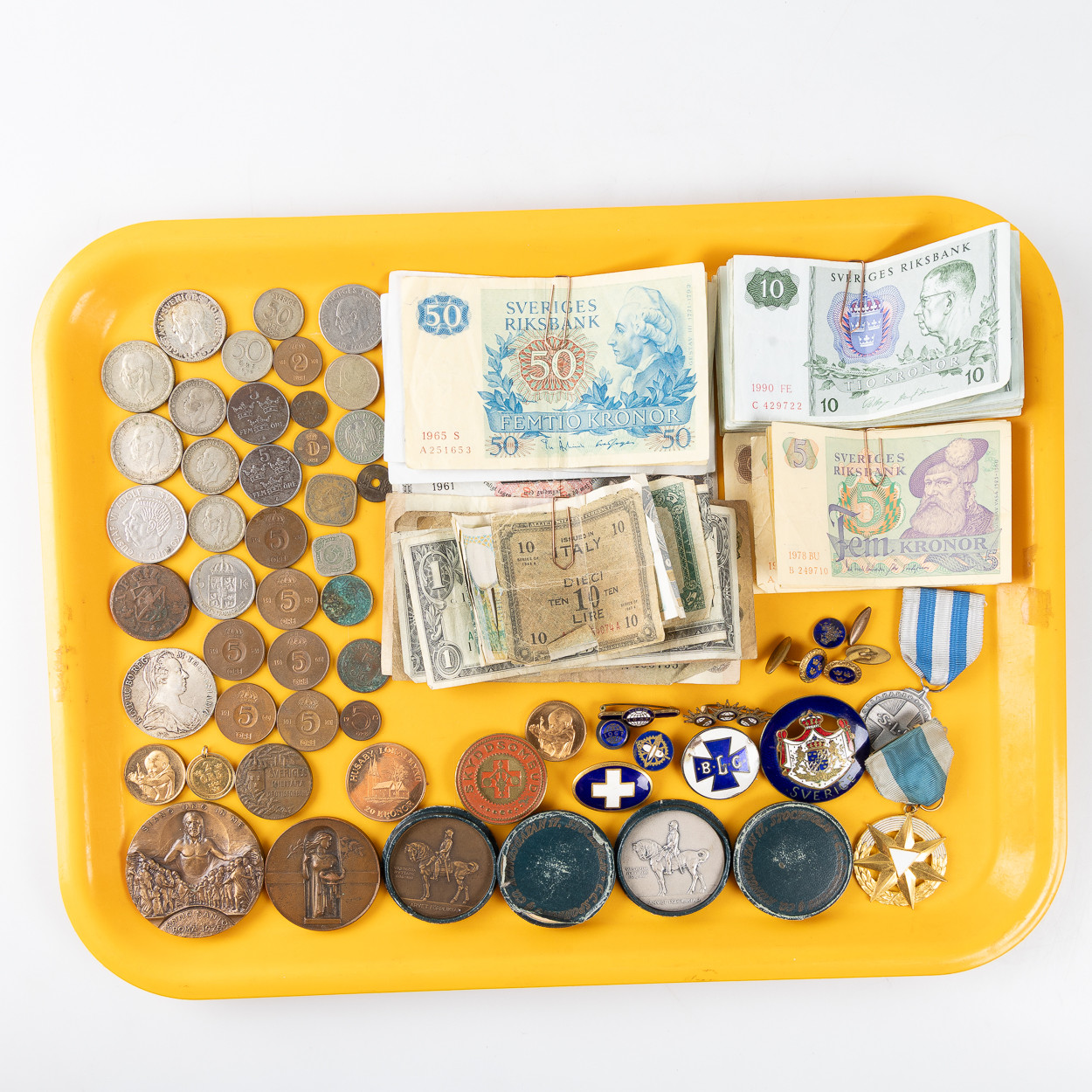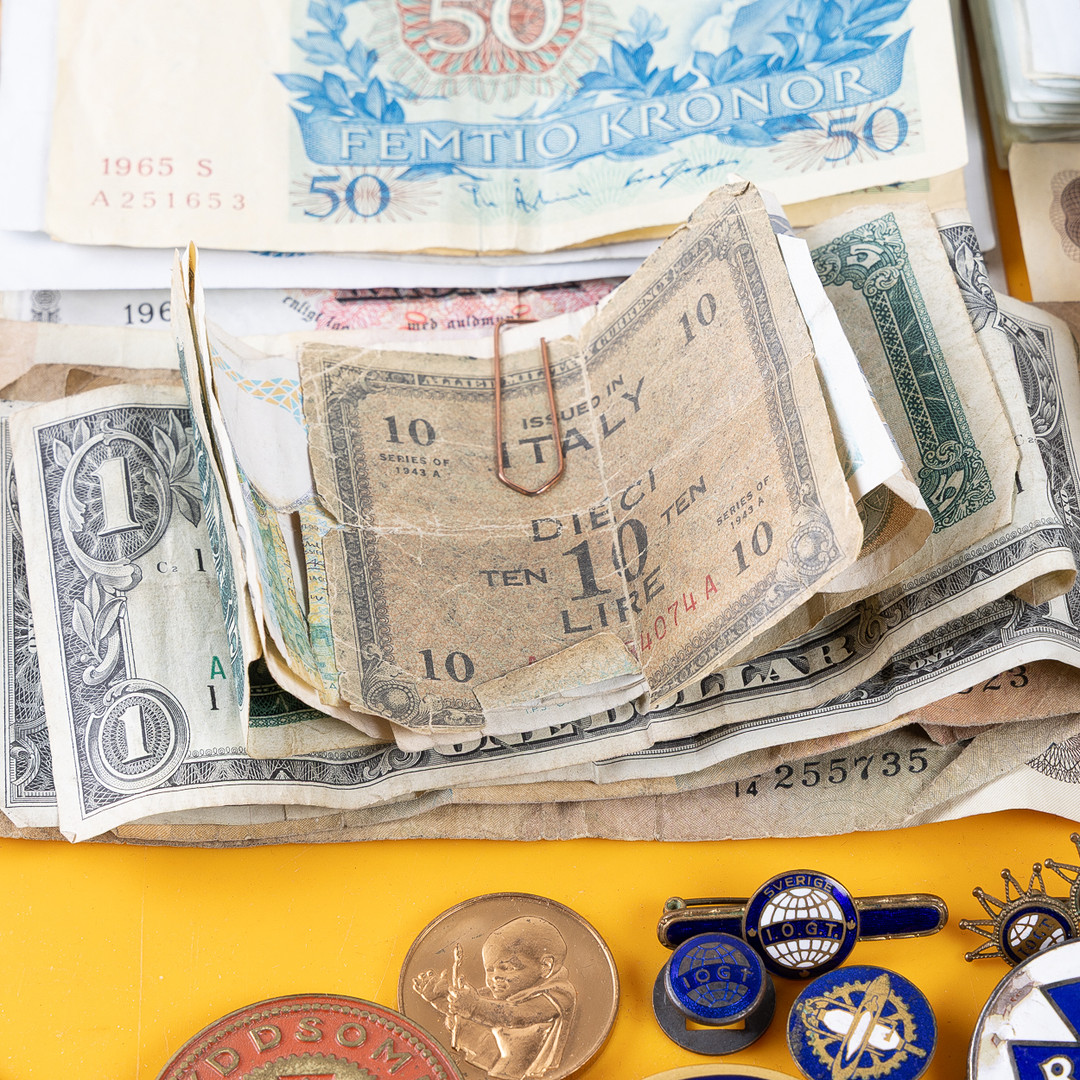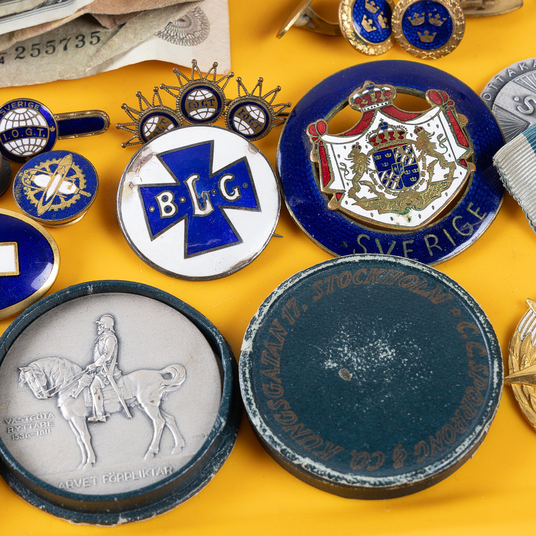 4316709. SAMLING AF MØNTER, PENGESEDLER, BADGES OG MEDALJER.