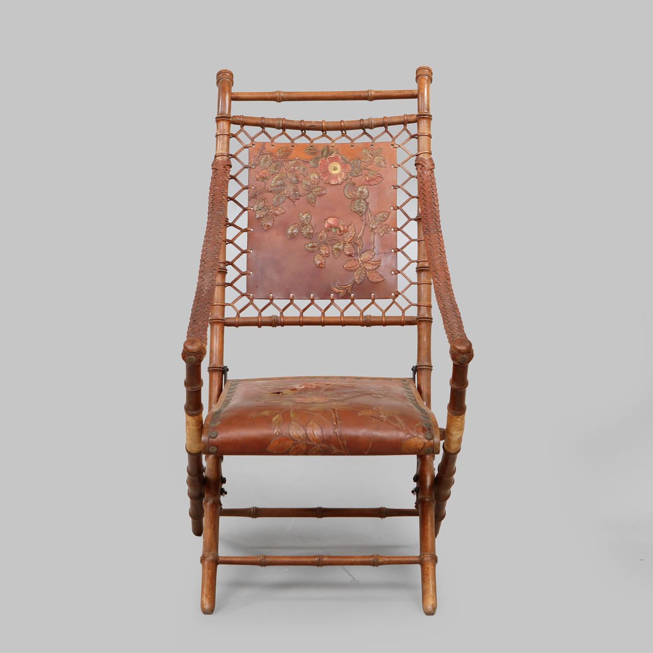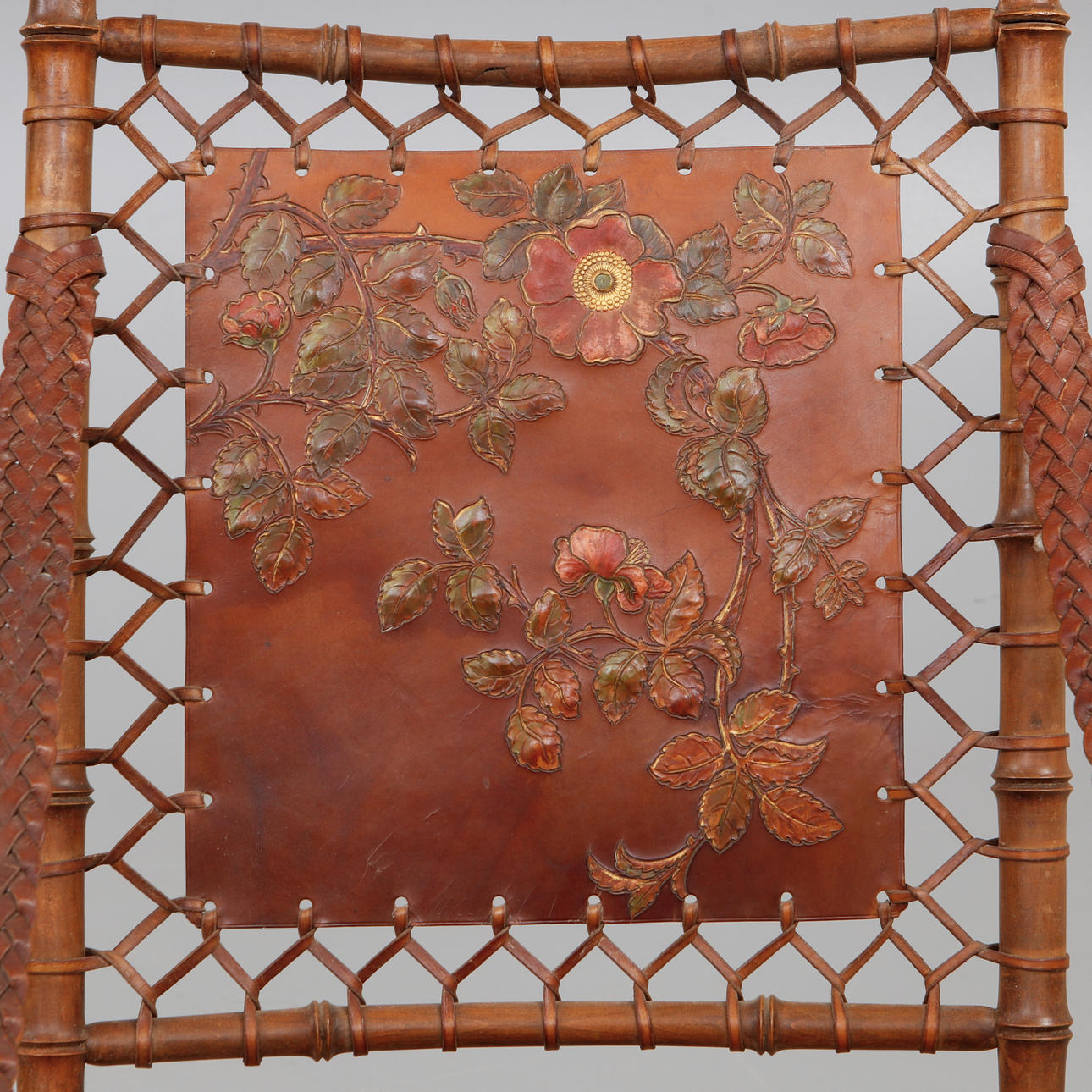 Bambus og læder. Sædehøjde 40 cm, bredde 56, dybde 85, højde 100 cm.