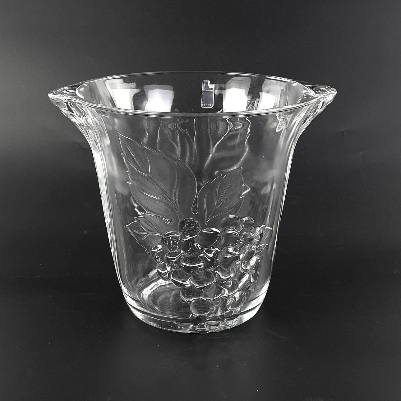 Vinkøler i glas med dekoration i relief af vinstokke. Mærket „Crescendo, Frankrig“.