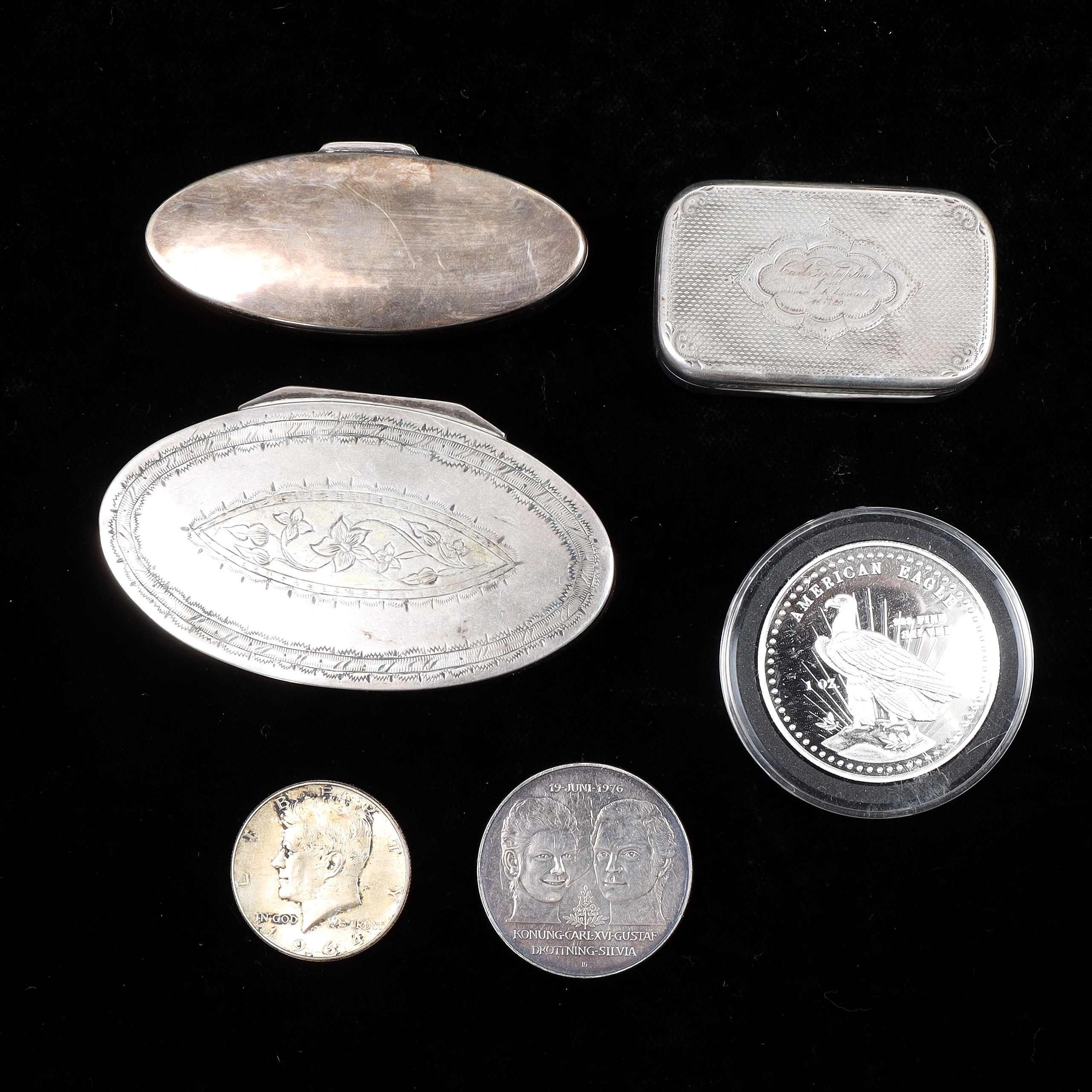 4322178. SØLVGENSTANDE, 7 stk, sølv, vægt 284 gram.