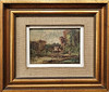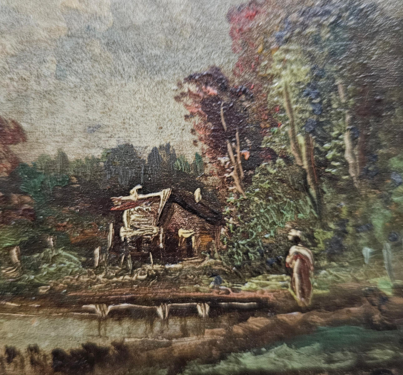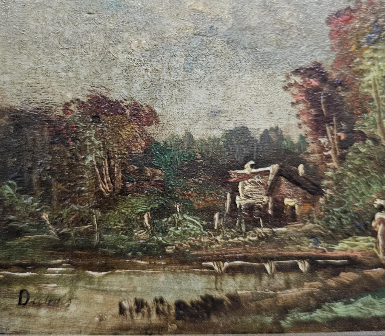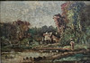 DAMLANDSKAB. OLIE PÅ LÆRRED. ULÆSELIG UNDERSKRIFT.