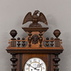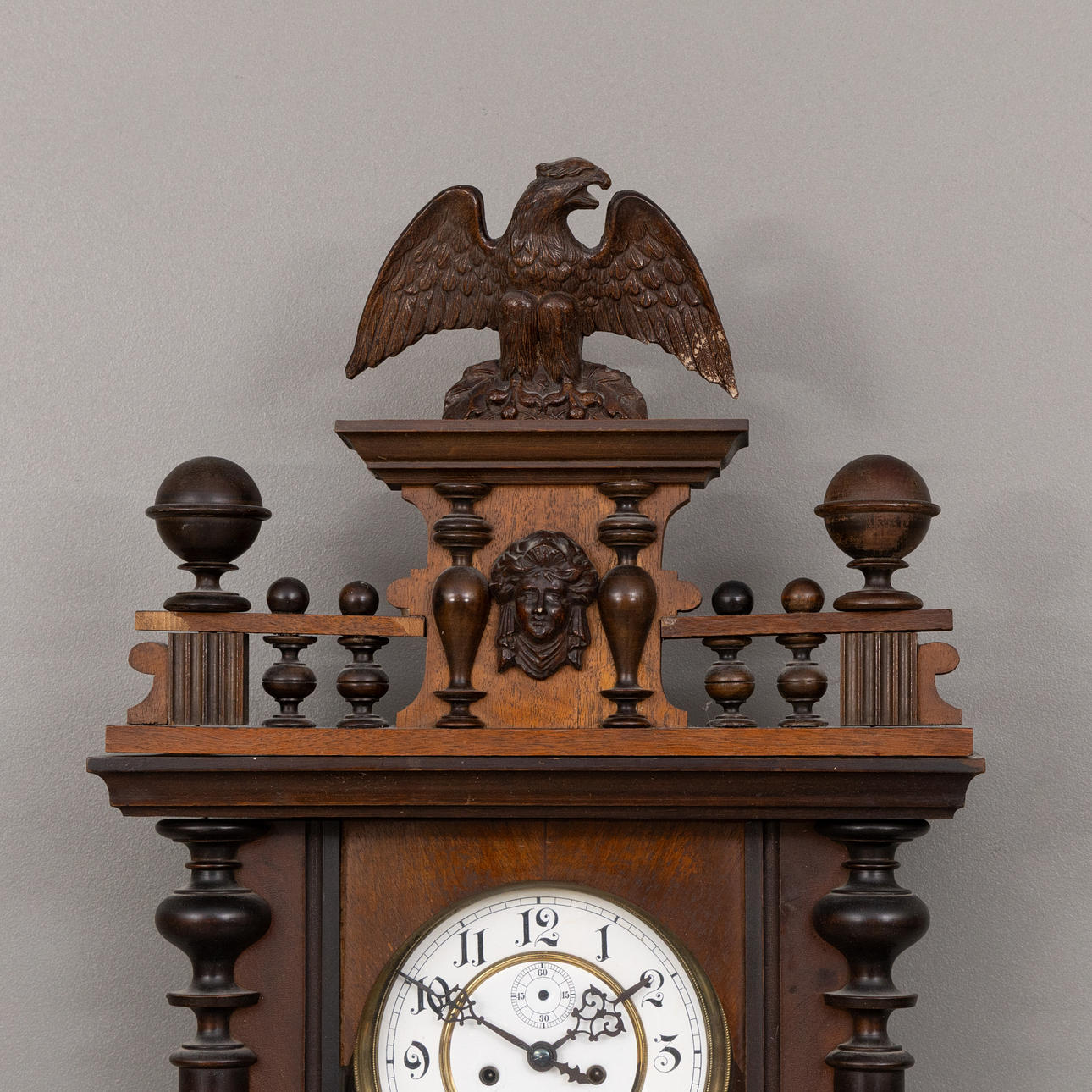 Vægur, træskab med drejede dekorelementer kronet med ørnerelief.