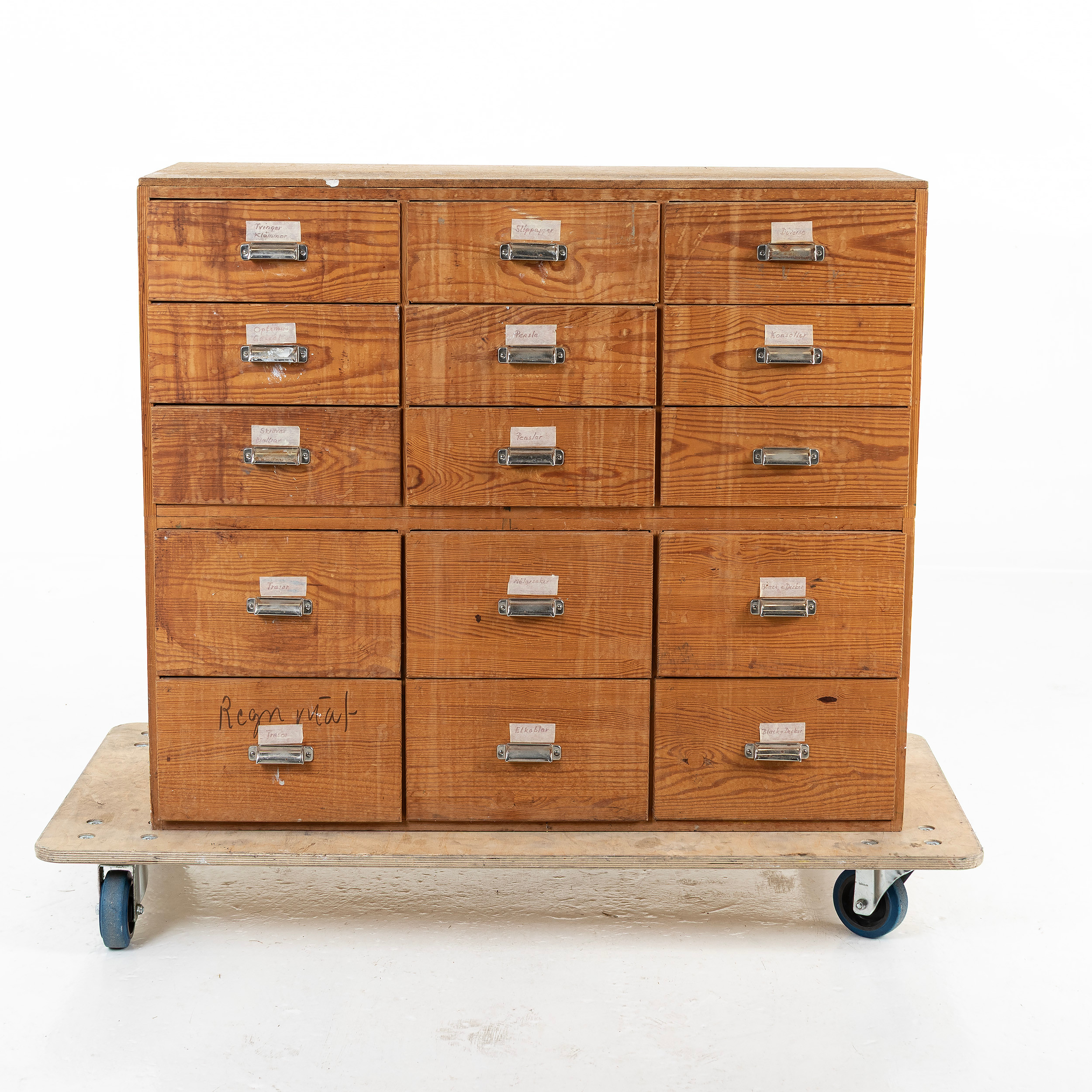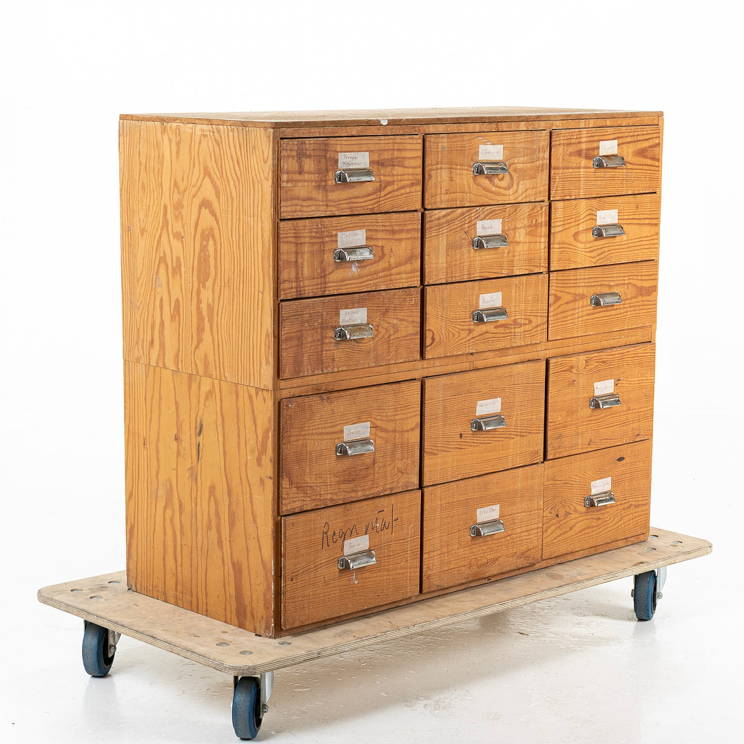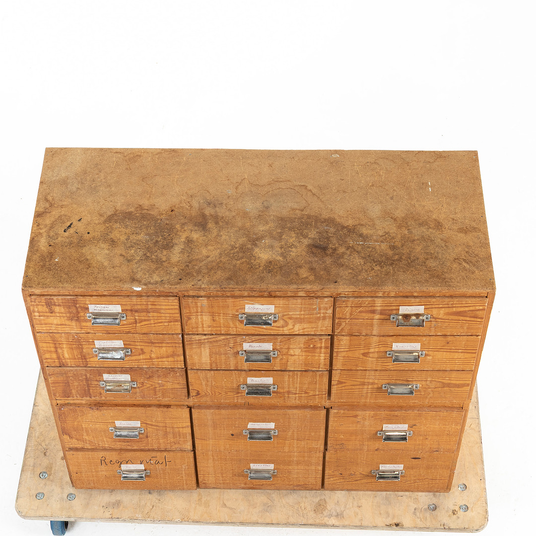 4328059. KØBMANDSDISK, med 15 skuffer.
