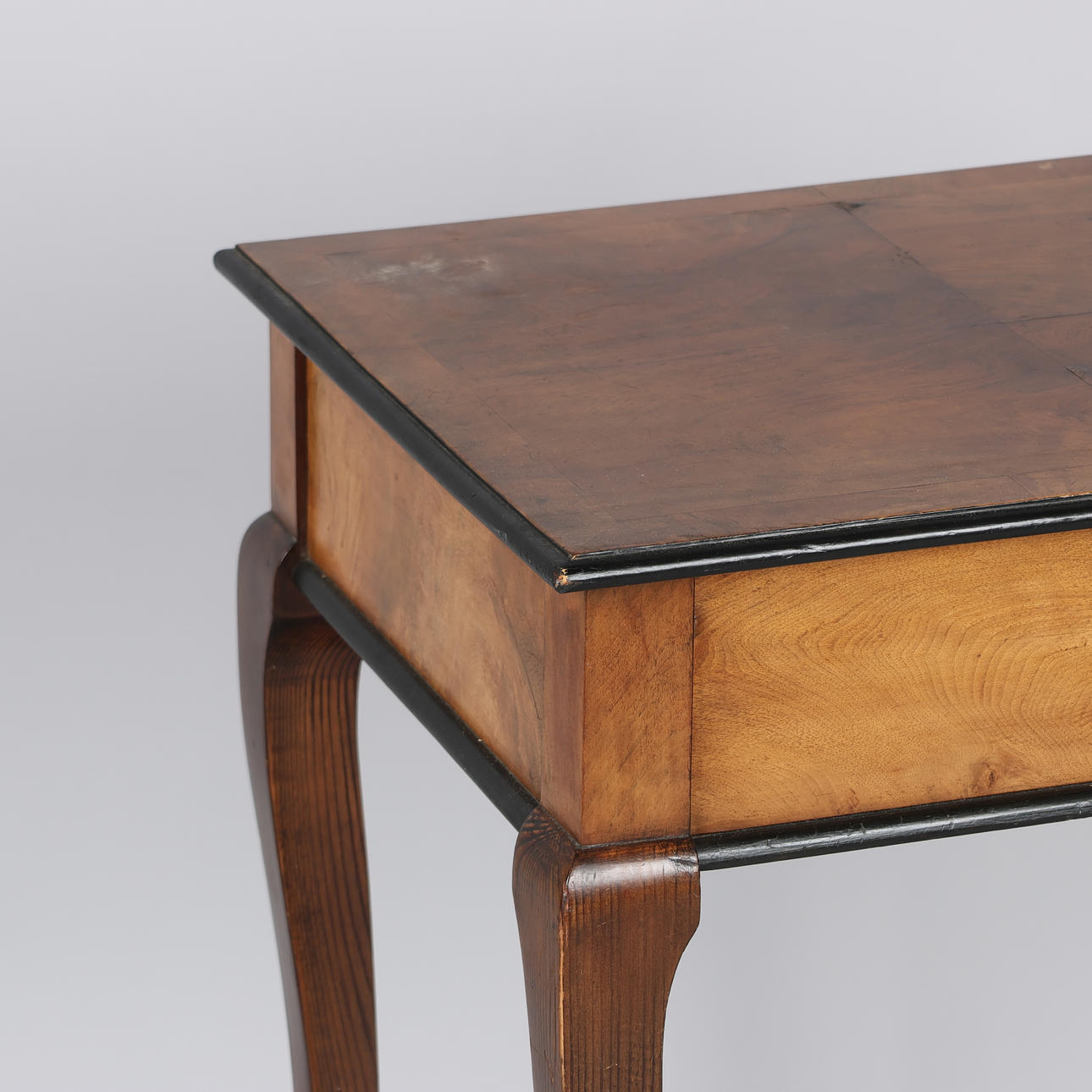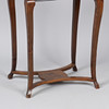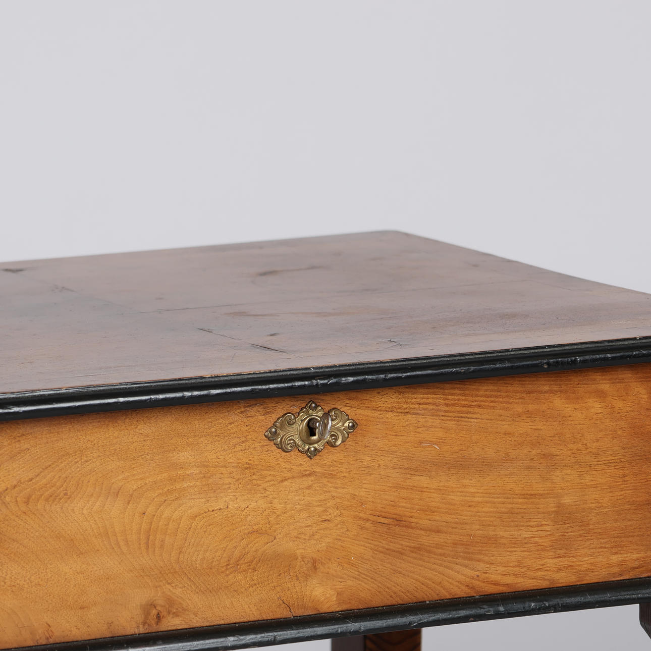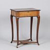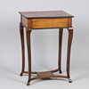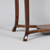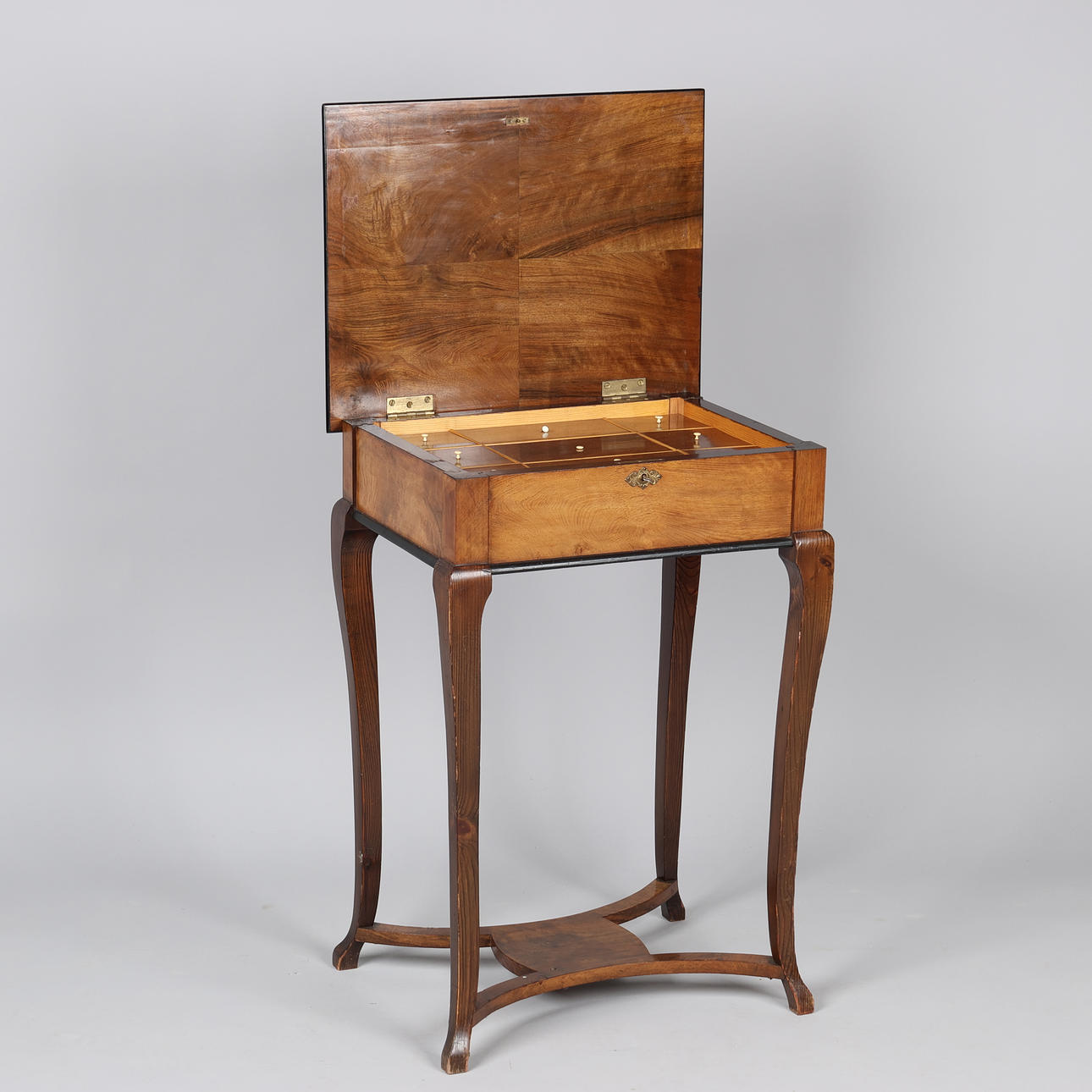 Sybord af mahogni med opklappelige top med rum underneden. Stel med svungende ben.