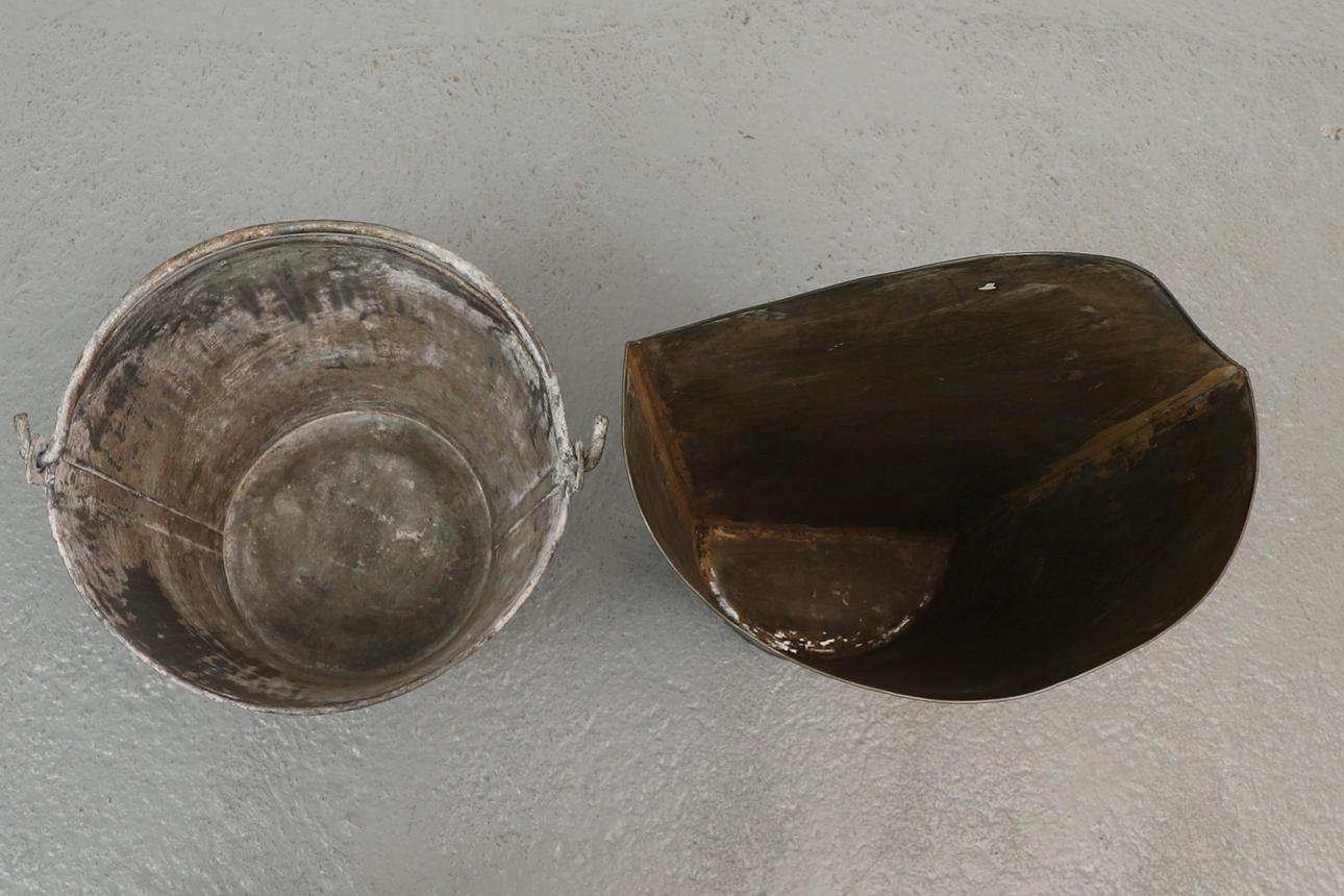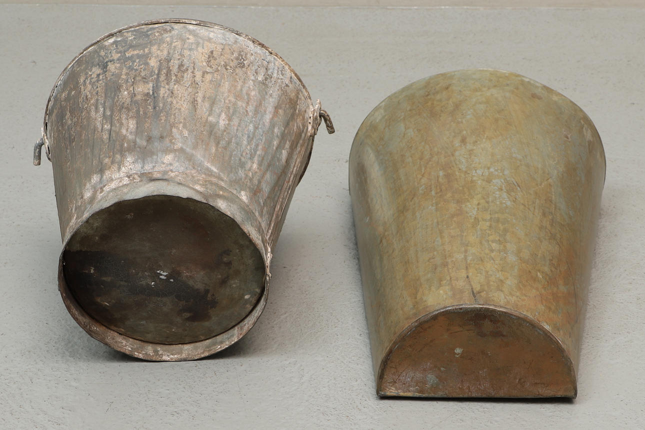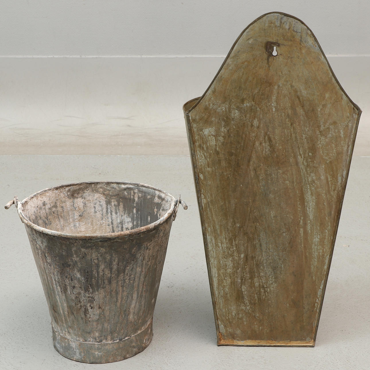 Zinkspænde, højde ca. 33 cm, diam. øvre kant ca. 32 cm.