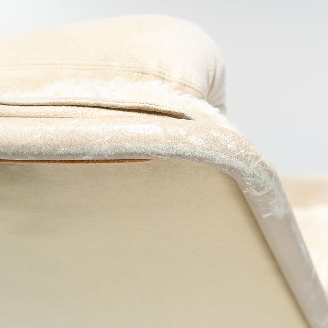 Beige ruskindsbetræk, med læderbeklædning og lærredstof. Aftagelig nakkepude med læderrem