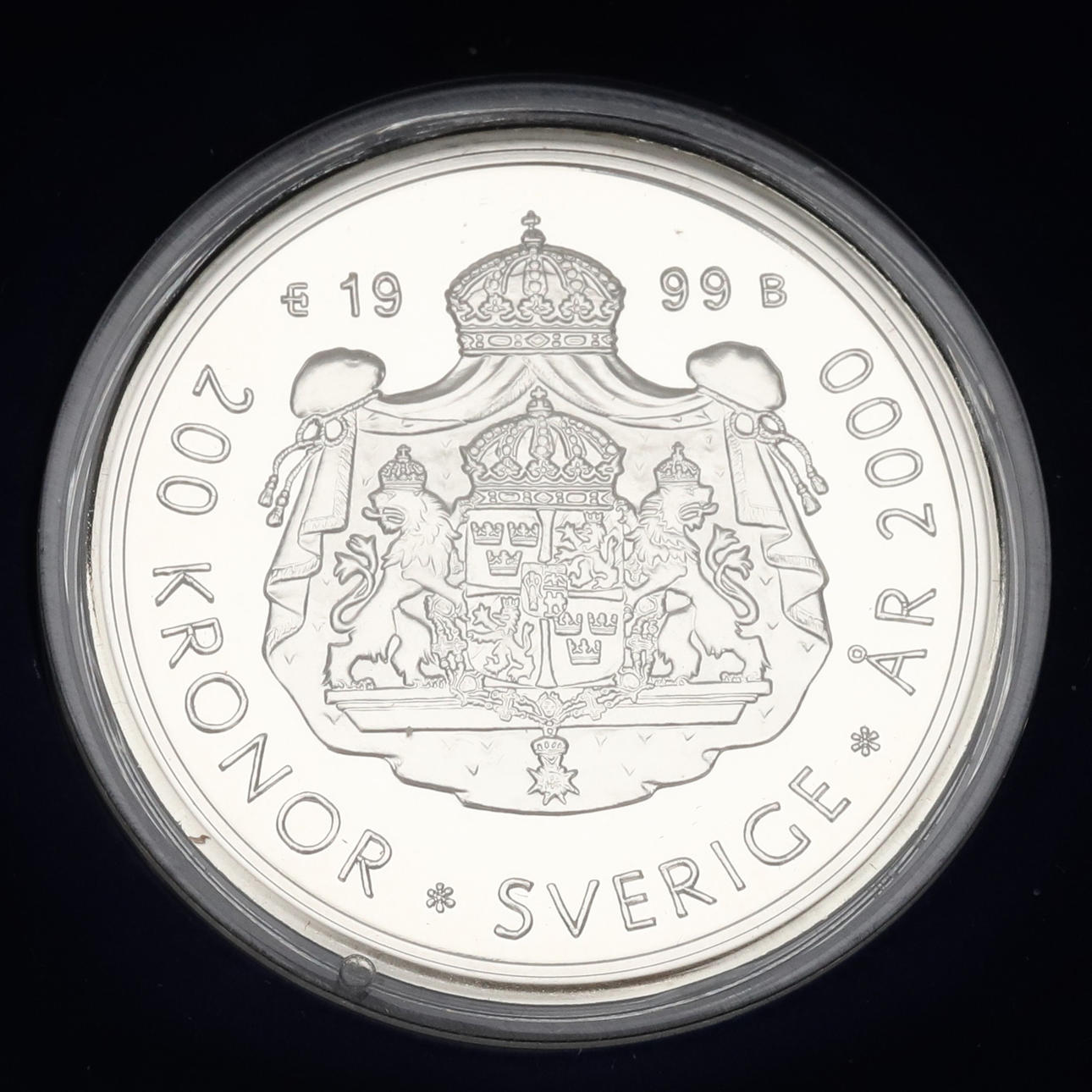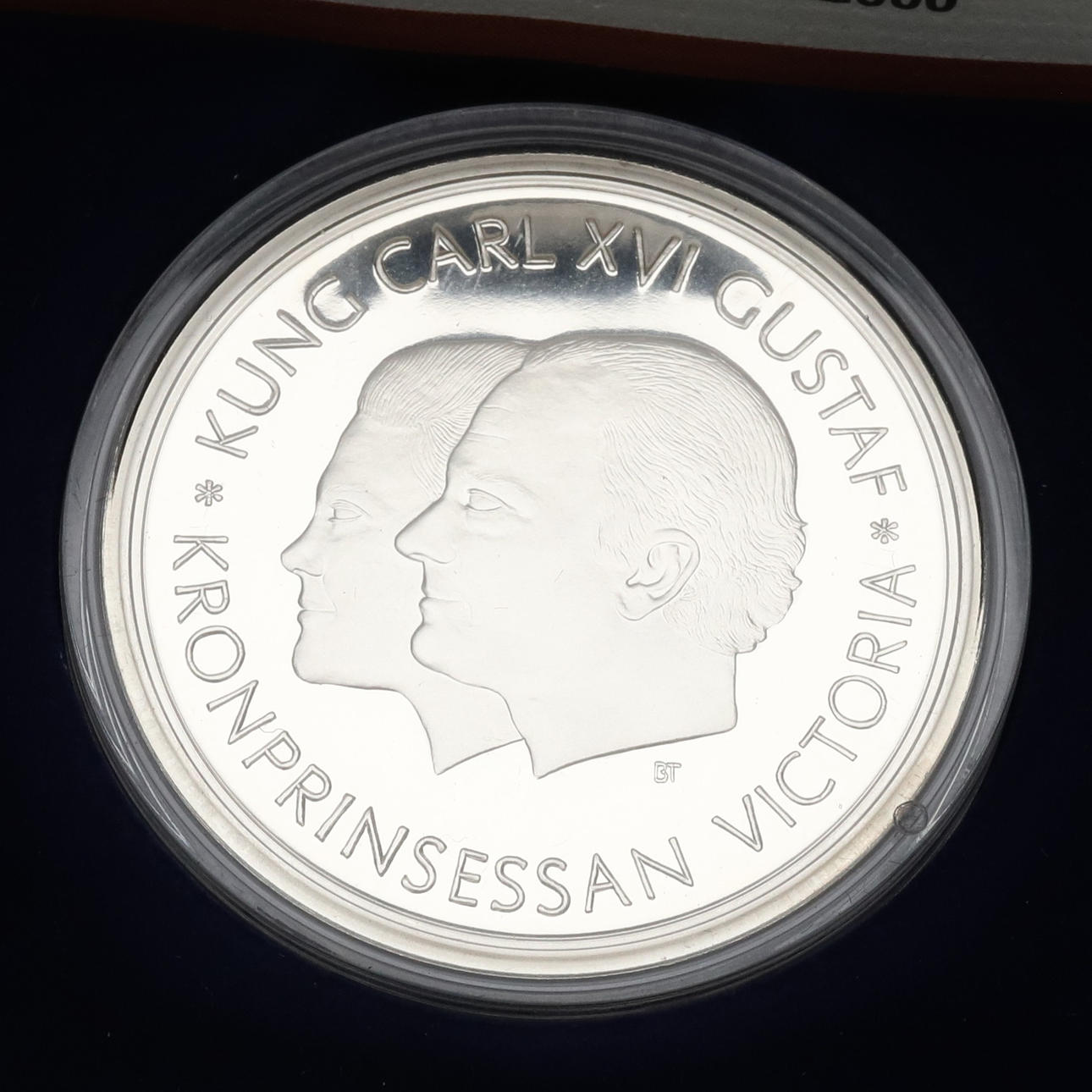 Erindringsmønter Kong Carl XVI Gustaf & Kronprinsesse Victoria. 925 sølv, vægt 27,03 gram, pålydende værdi 200 kr.