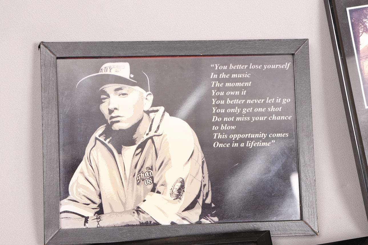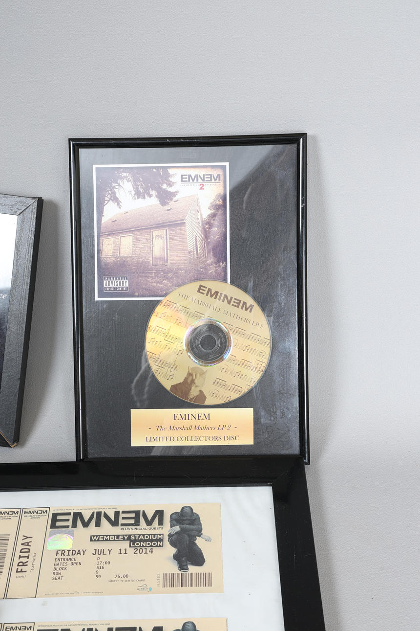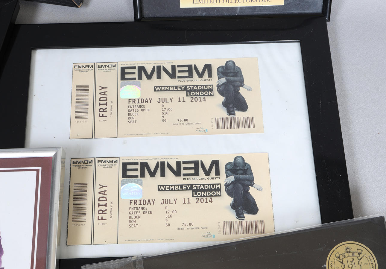 Indrammede genstande, der inkluderer to billetter til hans show på Wembley Stadium (11. juli 2014), cd-montager til Recovery (med faksimile-signatur) og The Marshall Mathers LP 2 (Limited Collectors Disc), en yderligere gengivelse af 'guld' CD (med trykt signatur) og et Eminem-tryk med citat fra hans ikoniske nummer 'Lose Yourself' sammen med en 'Time Art' plade, den største vare måler 36 cm x 31 cm cm inklusive ramme. (6).